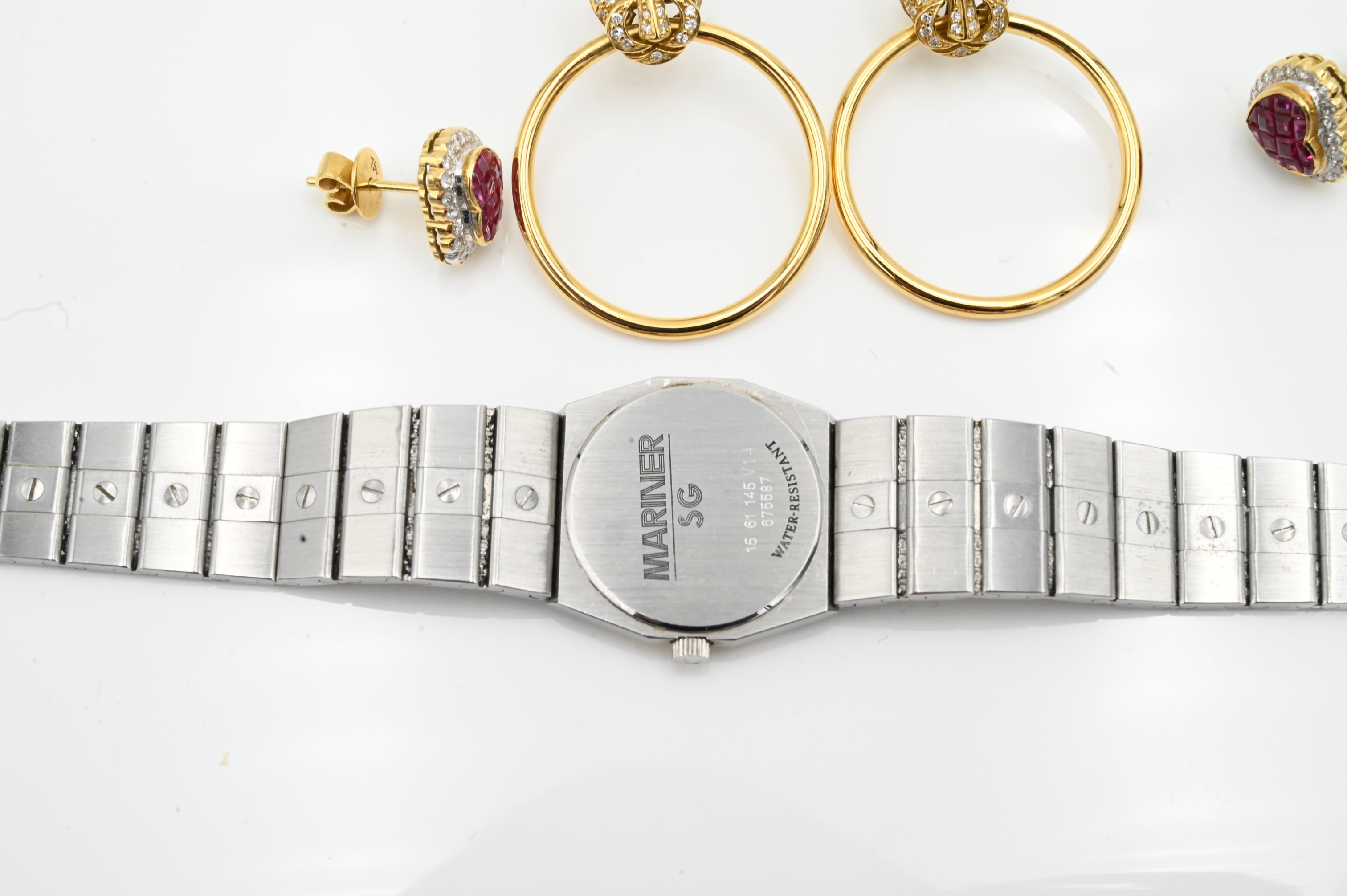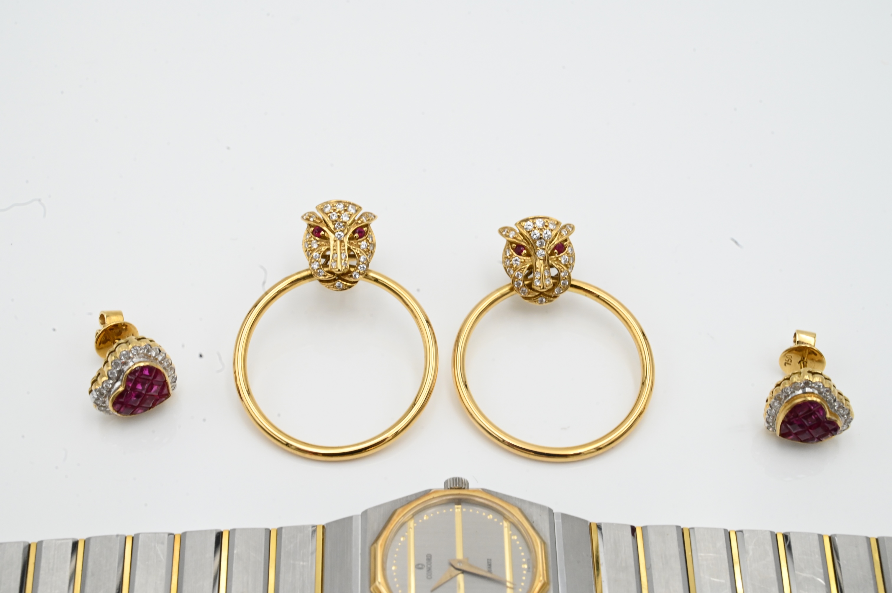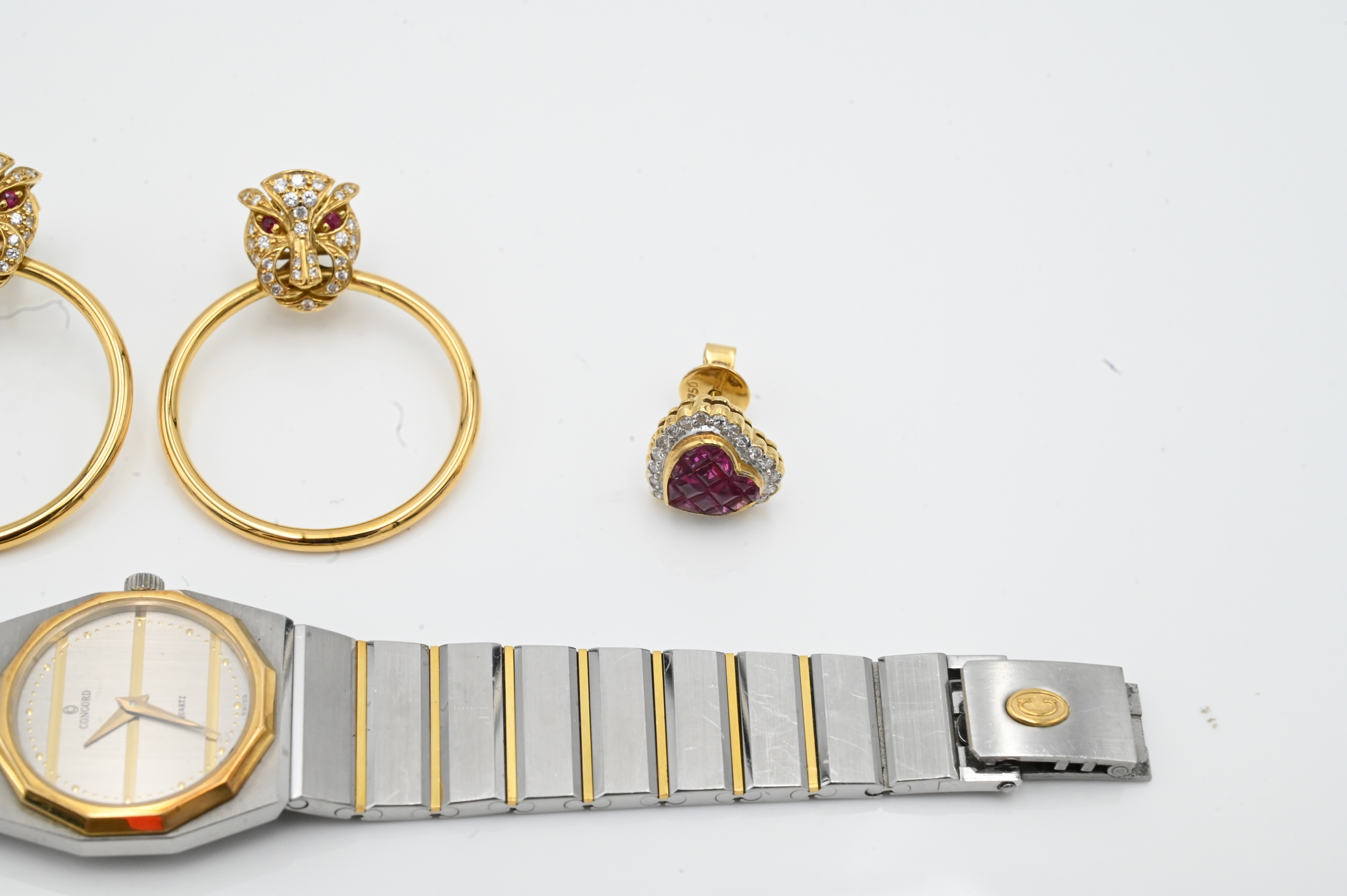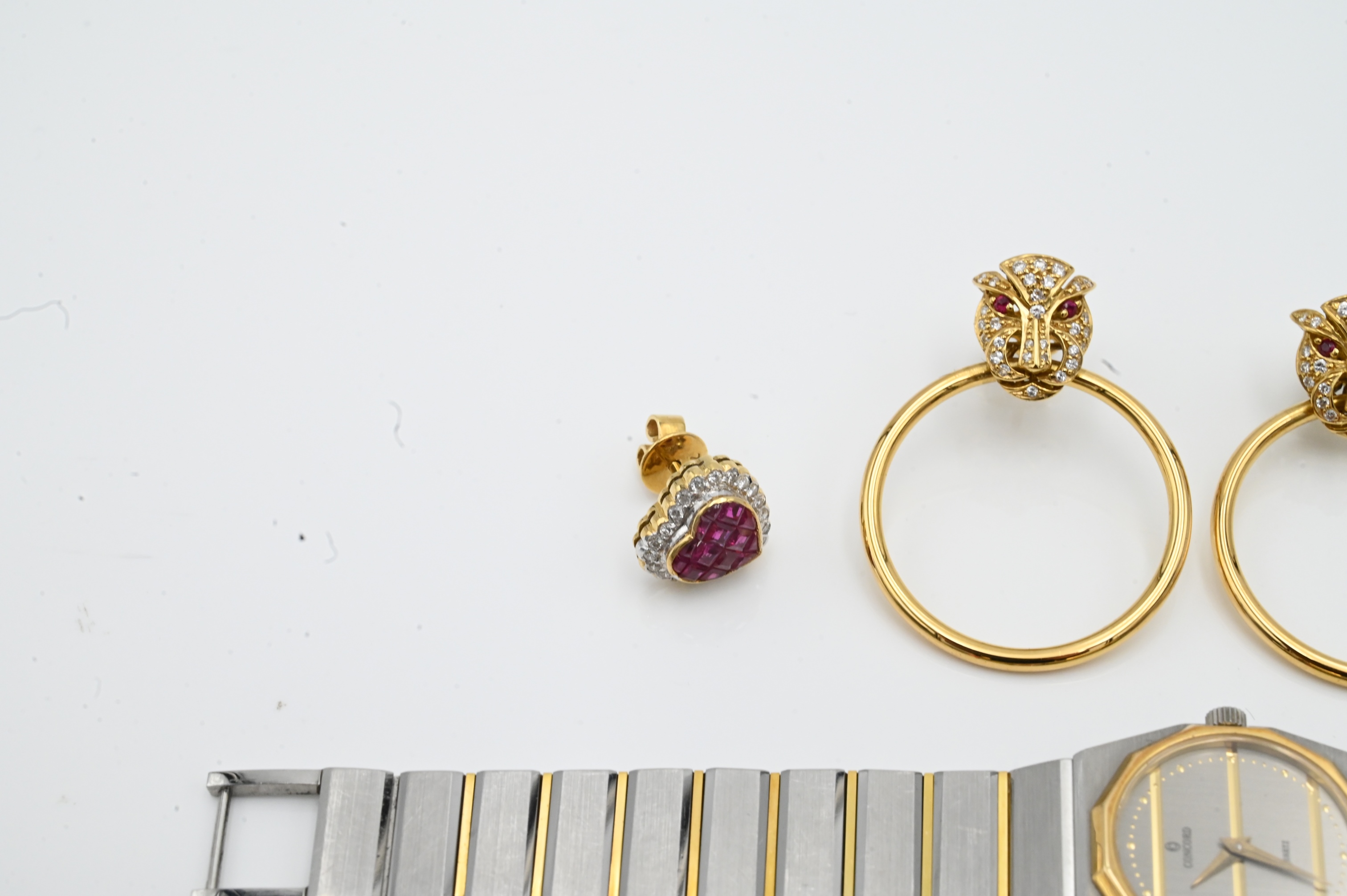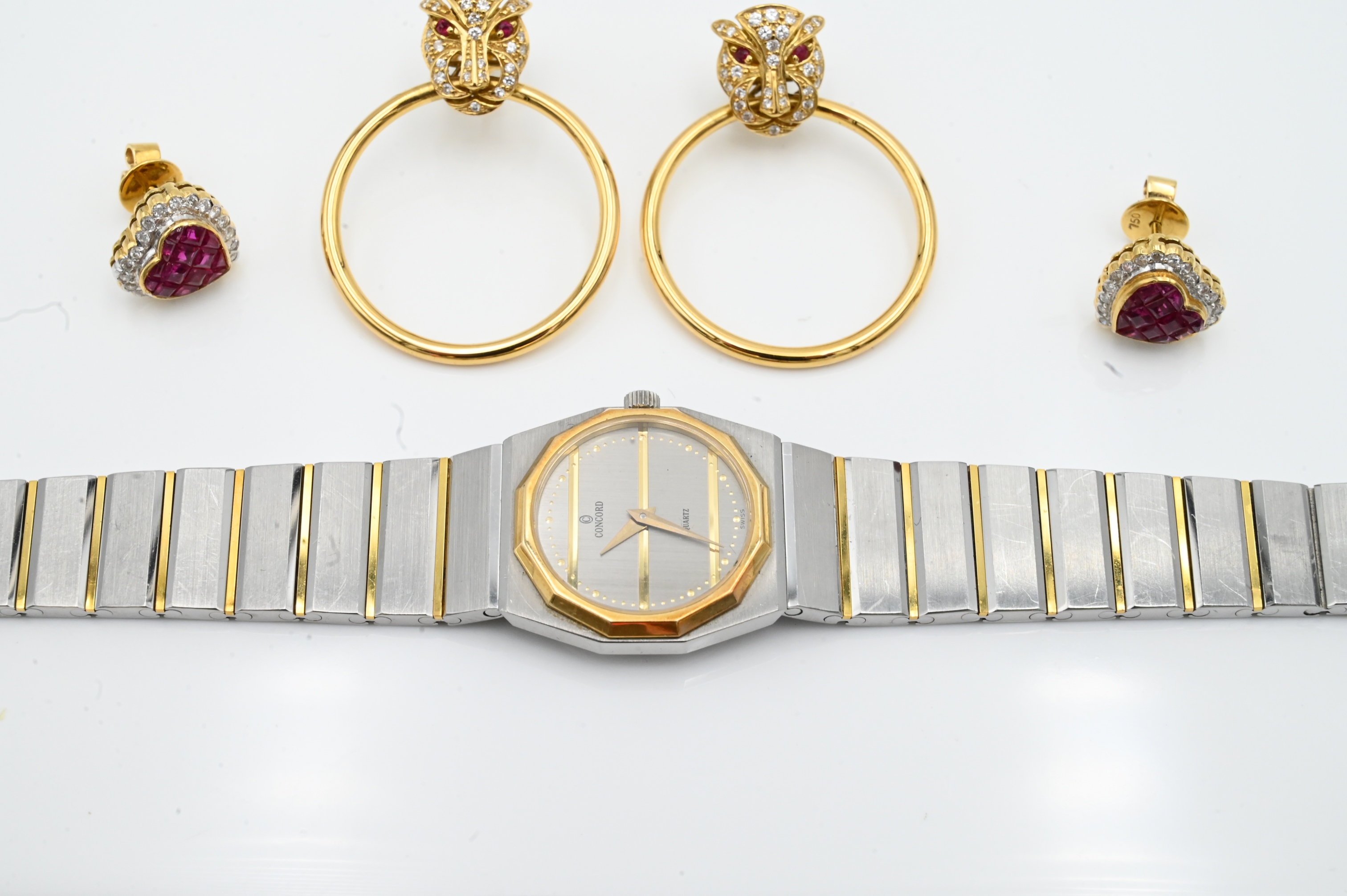 Two Pairs of Yellow Gold Pierced Earrings, to include 14 and 18 karat, each set with small diamonds and red stones, along with a Concord wristwatch, total weight 13.8 grams.