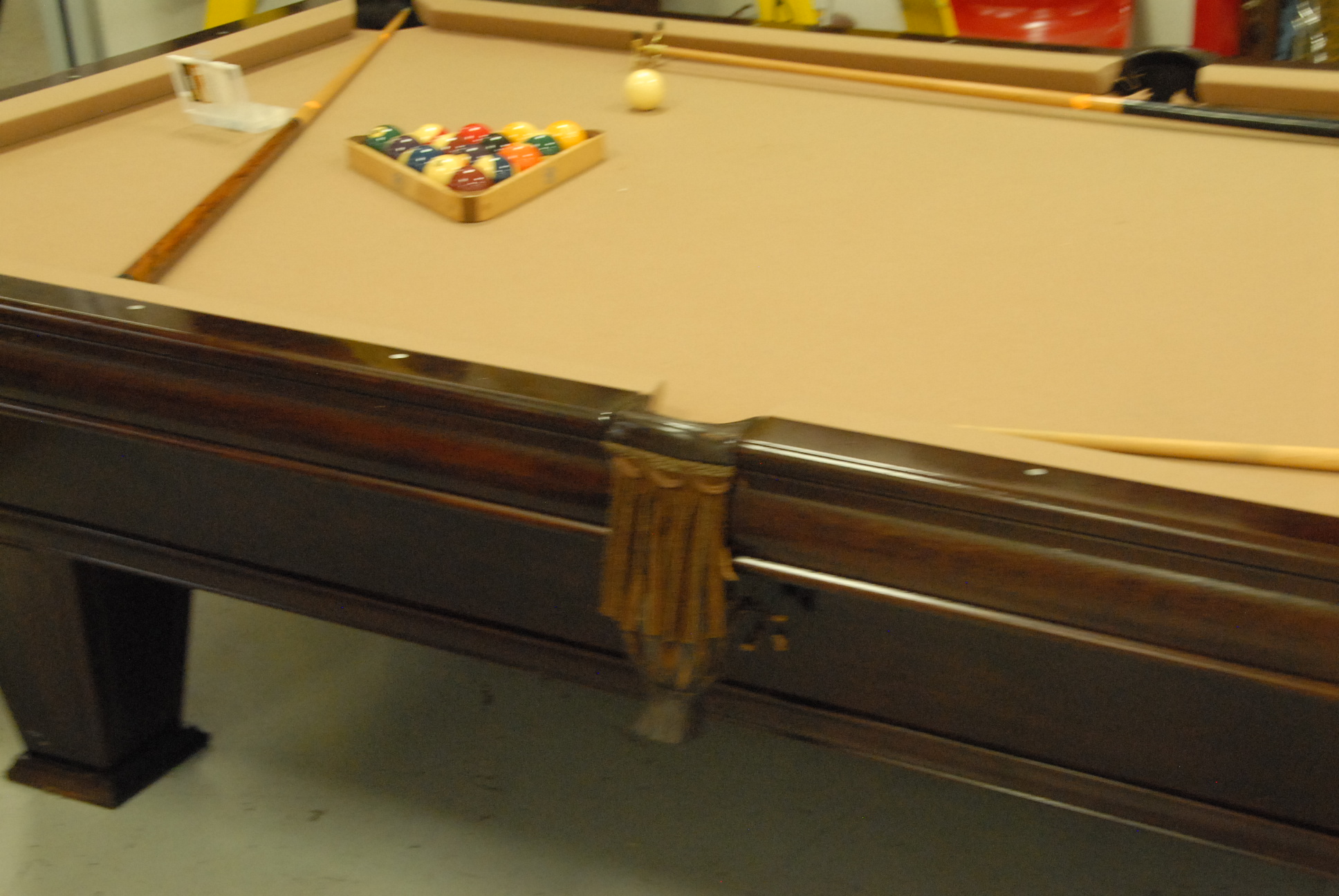 Brunswick Ventura 9ft. pool table with tan cloth and leather pockets with wall mounted counter.