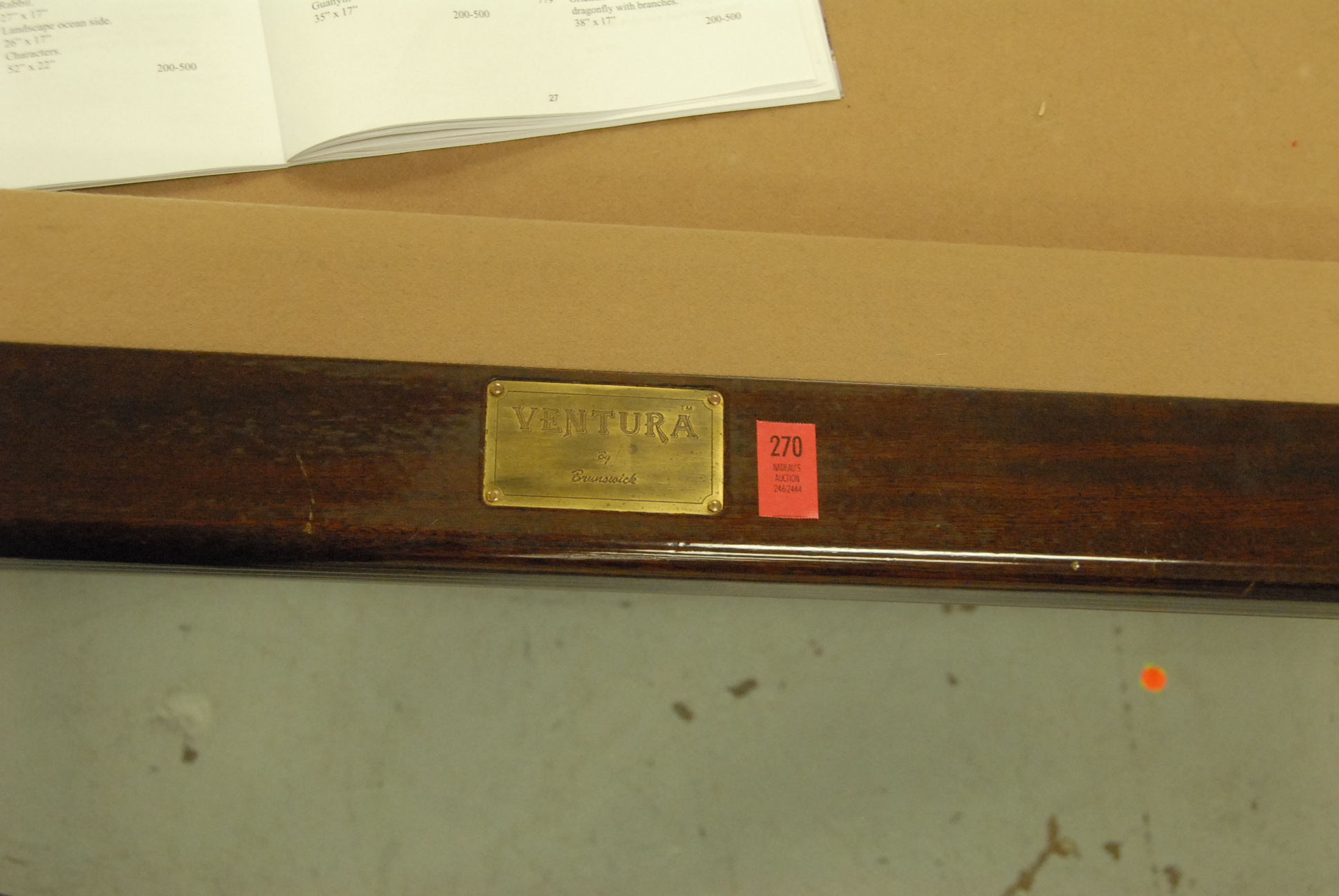 Lot 270: Brunswick Ventura 9ft. pool table with tan cloth and leather pockets with wall mounted counter.