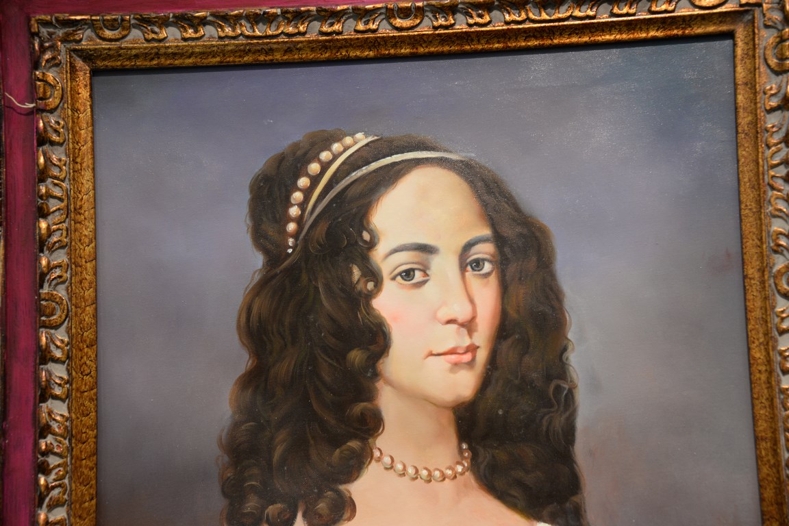 Contemporary oil on canvas portrait of a woman in a purple dress, unsigned, 24 x 20.