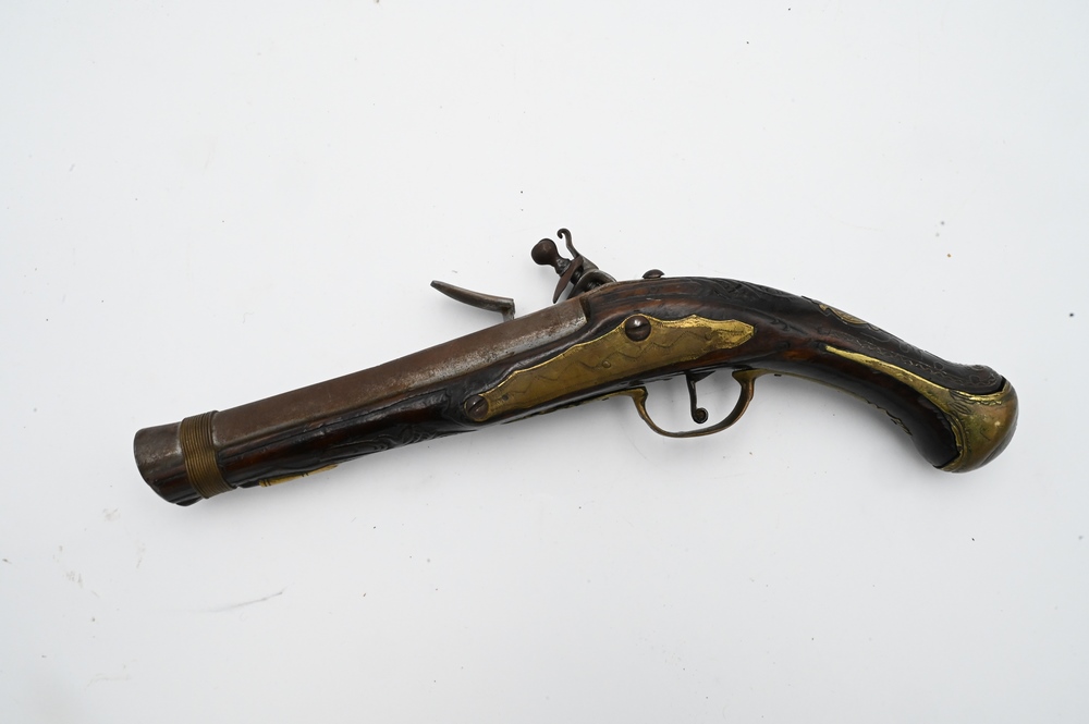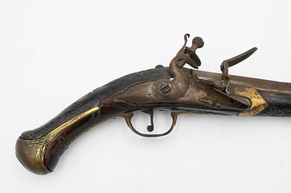 Lot 270: Early Flintlock Pistol, 18th century or later, having carved wood hand, with silver inlays and brass mounts, length 13 inches.
