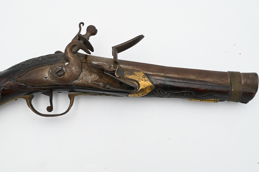 Early Flintlock Pistol, 18th century or later, having carved wood hand, with silver inlays and brass mounts, length 13 inches.