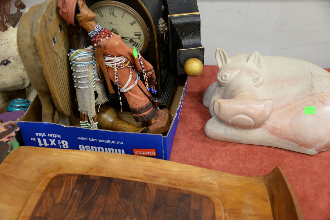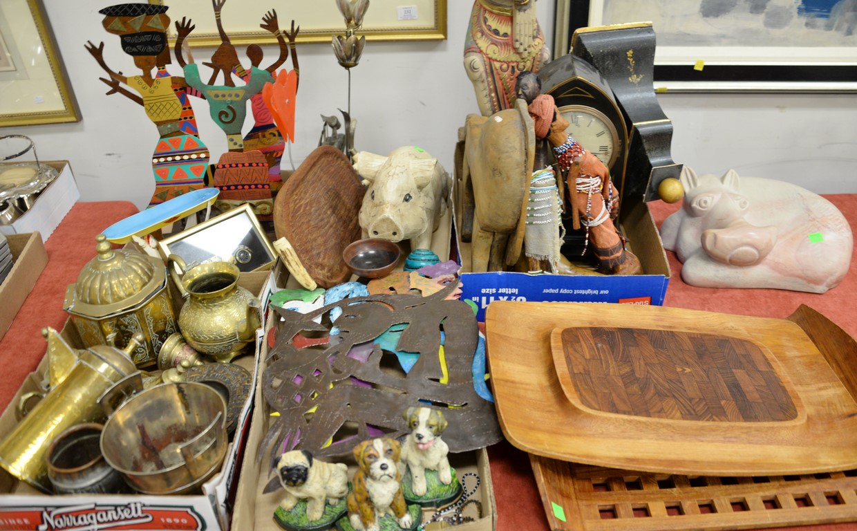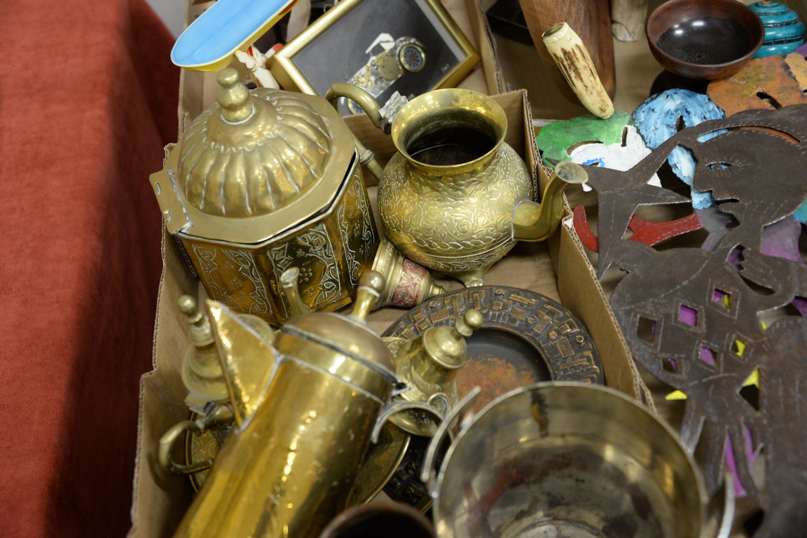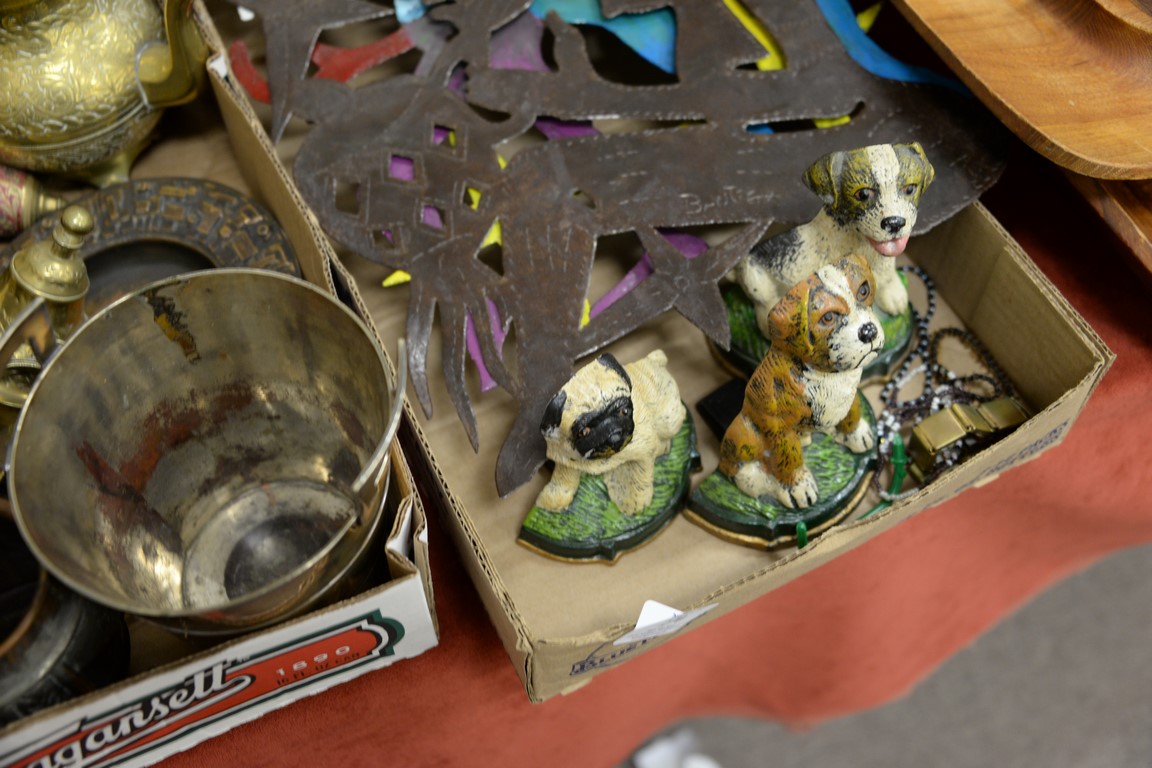 Five box lots to include a group of four sheet metal painted African figures signed illegibly, two sheet metal figures signed Bruticiy, airadelsur tray, brass pots, three iron dogs, spoon with bee art sculpture marked Tunica GDA 1972, heart glass and metal sculpture, and copper figural sculpture signed on base illegibly Dansk tray.