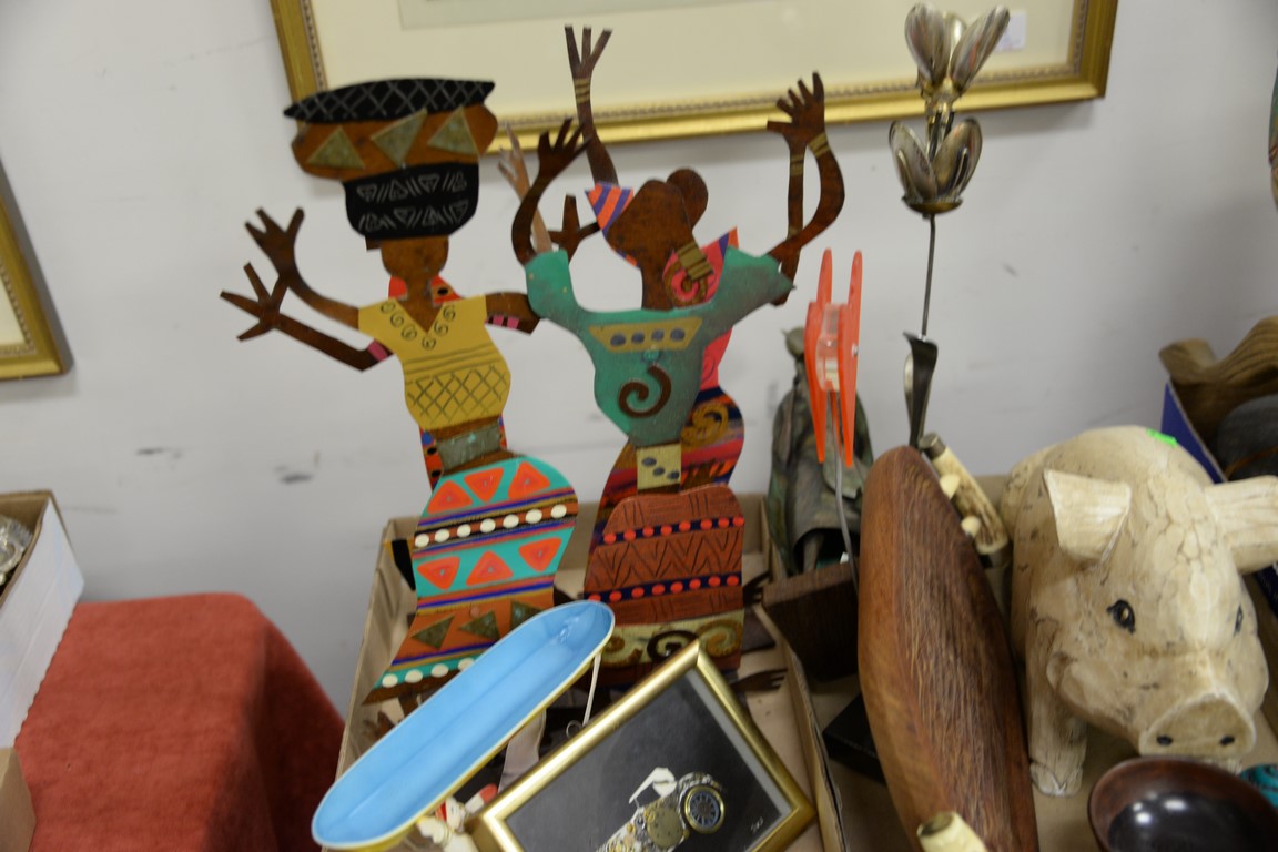 Lot 270: Five box lots to include a group of four sheet metal painted African figures signed illegibly, two sheet metal figures signed Brutic…