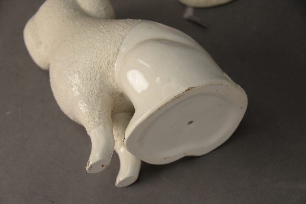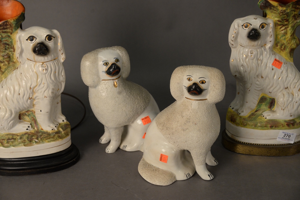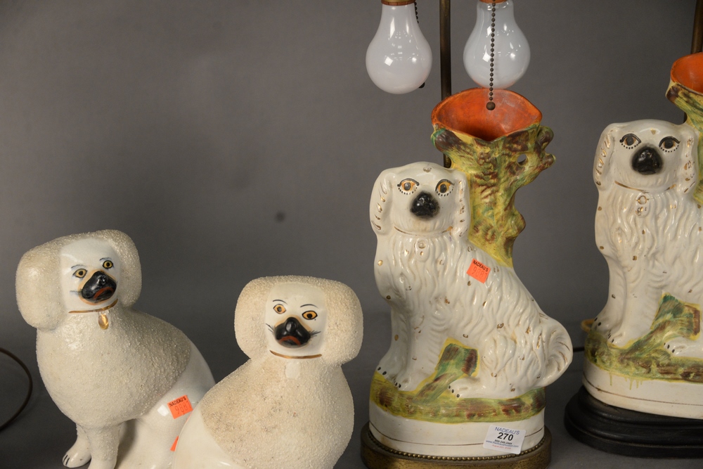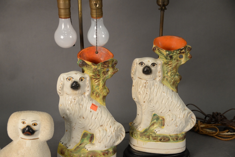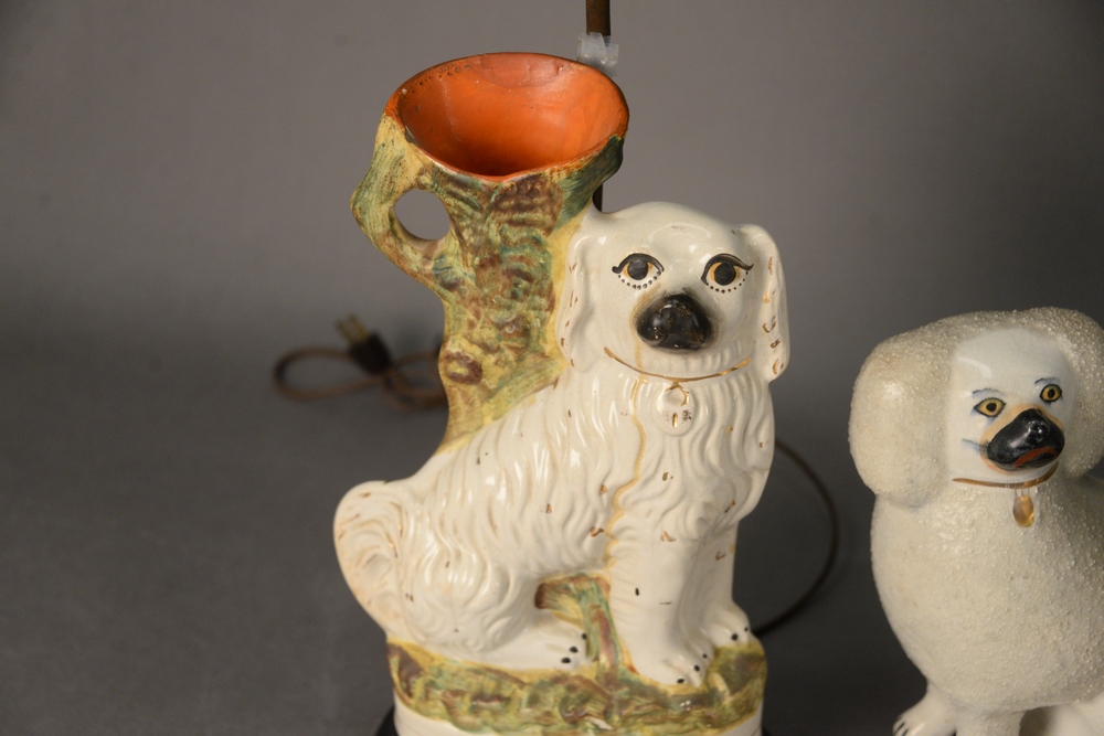 Five Piece Staffordshire Group, to include three table lamps in the form of King Charles Spaniel vases; along with a pair of staffordshire poodles, poodle height 10 inches.