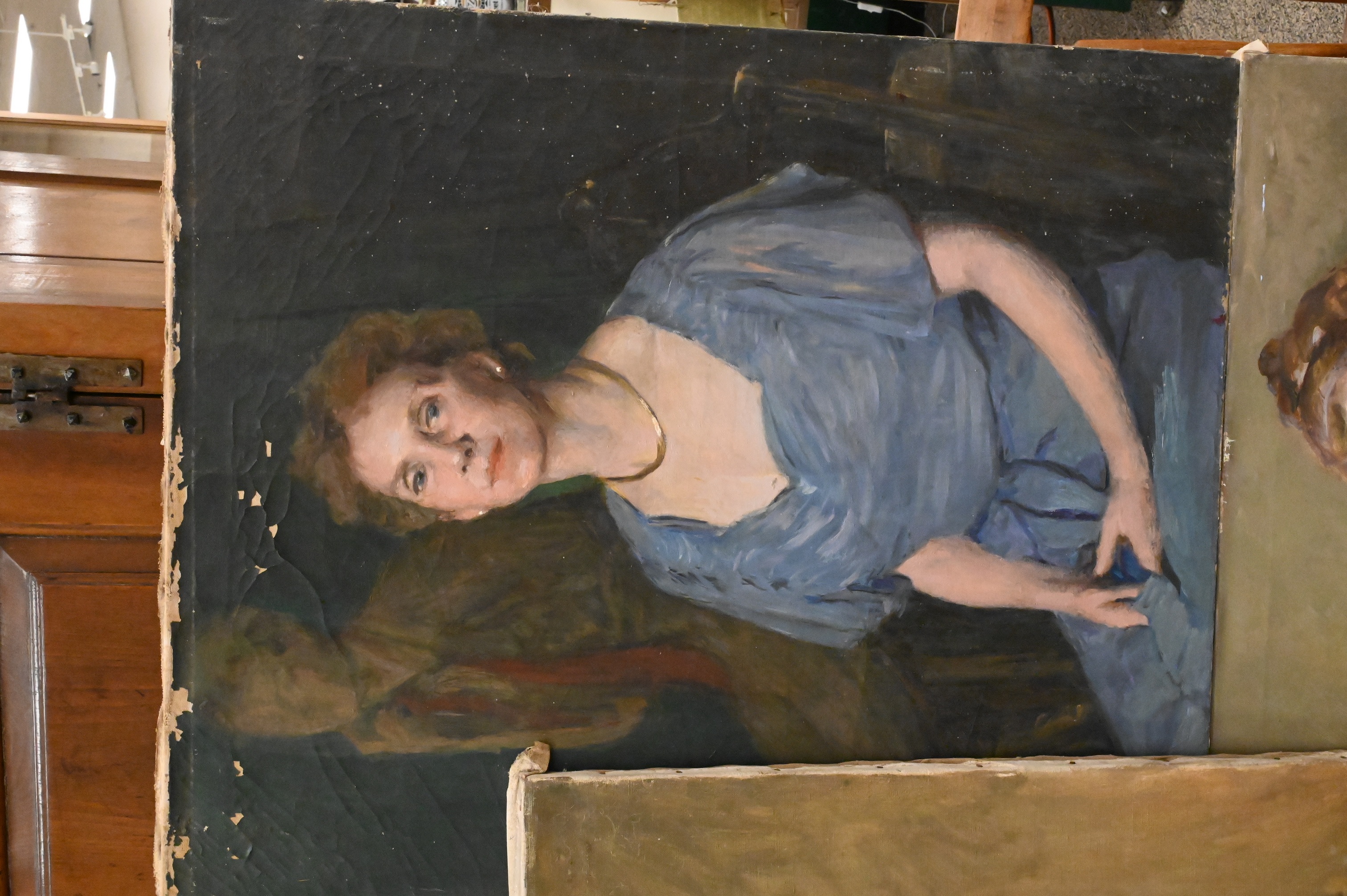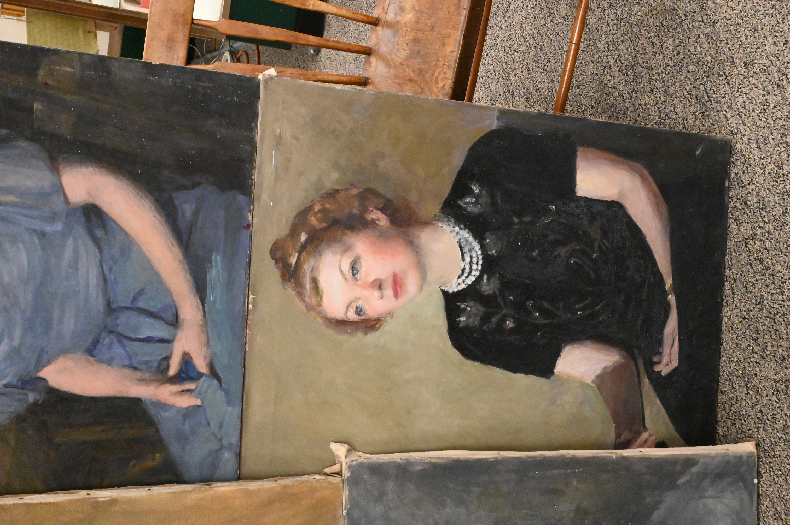 to include a portrait of a lady in a blue dress and gold necklace seated in a studio, a young lady with a pearl necklace, a woman in a green dress along with a portrait of an older woman possibly Florence Griswold