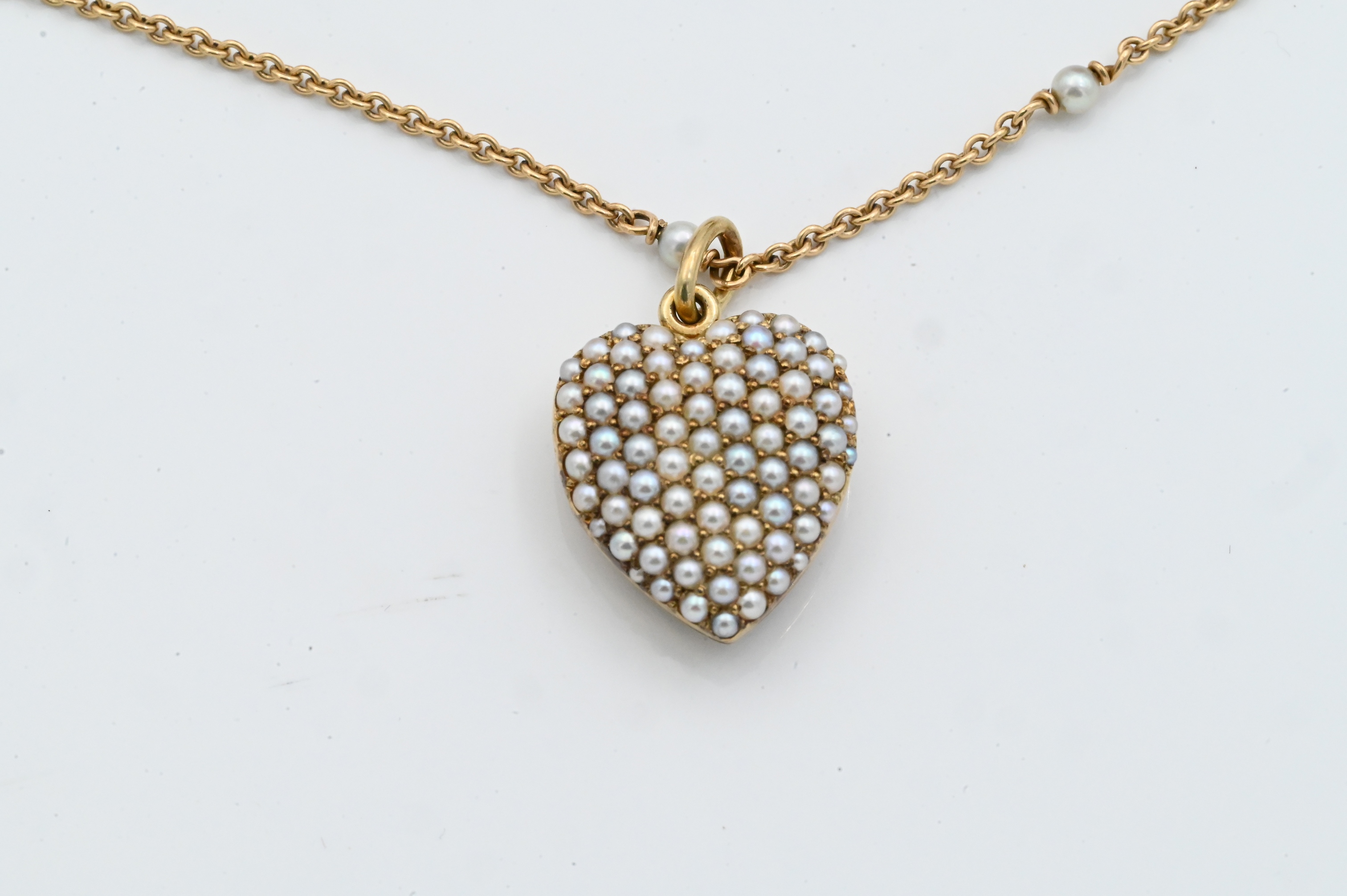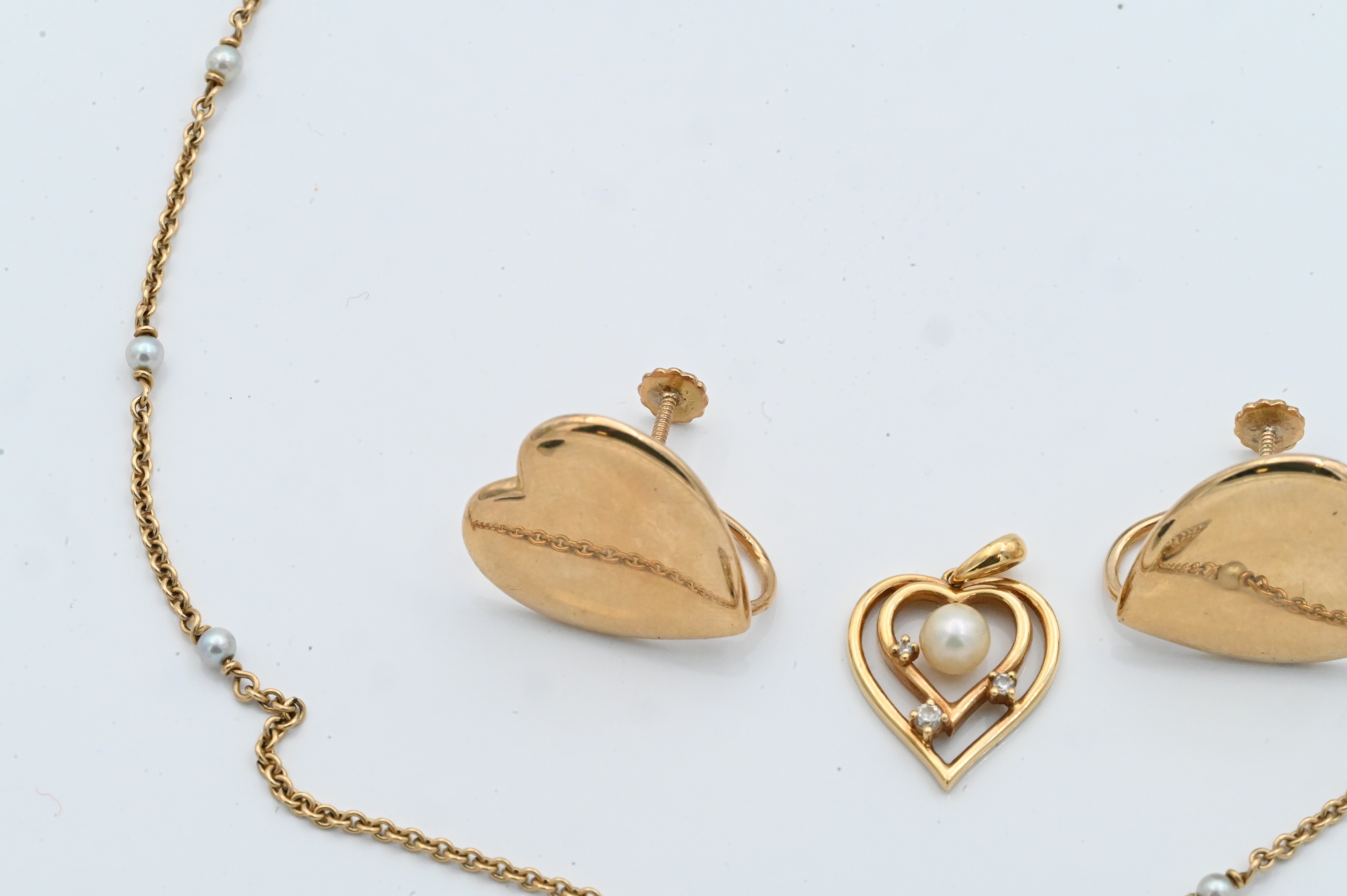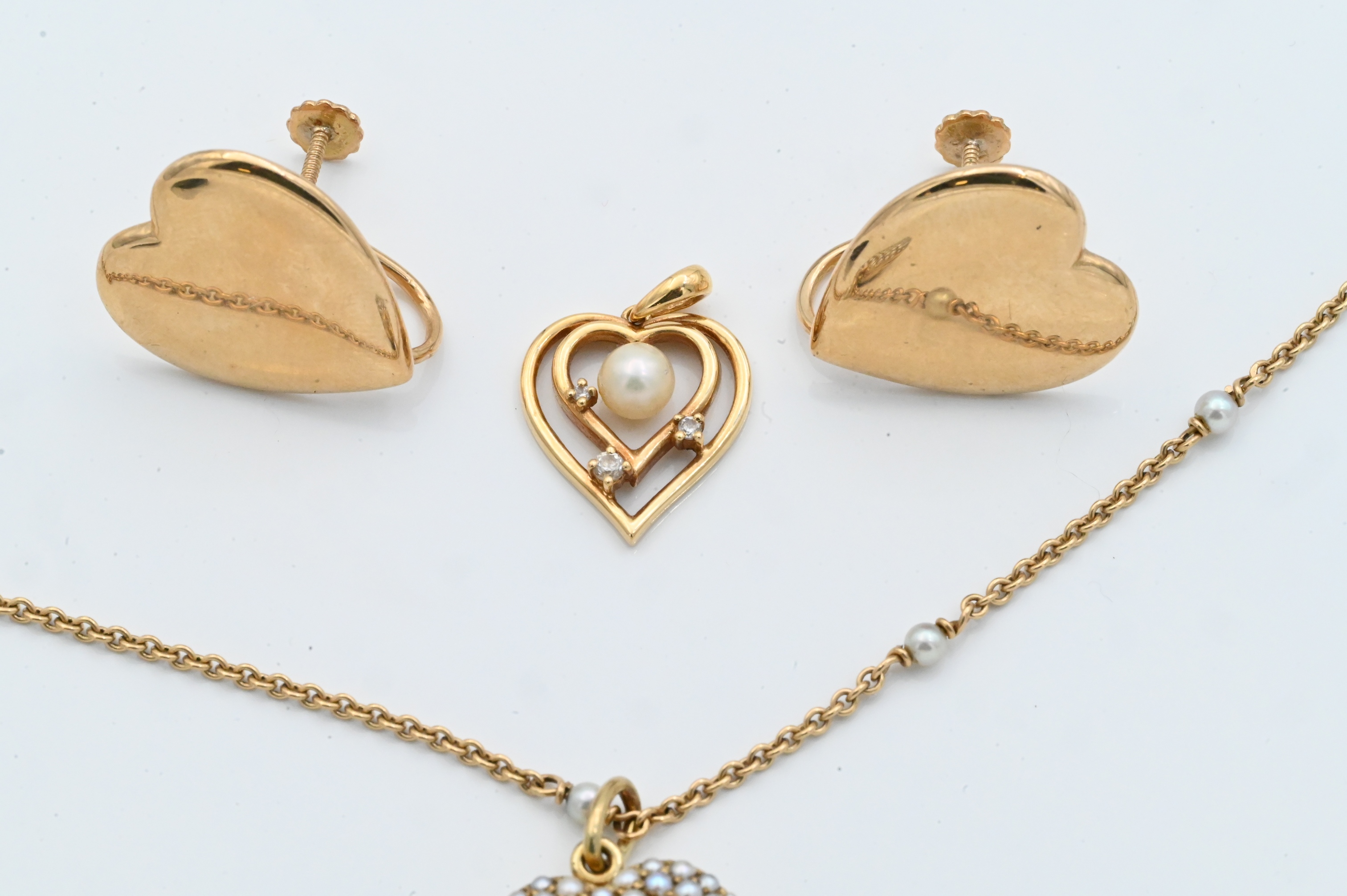 to include 14K yellow gold heart shape earrings, 18K yellow gold pearl and diamond heart pendant, and 14K yellow gold and pearl heart locket and charm