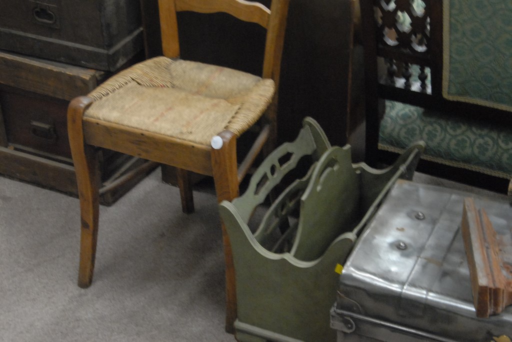 Group lot: iron lion door stop, brass tray top table, wooden butler figure, decorative tin box, magazine holder, and rush seat side chair.