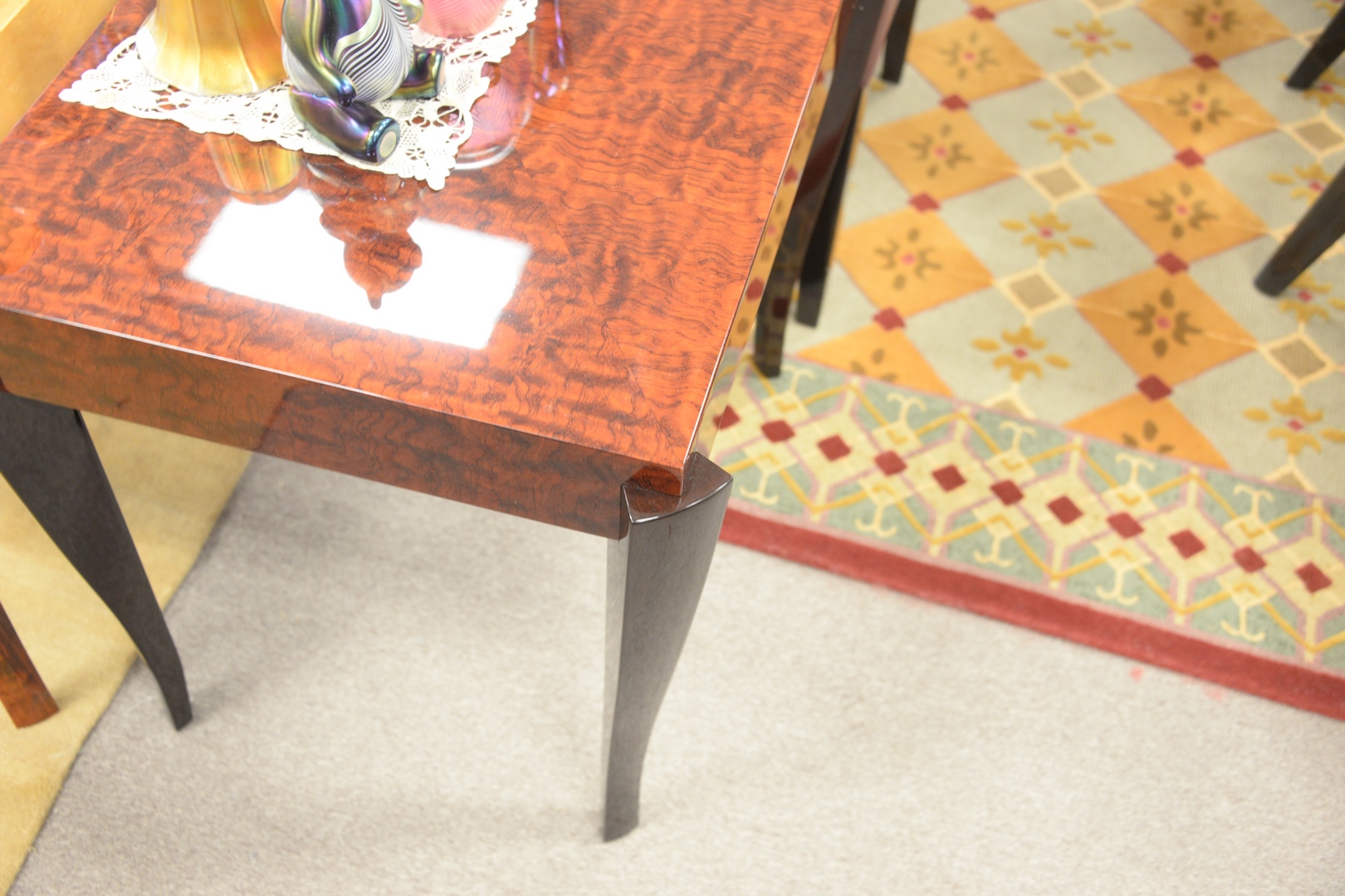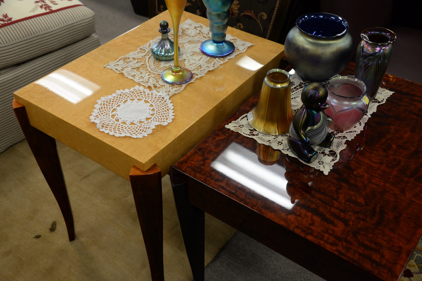 Lot 270: Group of Three Dakota Jackson Side Tables, in three shades of lacquered wood tops, each height 24 inches, tops 20″ x 36″, 18″ x 26″ and 20″ x 26″.