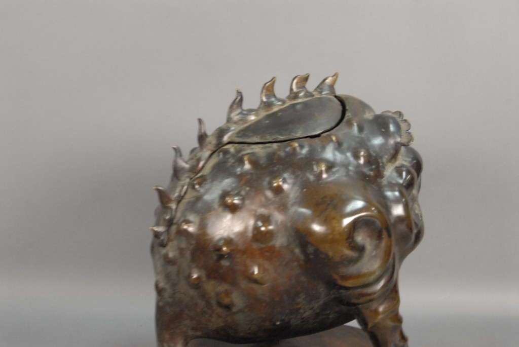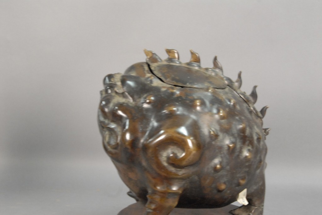 Lot 270: Large bronze toad with hinge lid back opening to hollow interior sitting on a carved wood base, ht. 10 1/2 plus base.