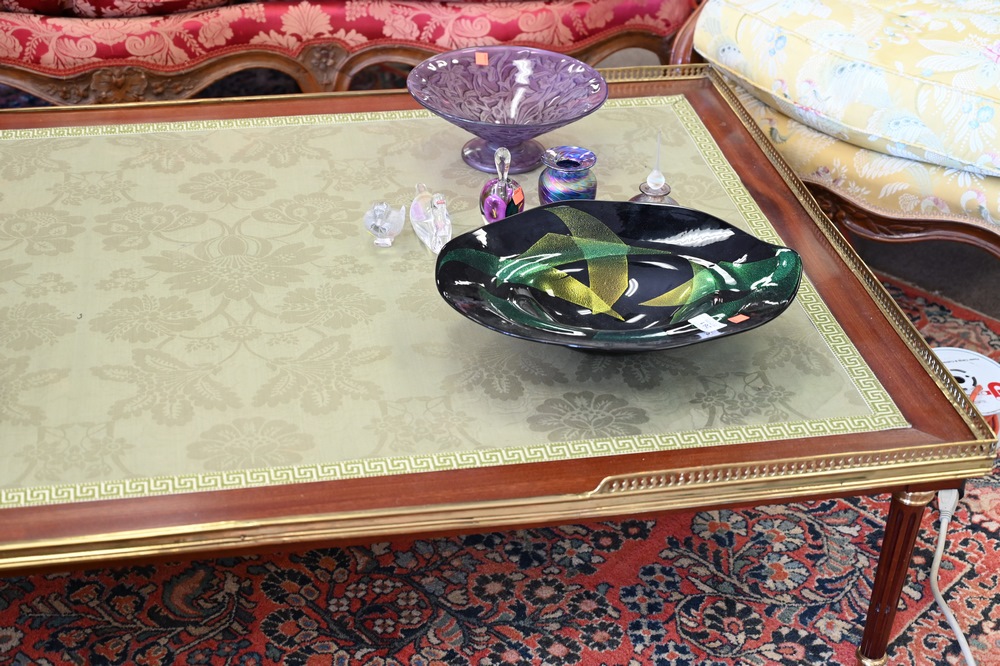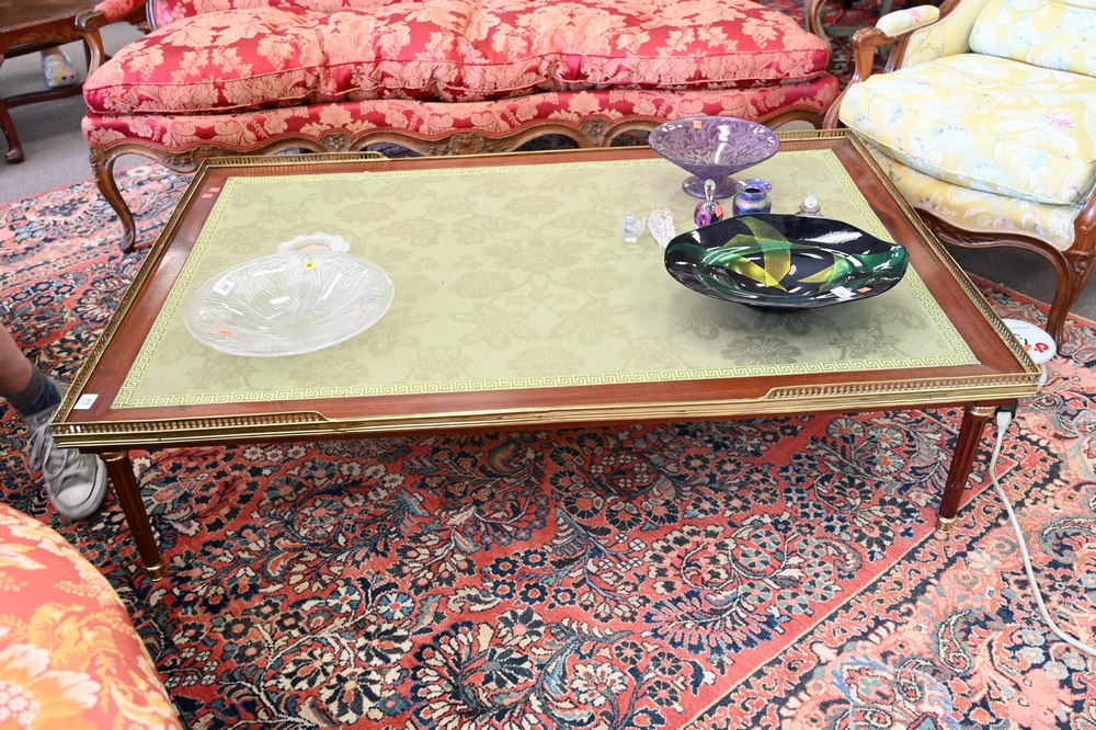 Lot 270: Louis XVI Style Mahogany Coffee Table, having cloth center and brass gallery with brass trimmed legs, height 15 inches, top 40″ x 59 1/2″.