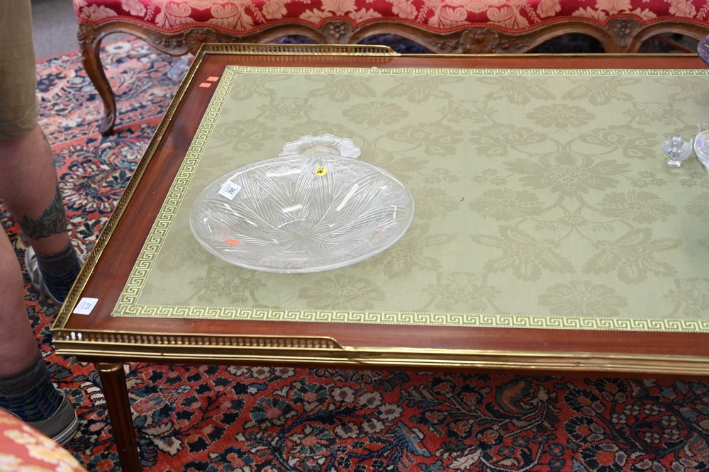 Louis XVI Style Mahogany Coffee Table, having cloth center and brass gallery with brass trimmed legs, height 15 inches, top 40″ x 59…