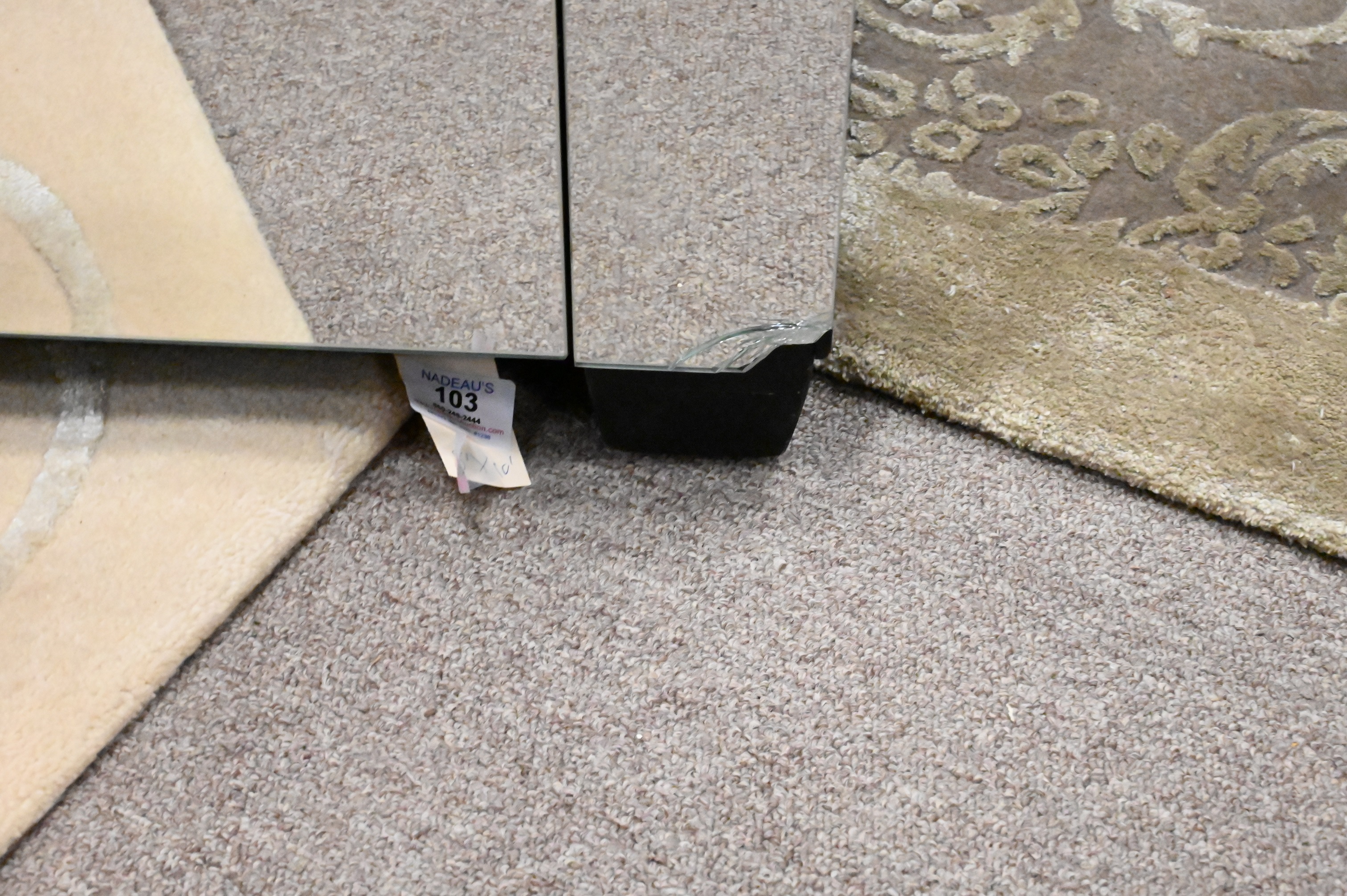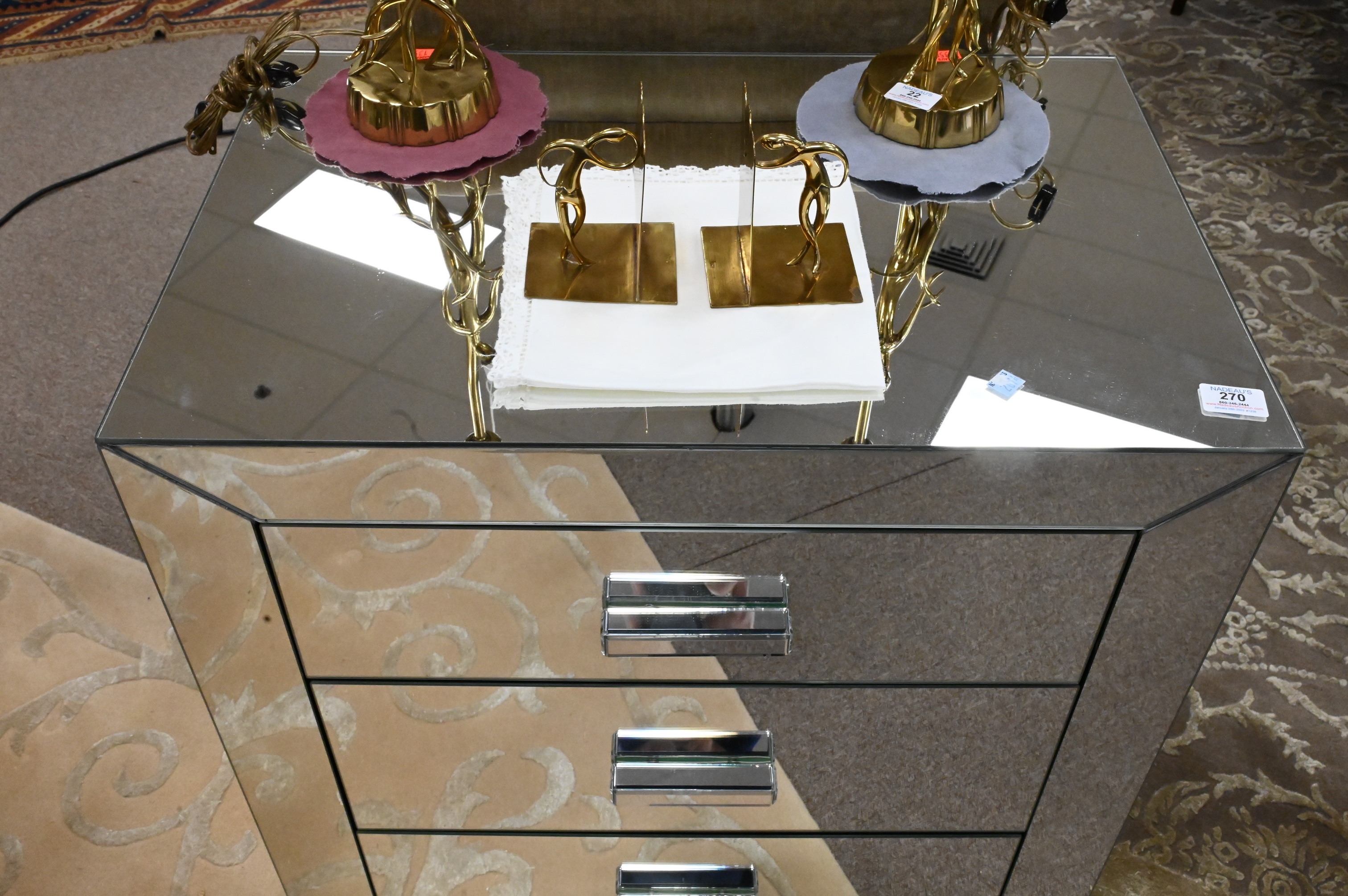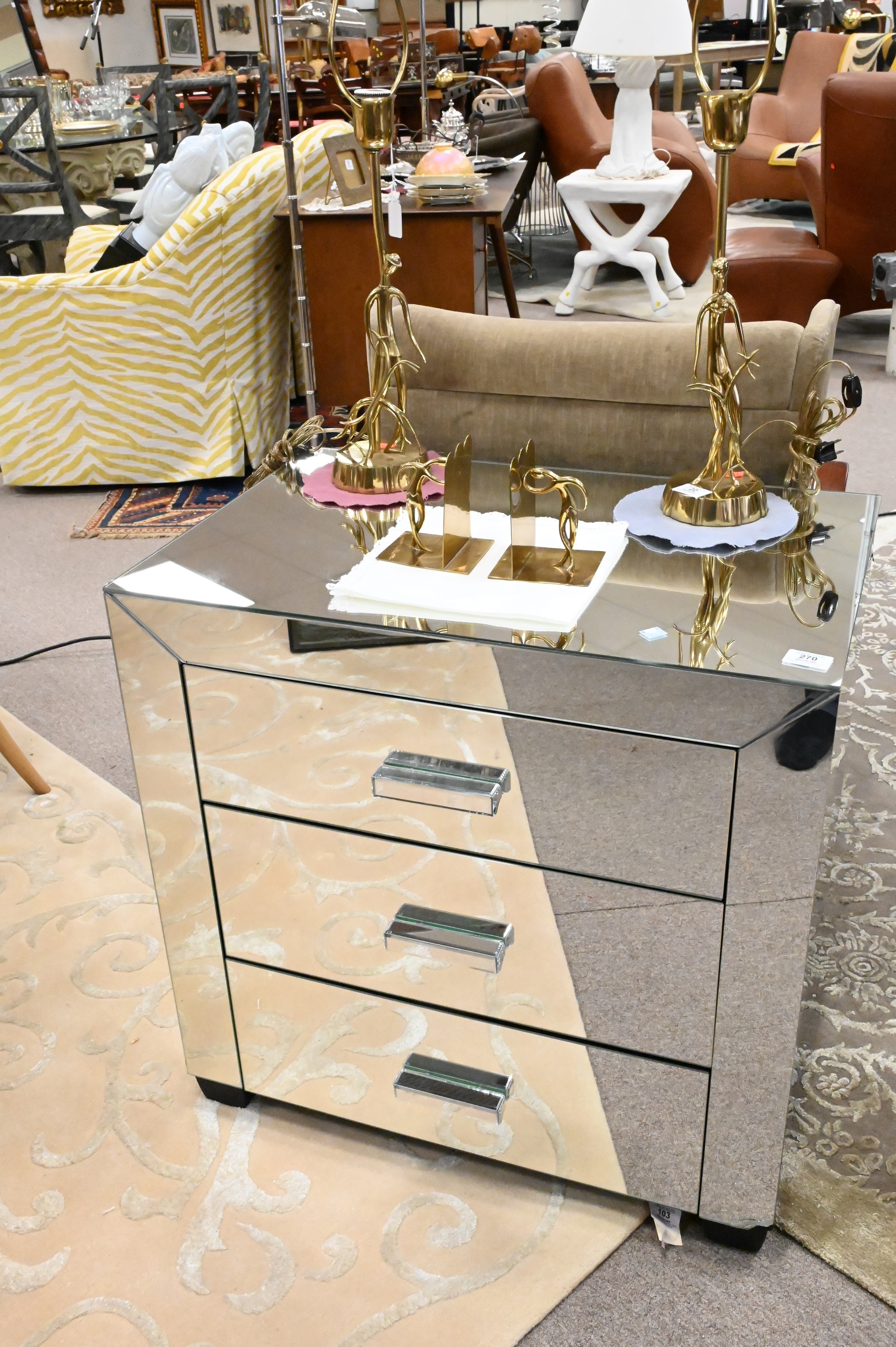 Mirrored Night Stand, having three drawers on black square feet, chipped bottom corner, height 28 inches, top 19″ x 28″.