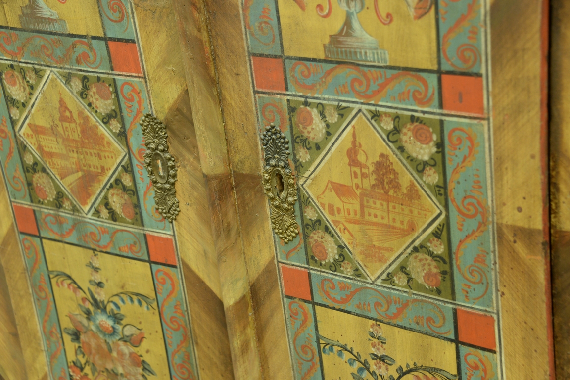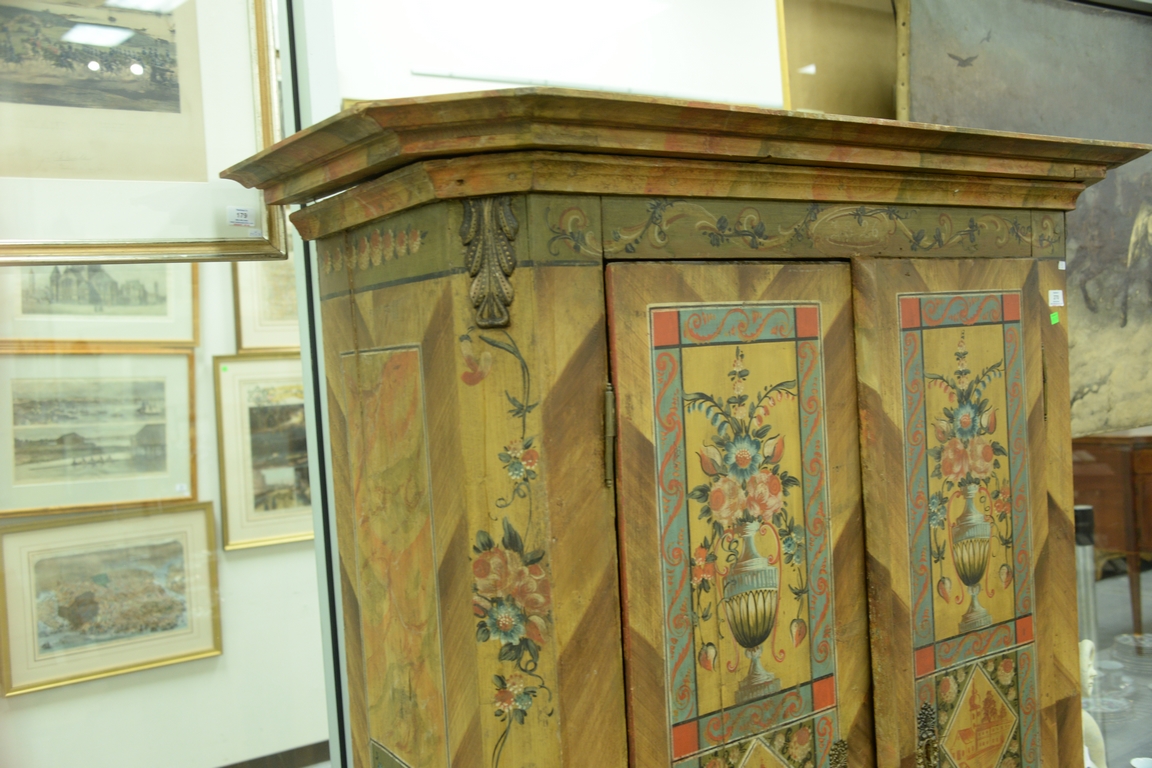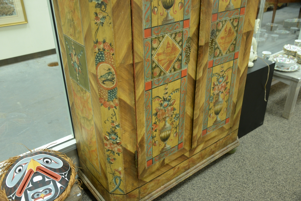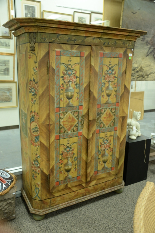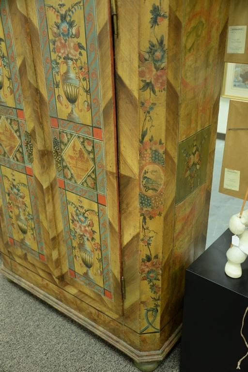 Lot 270: Paint decorated two door armoire, European 19th century. ht. 74in., wd. 45in., dp. 19in.