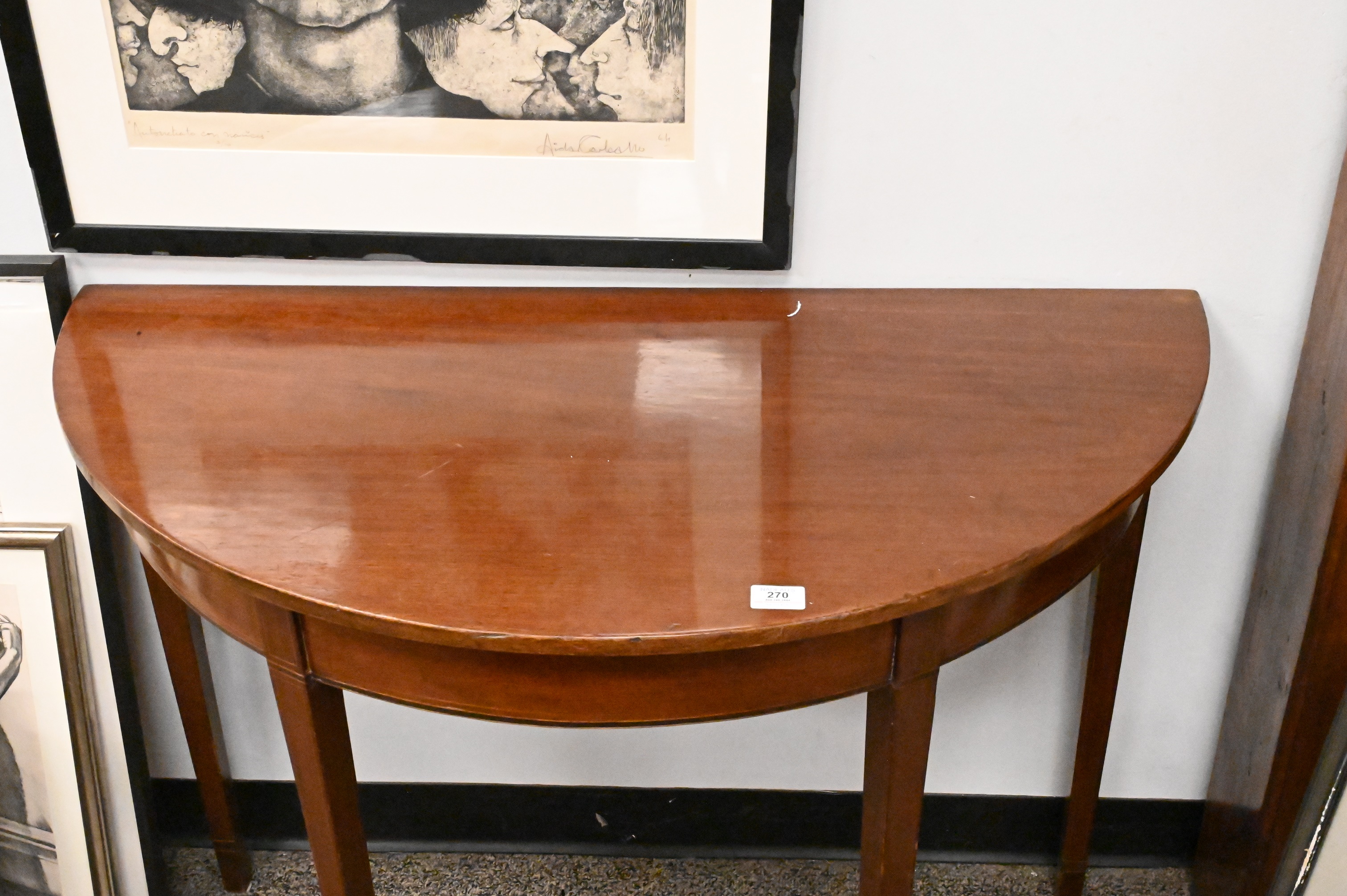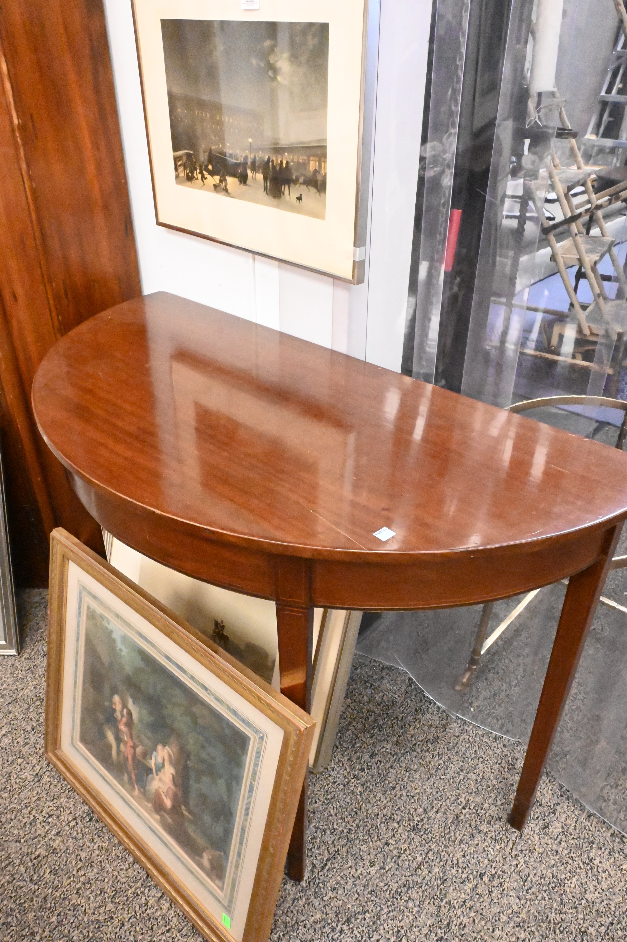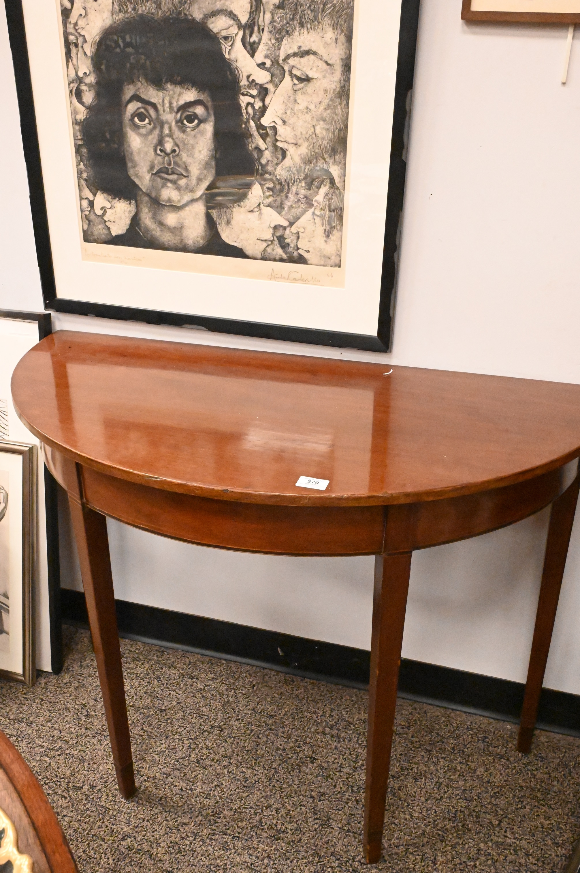 Pair of Demilune Mahogany Tables, originally part of three part table, height 30 inches, width 41 inches, depth 21 inches.