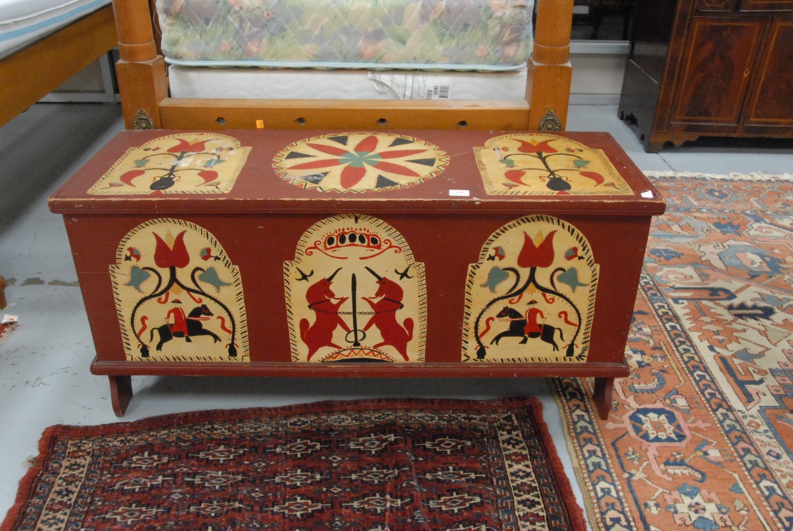 Lot 270: Primitive blanket chest with lift top on bootjack ends, repainted top is loose. ht. 22in. wd. 47in. dp. 17in.