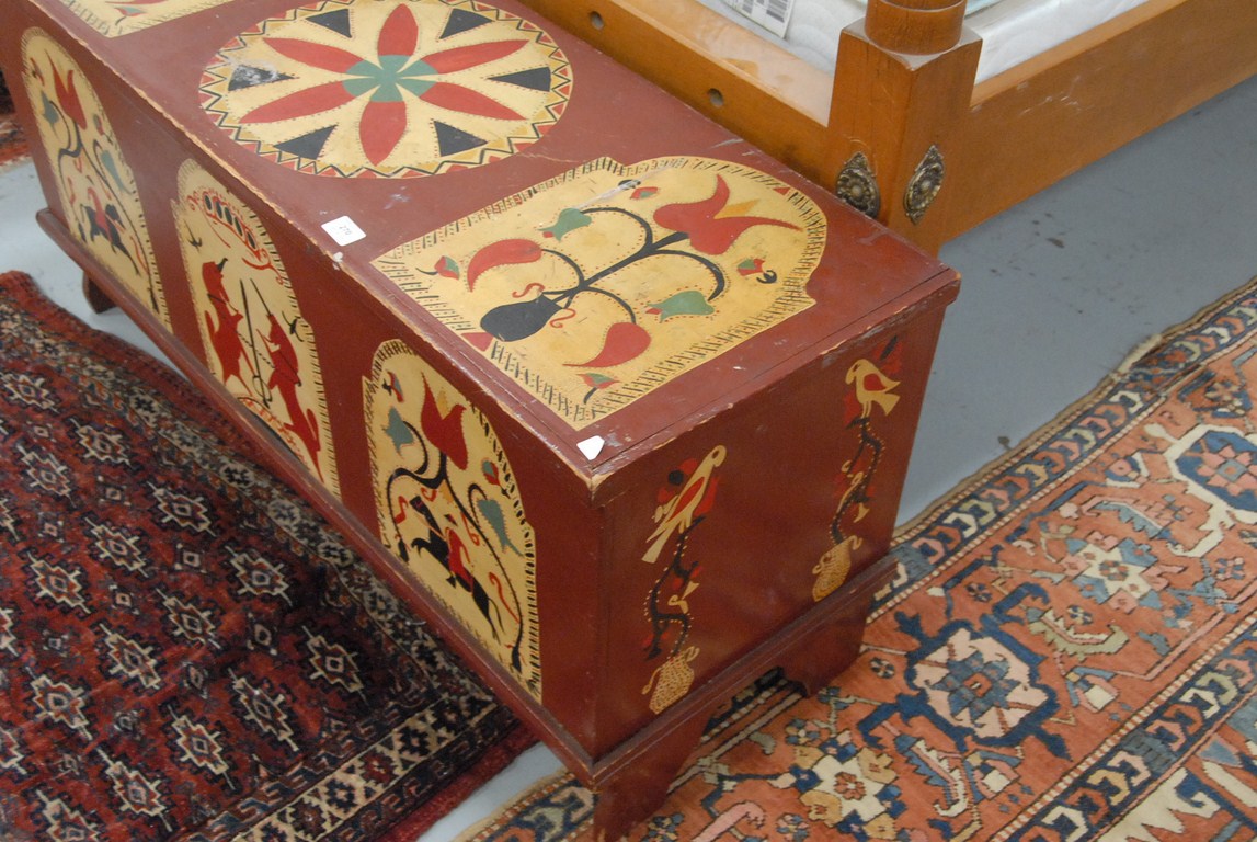 Primitive blanket chest with lift top on bootjack ends, repainted top is loose. ht. 22in. wd. 47in. dp. 17in.