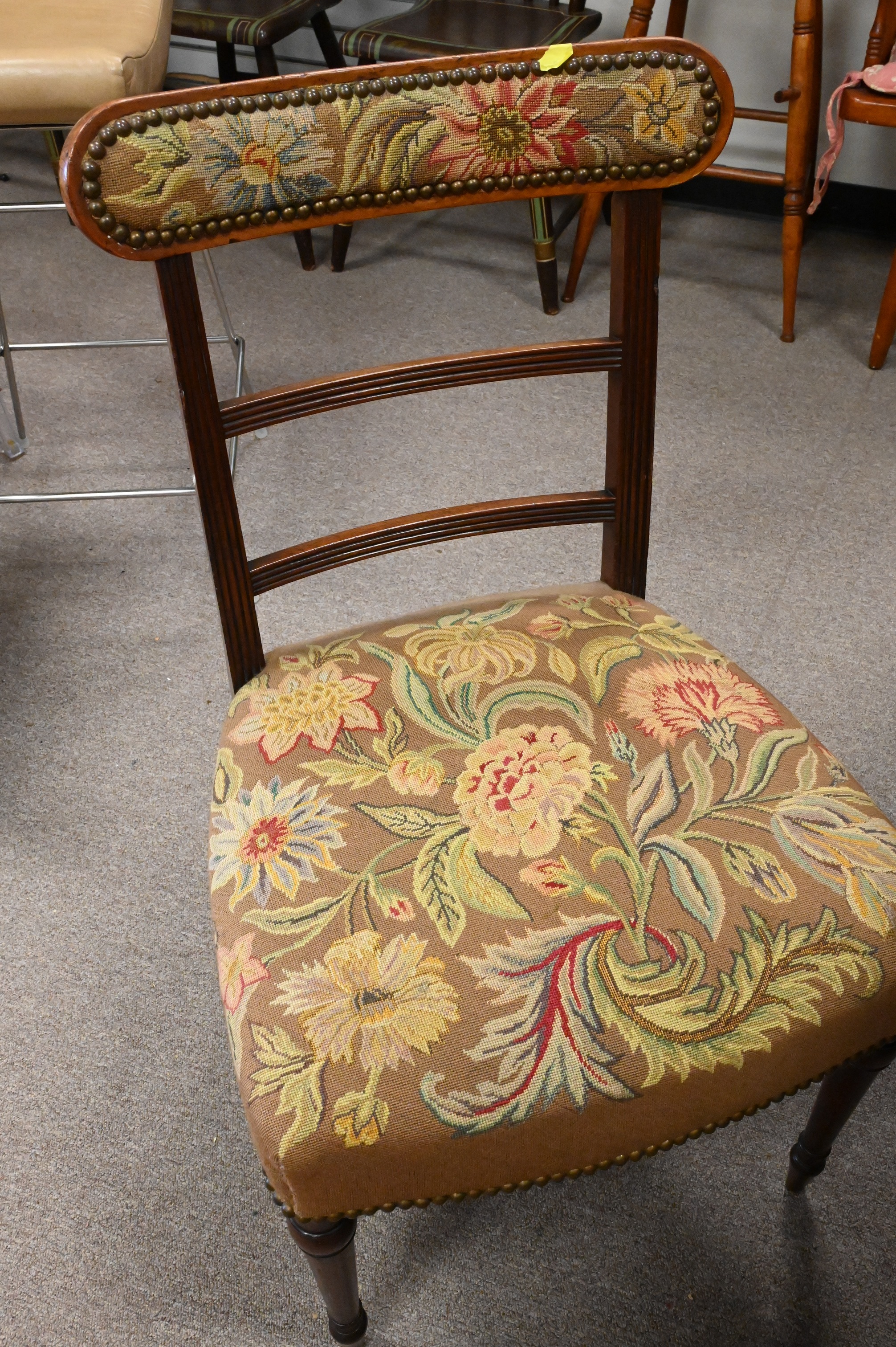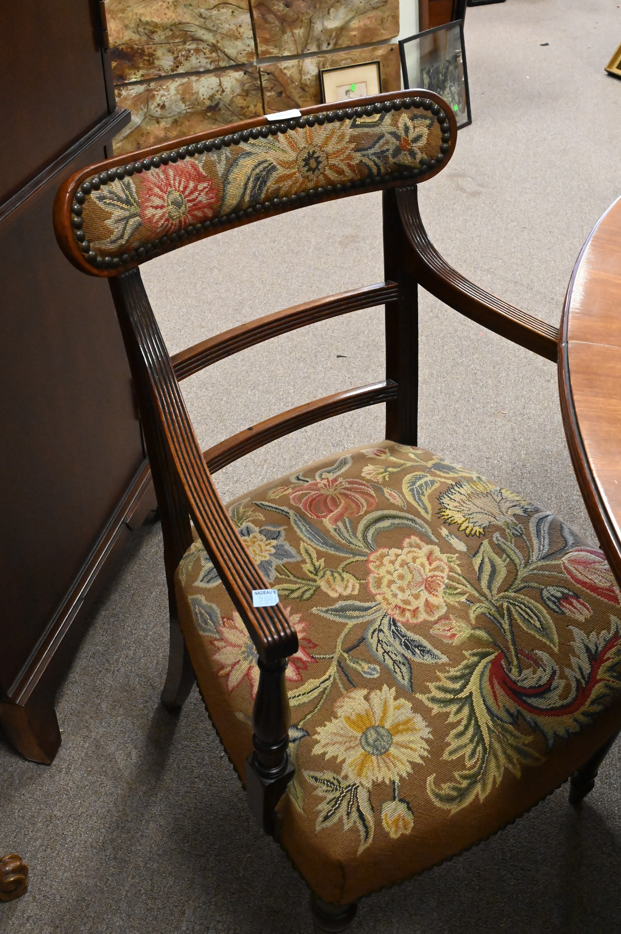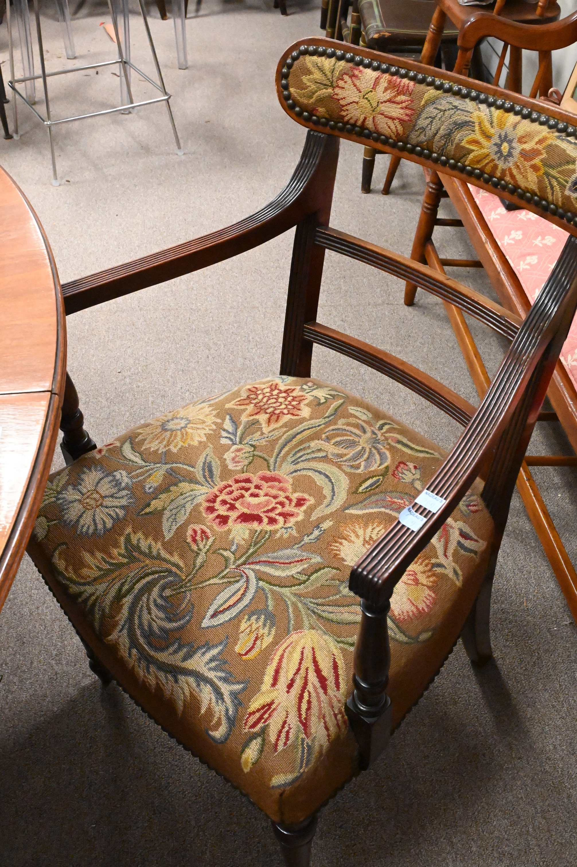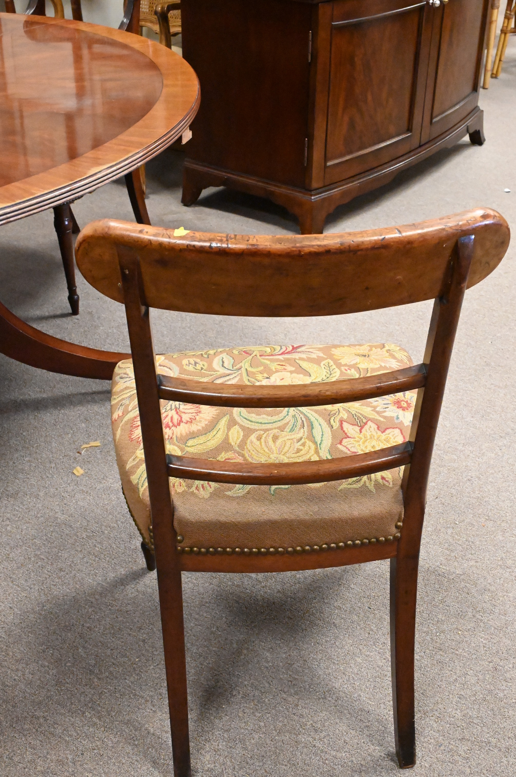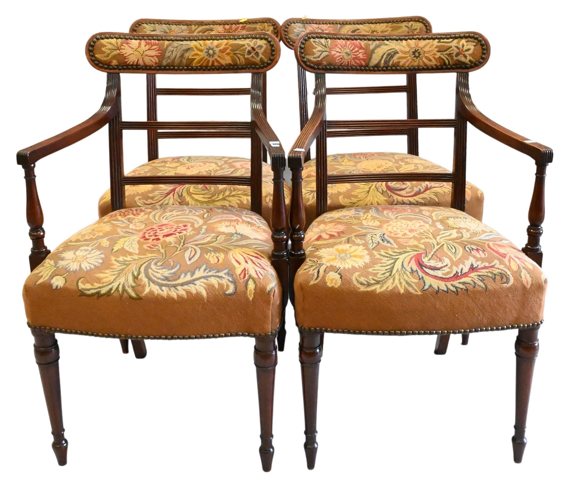 Set of Four George IV Mahogany Dining Chairs, to include two armchairs and two side chairs, all upholstered with petit point upholstery, height 34 1/2 inches.
