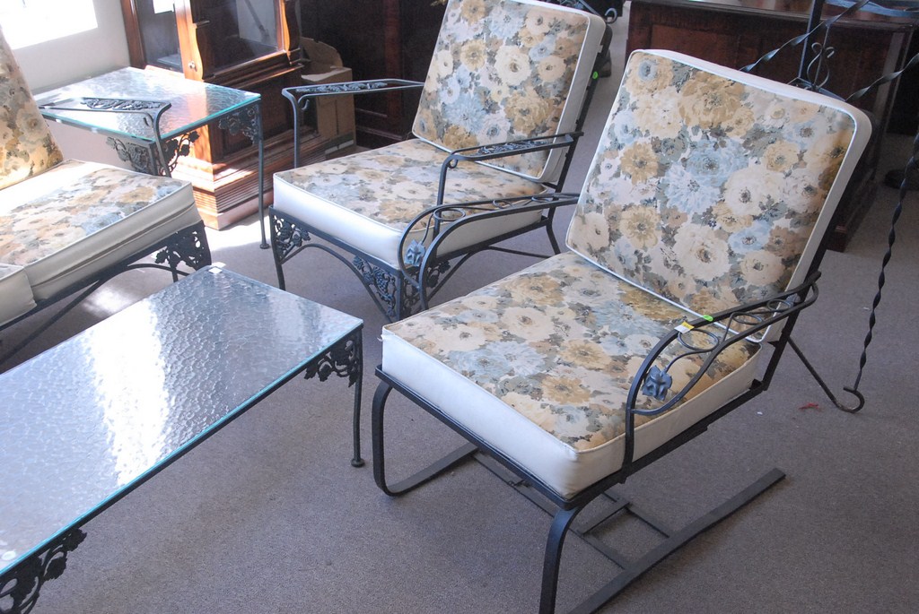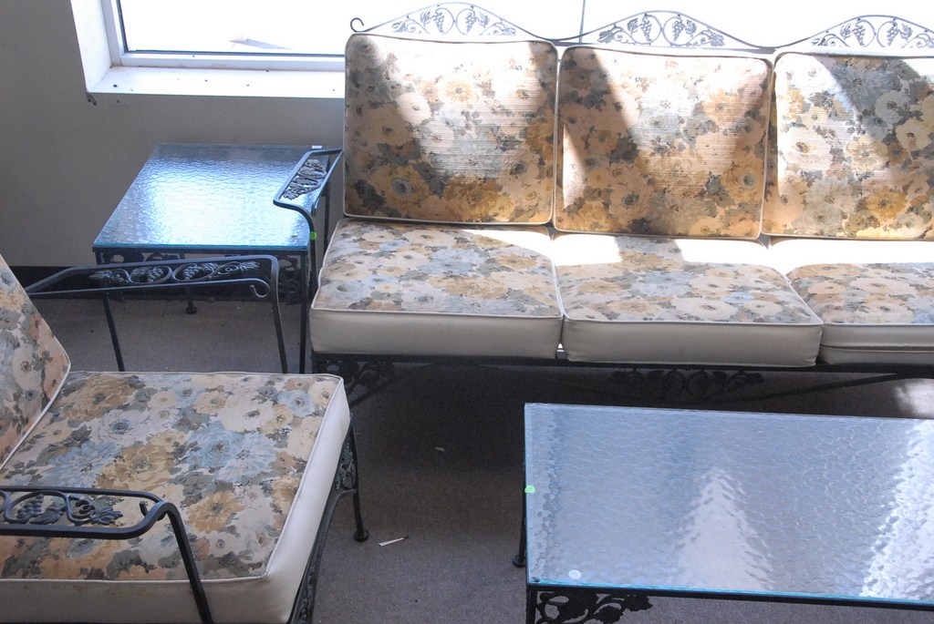 Seven piece patio furniture lot three iron glass top tables, three iron chairs, and sofa.
