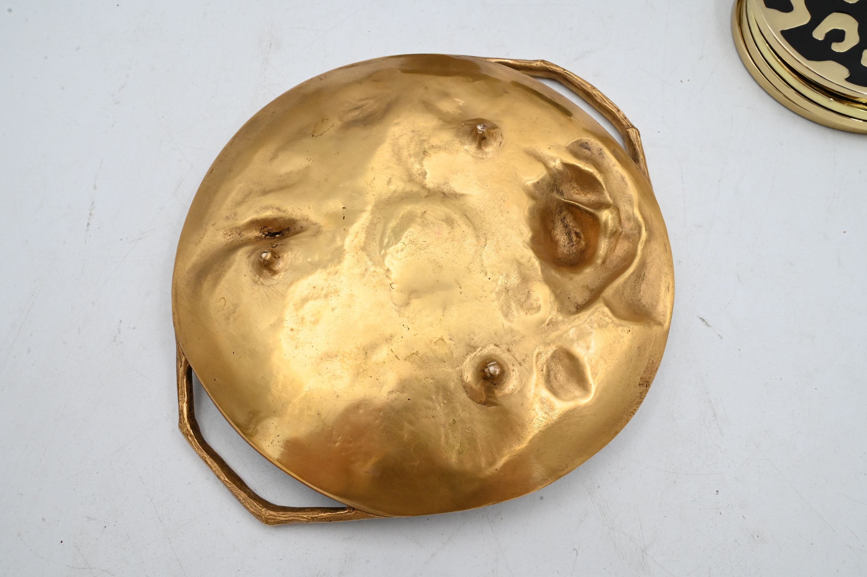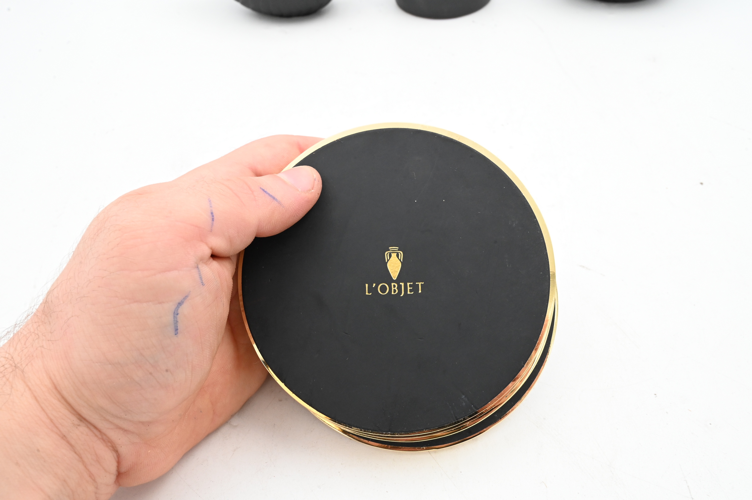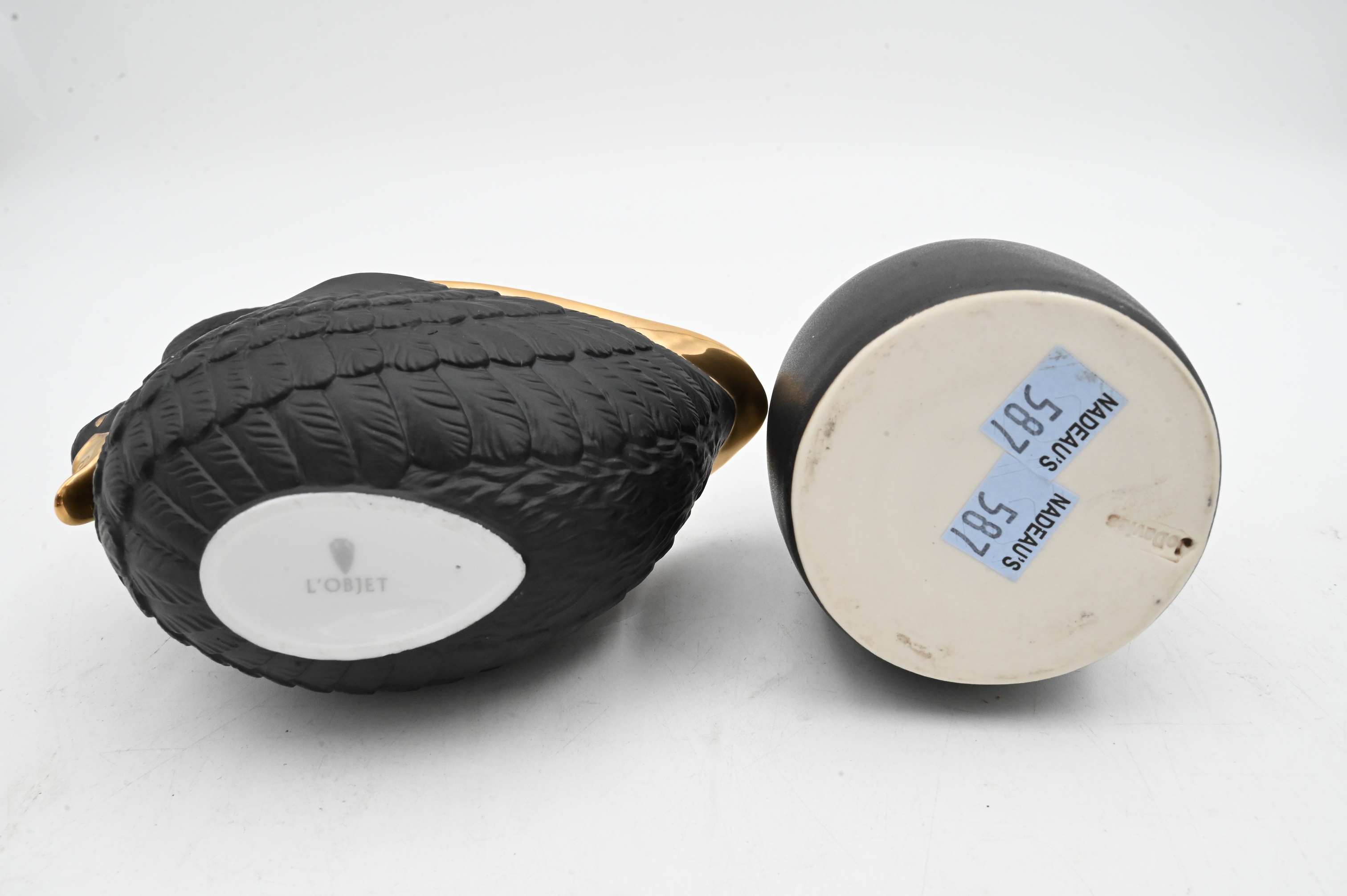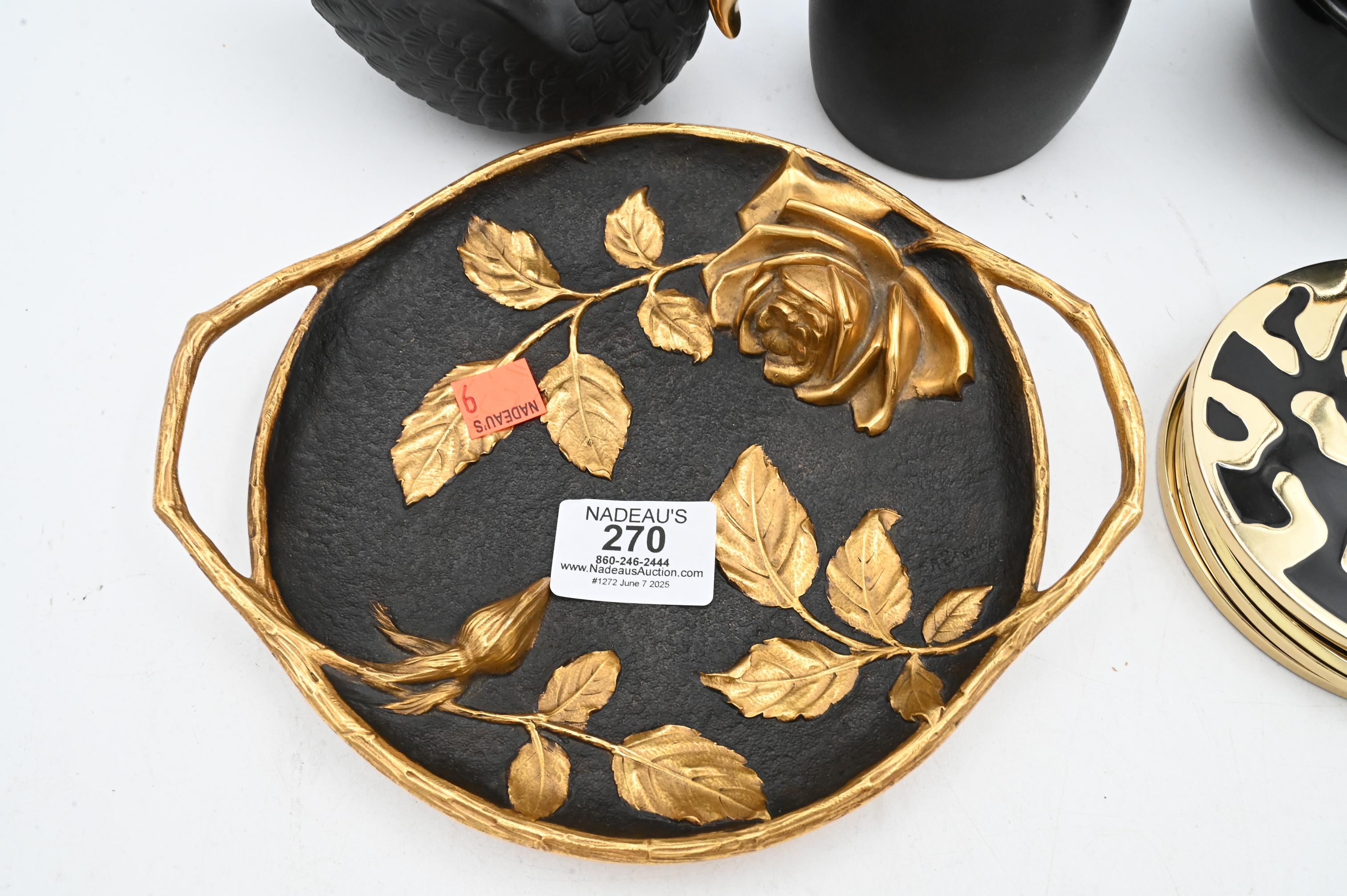two L’Objet Leopard set of four coasters 24K gold plated and enamel, retails for $225, black porcelain swan bowl with gilt interior, retails for $375, Art Nouveau style patinated bronze and gilt rose dish, signed illegibly, Chinese Fuzhou black lacquer and gilt nesting boxes having floral accents, Jo Davies black ceramic unique vase