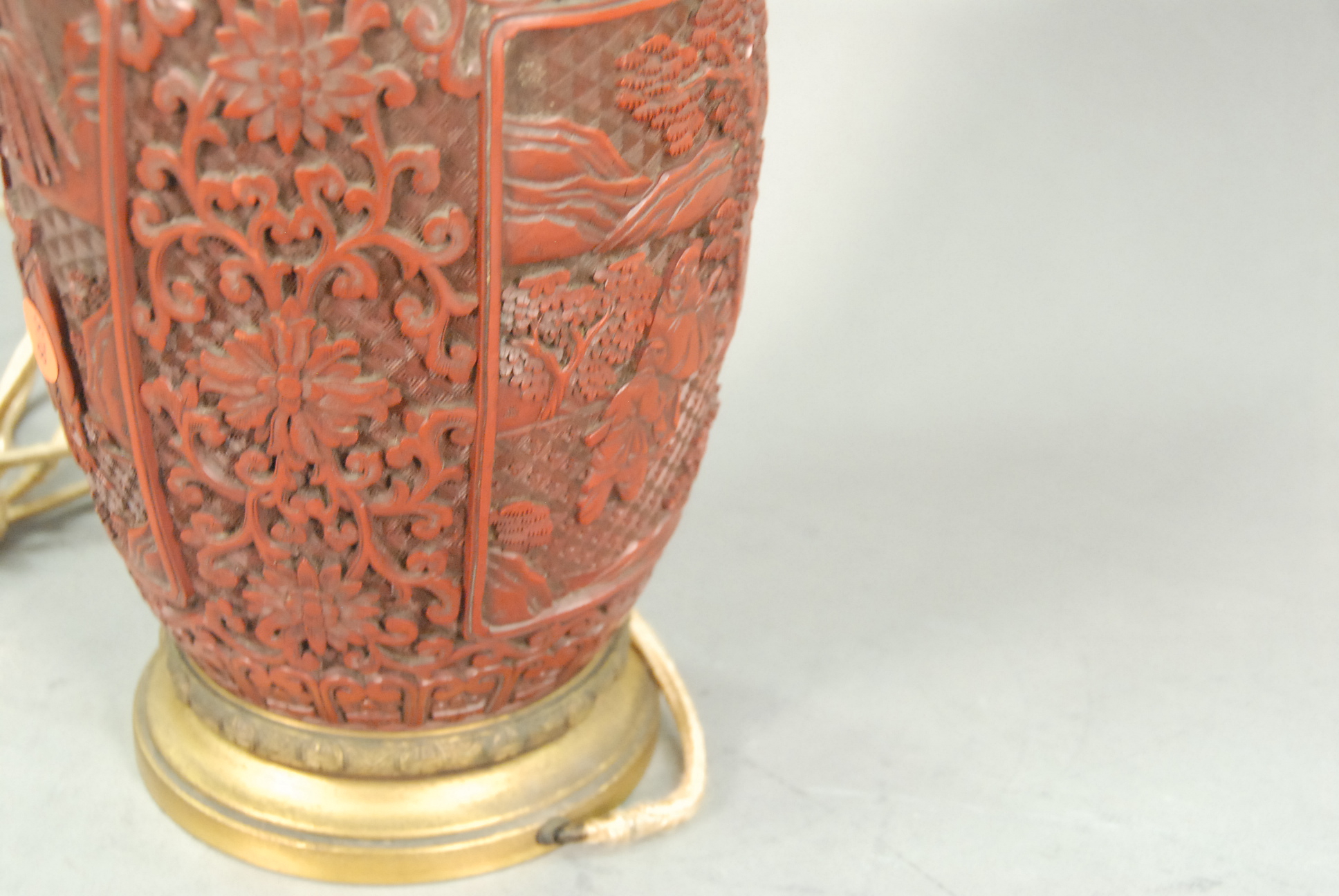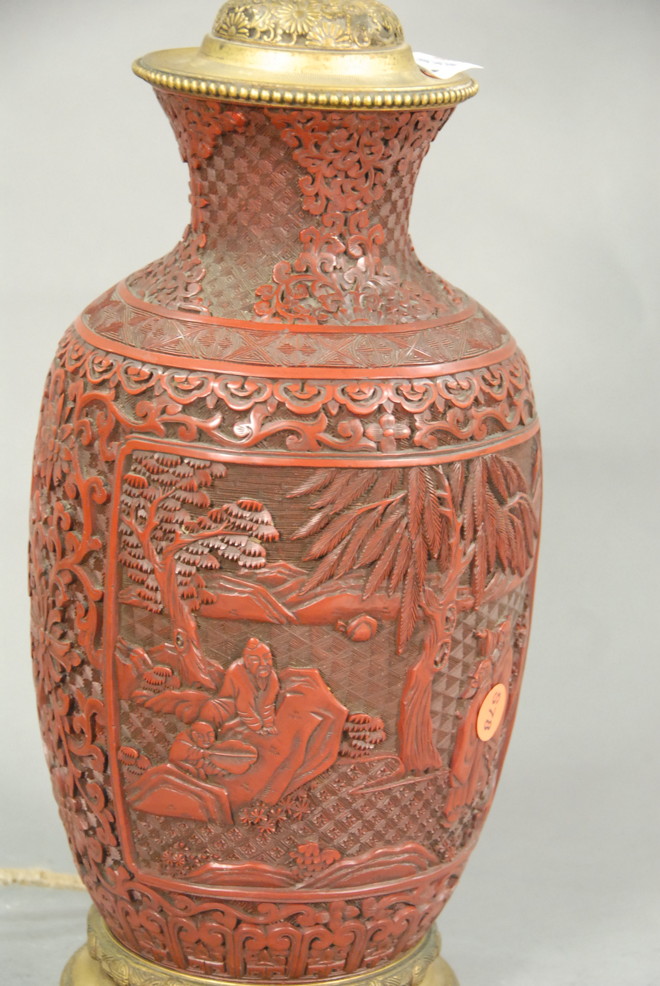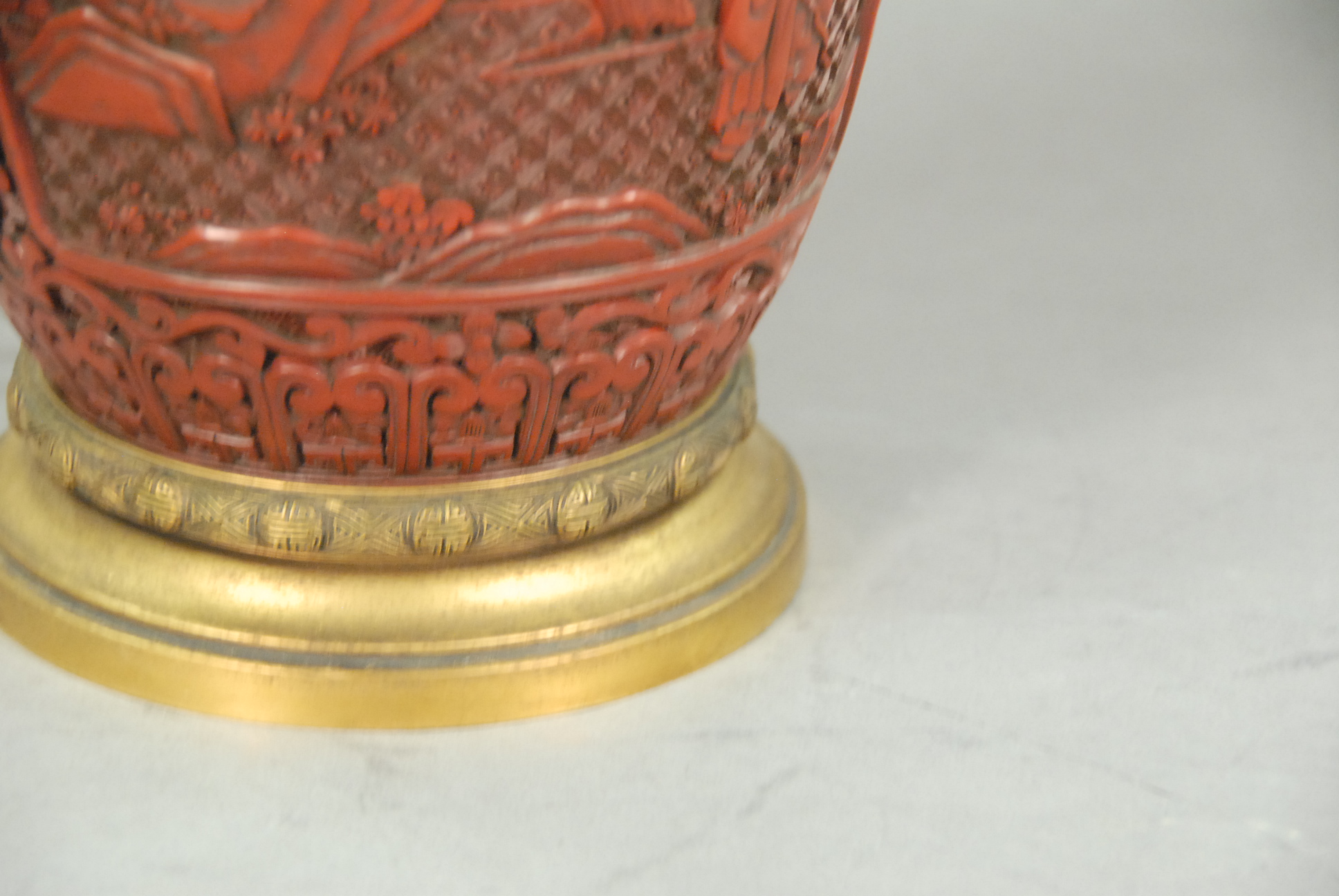 Tall cinnabar lacquer vase having two plaques intricately carved landscape with scholars made into a table lamp having gold gilded bronze base and top.