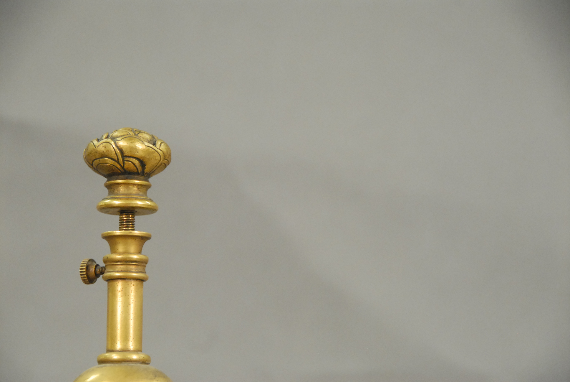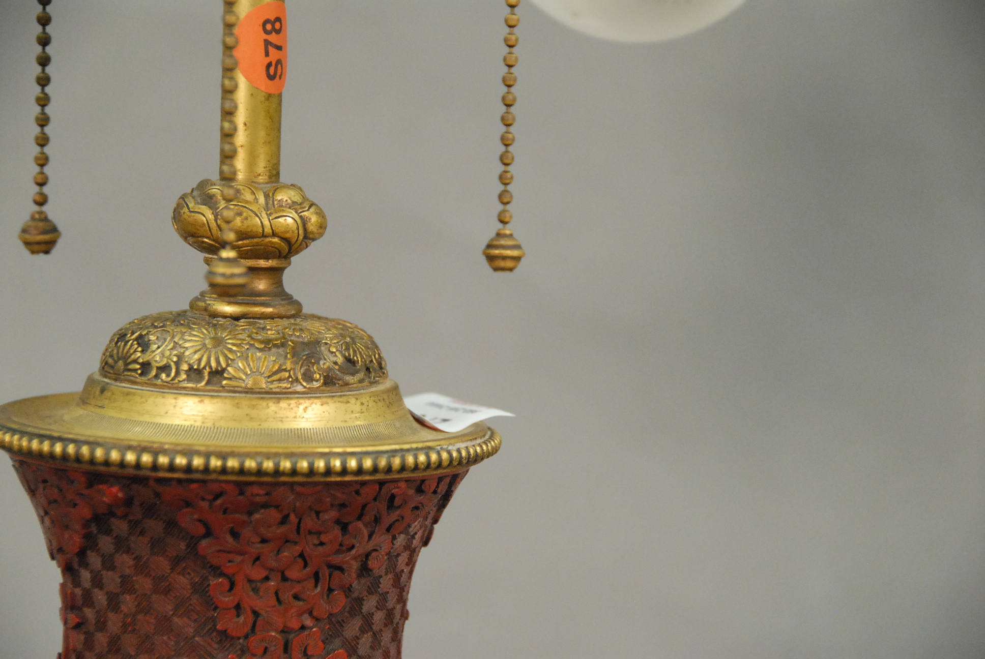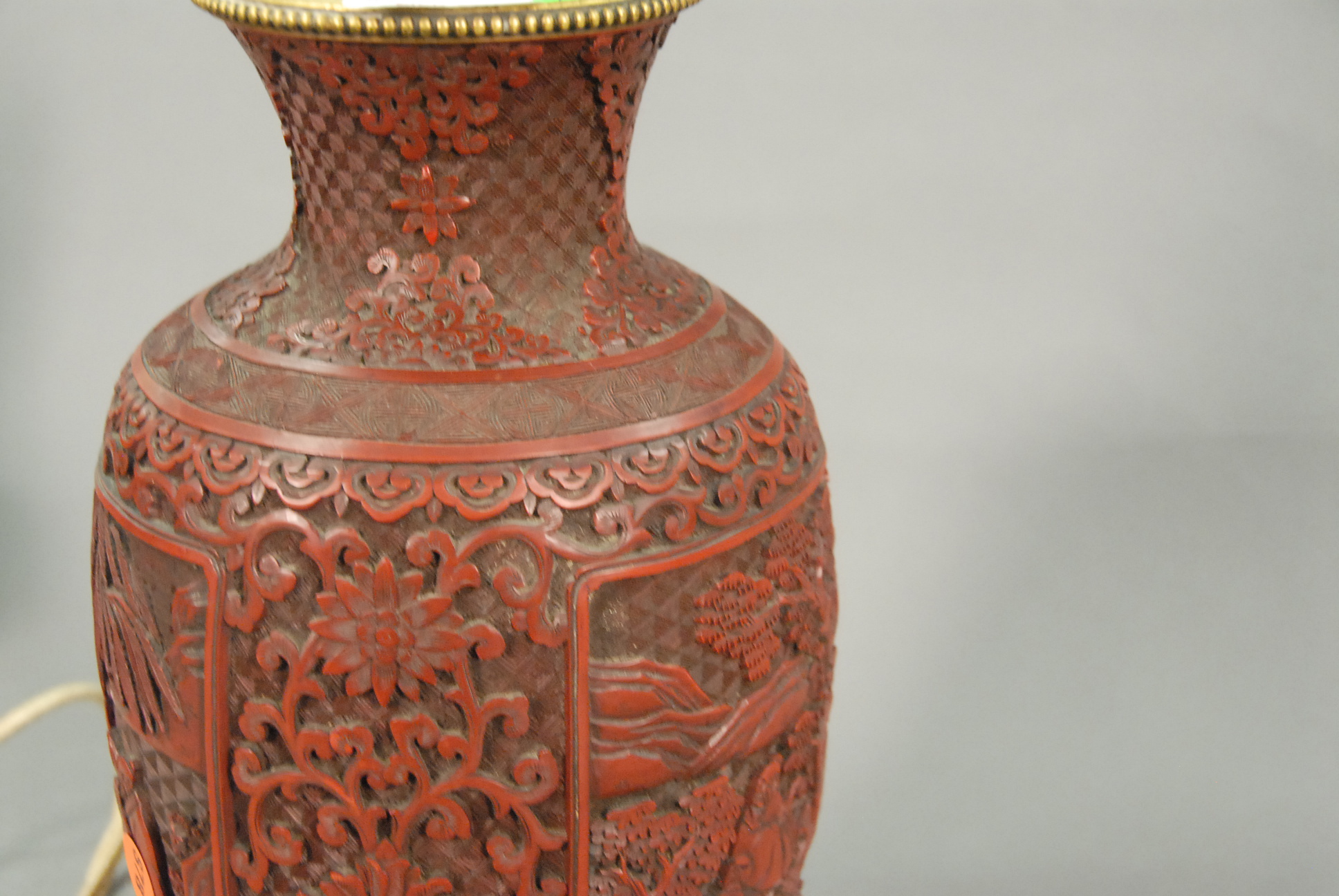 Tall cinnabar lacquer vase having two plaques intricately carved landscape with scholars made into a table lamp having gold gilded bronze base and top.