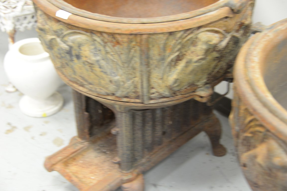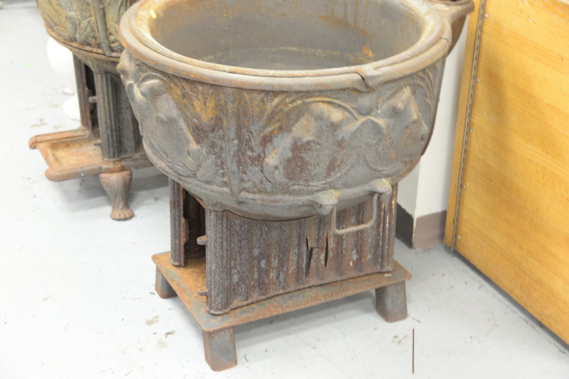 Two large rare Kenwood Wehrle Butcher cast iron kettle stoves. ht. 30 in. dia. 30 in.