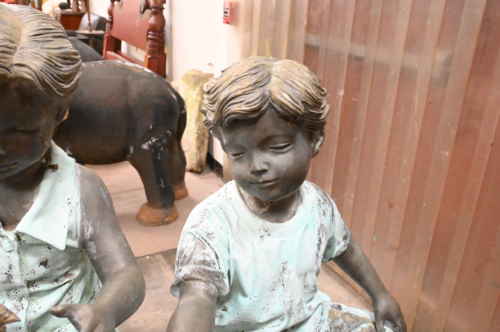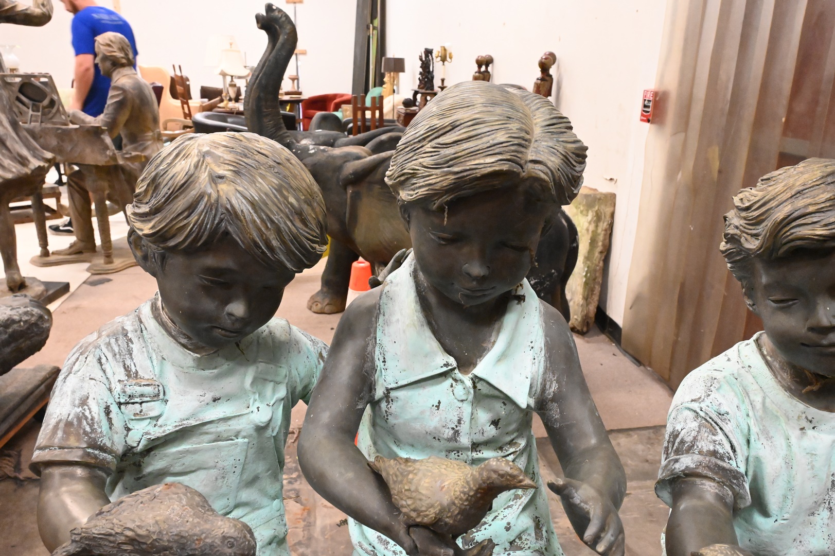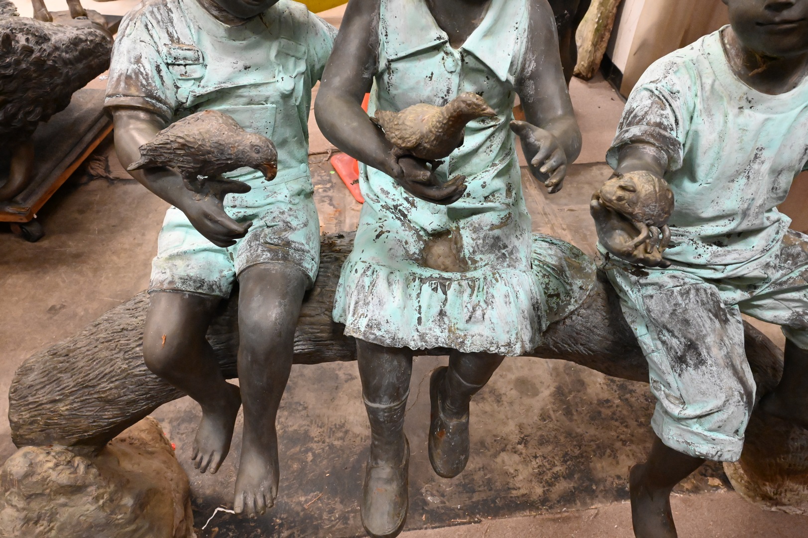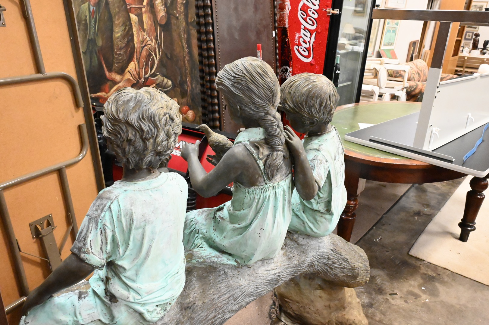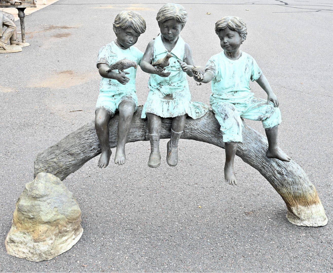Large Lifesize Bronze Figural Group, three children sitting on a curved tree branch, height 51 inches, length 75 inches, depth 25 inches.