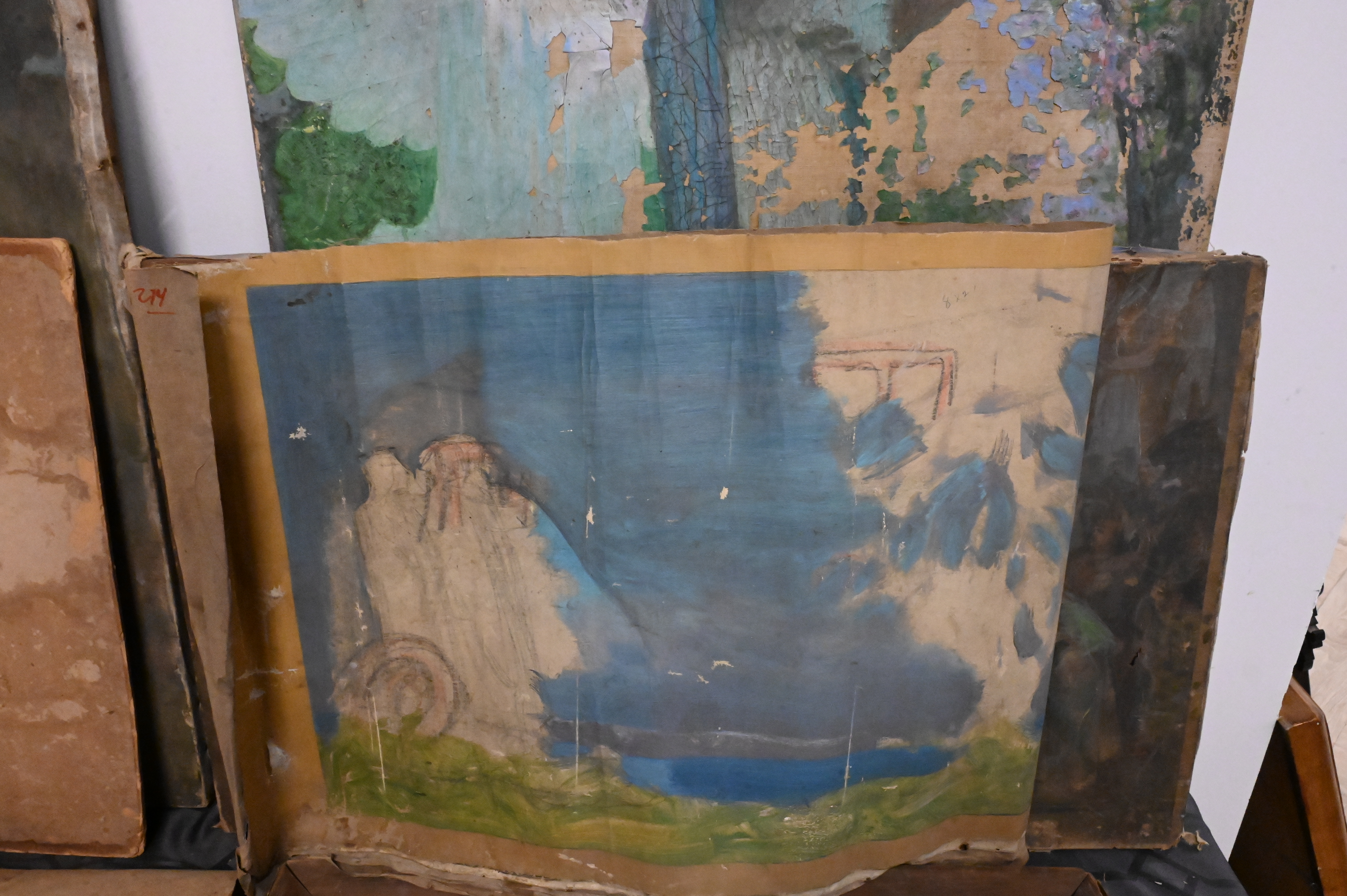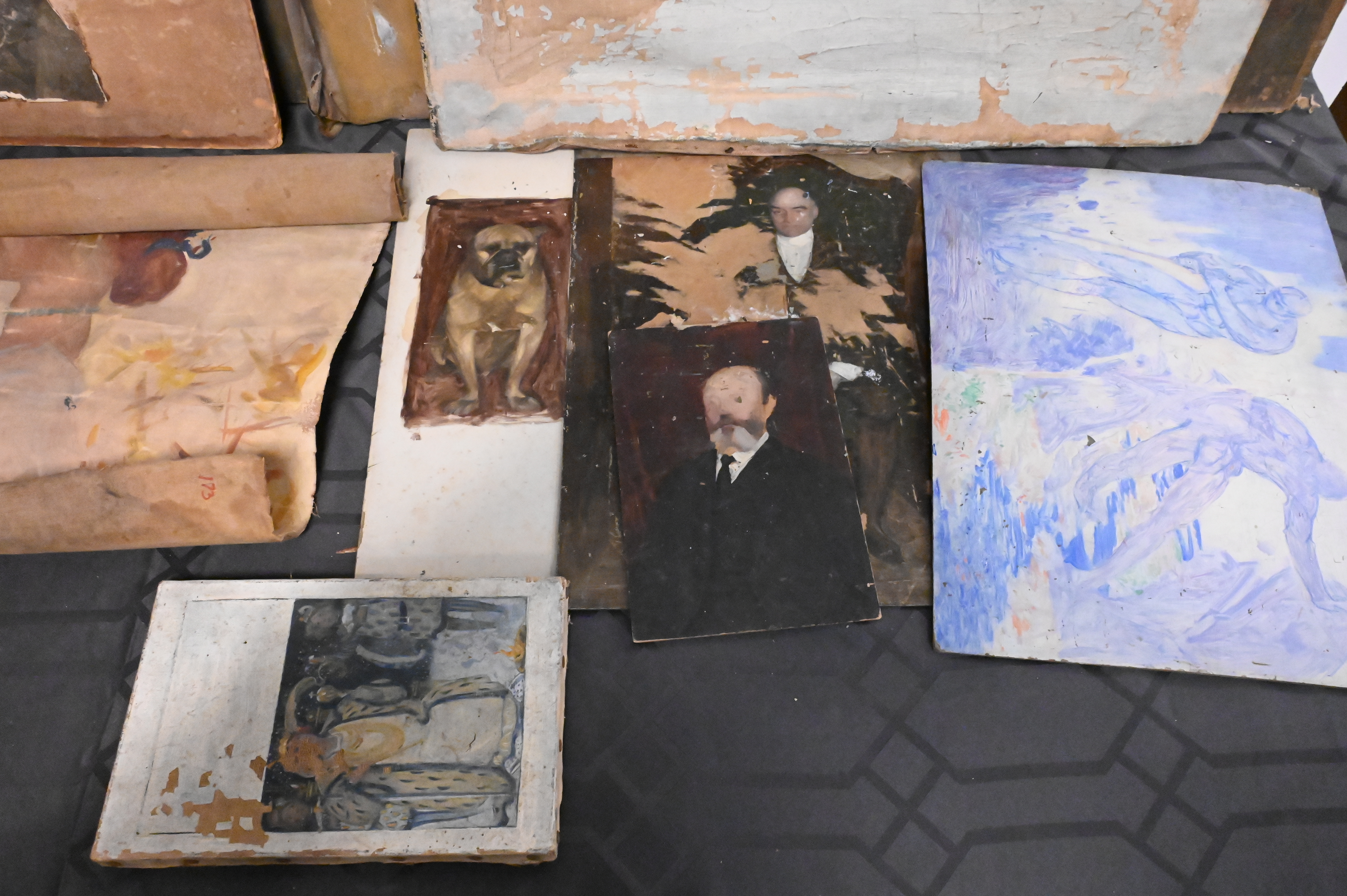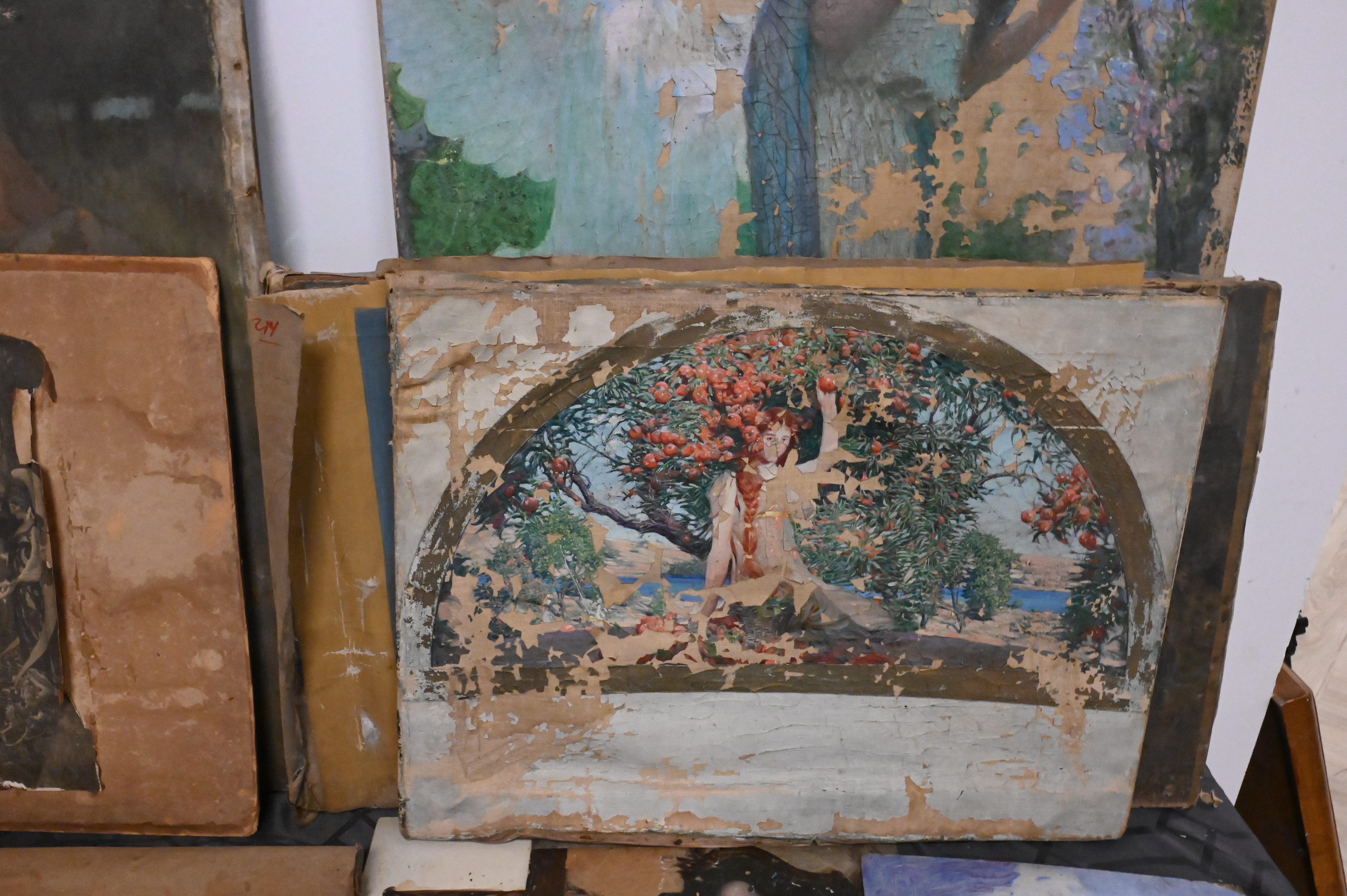 to include study for the 1915 Panama-Pacific Exposition, study of the pioneer spirit in America, the march of civilization from the Atlantic to the Pacific, possible religious studies of Christ and the disciples, medieval scene with king, princess and knights on horseback, scene of a cloaked woman standing before an angel possibly the Annunciation, side profile of a young woman, dog sketch etc…