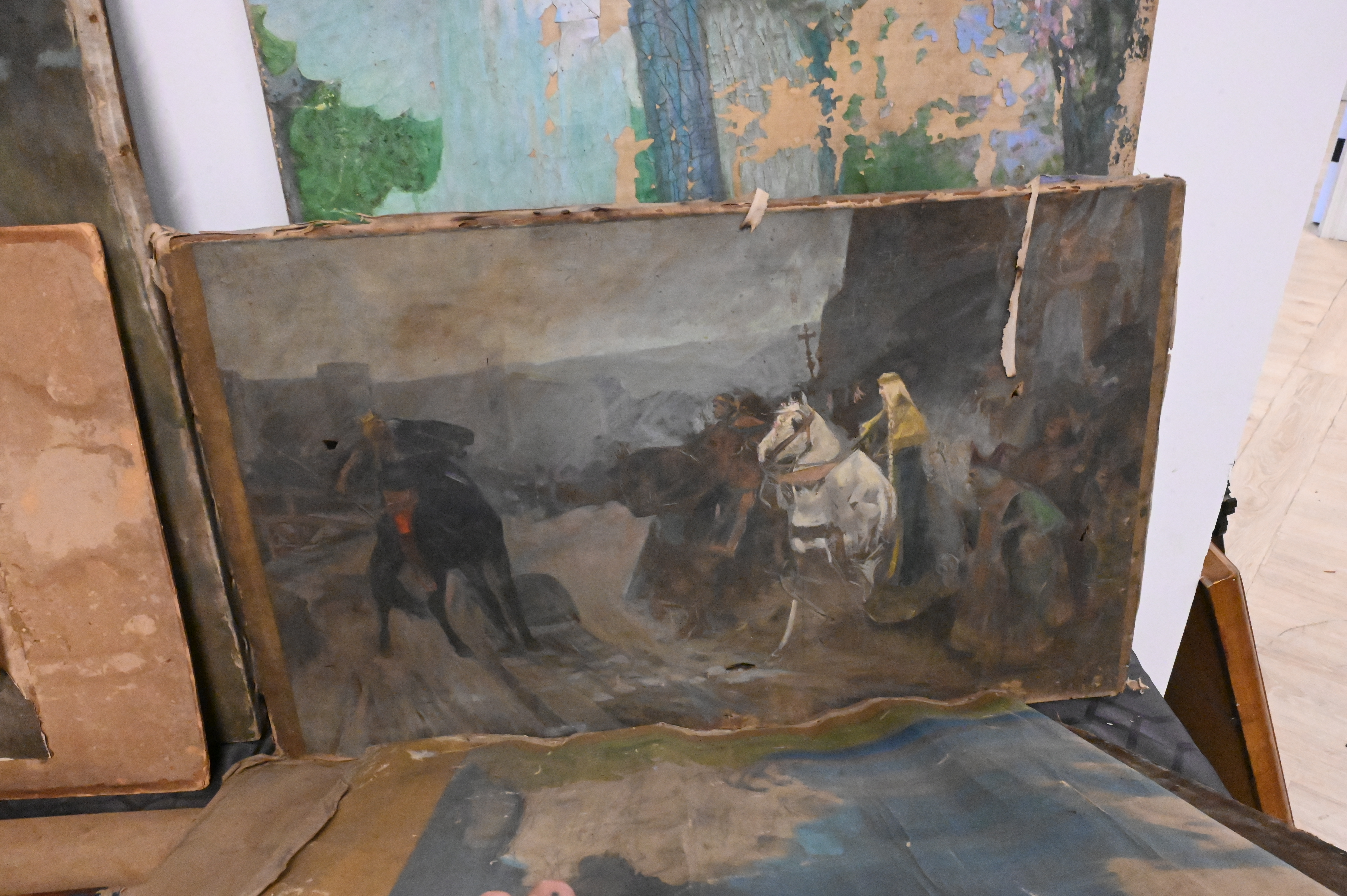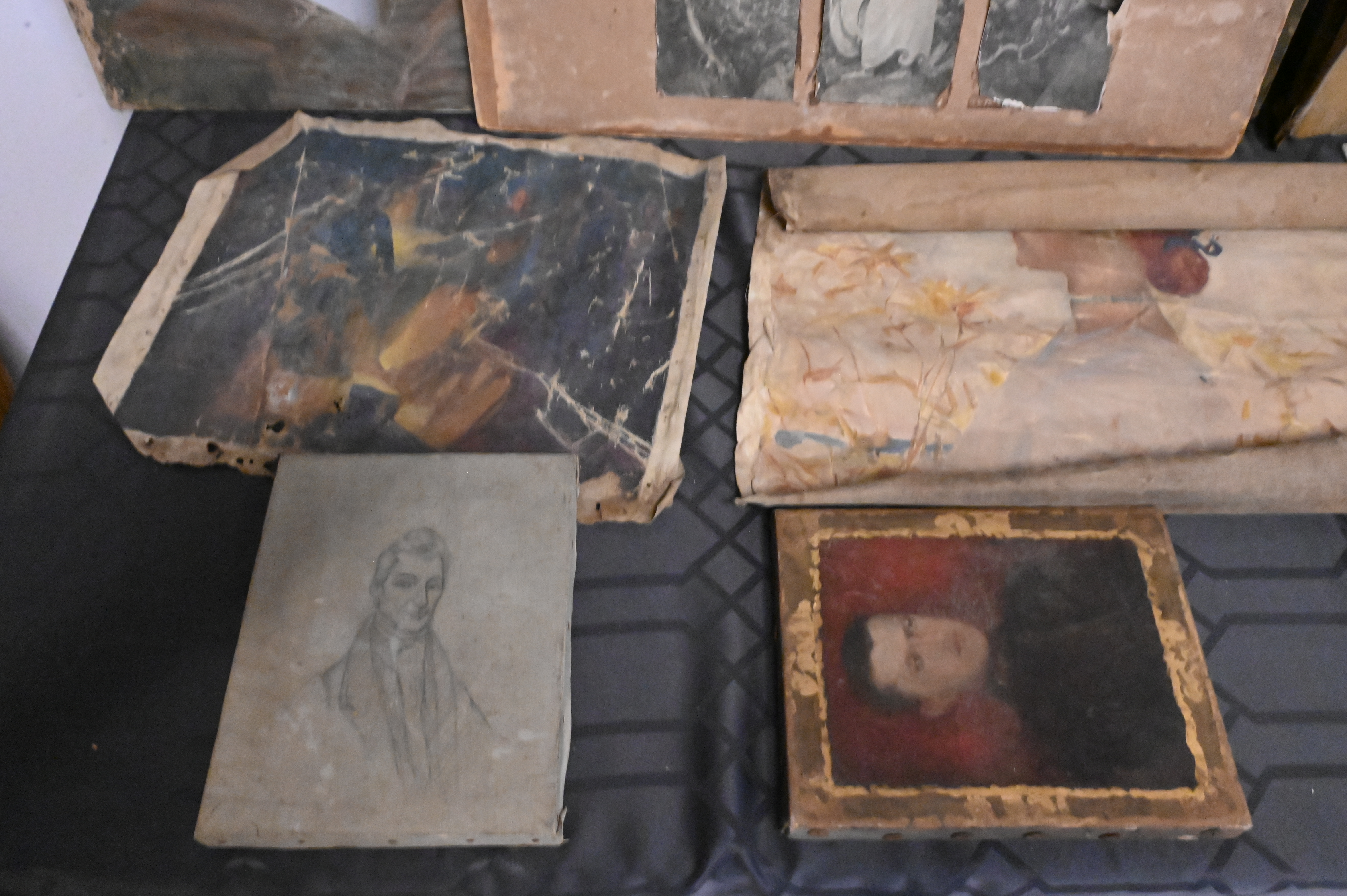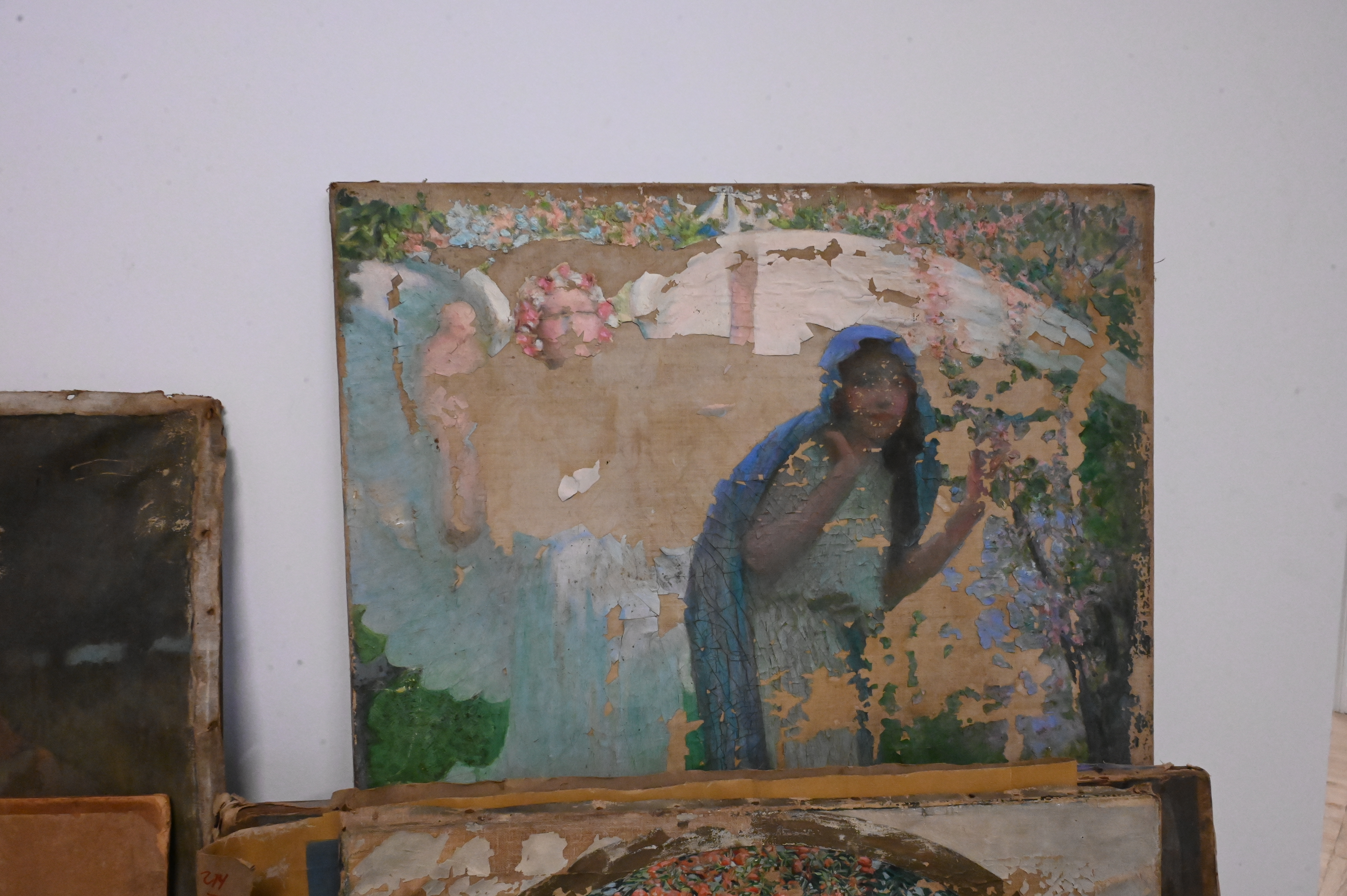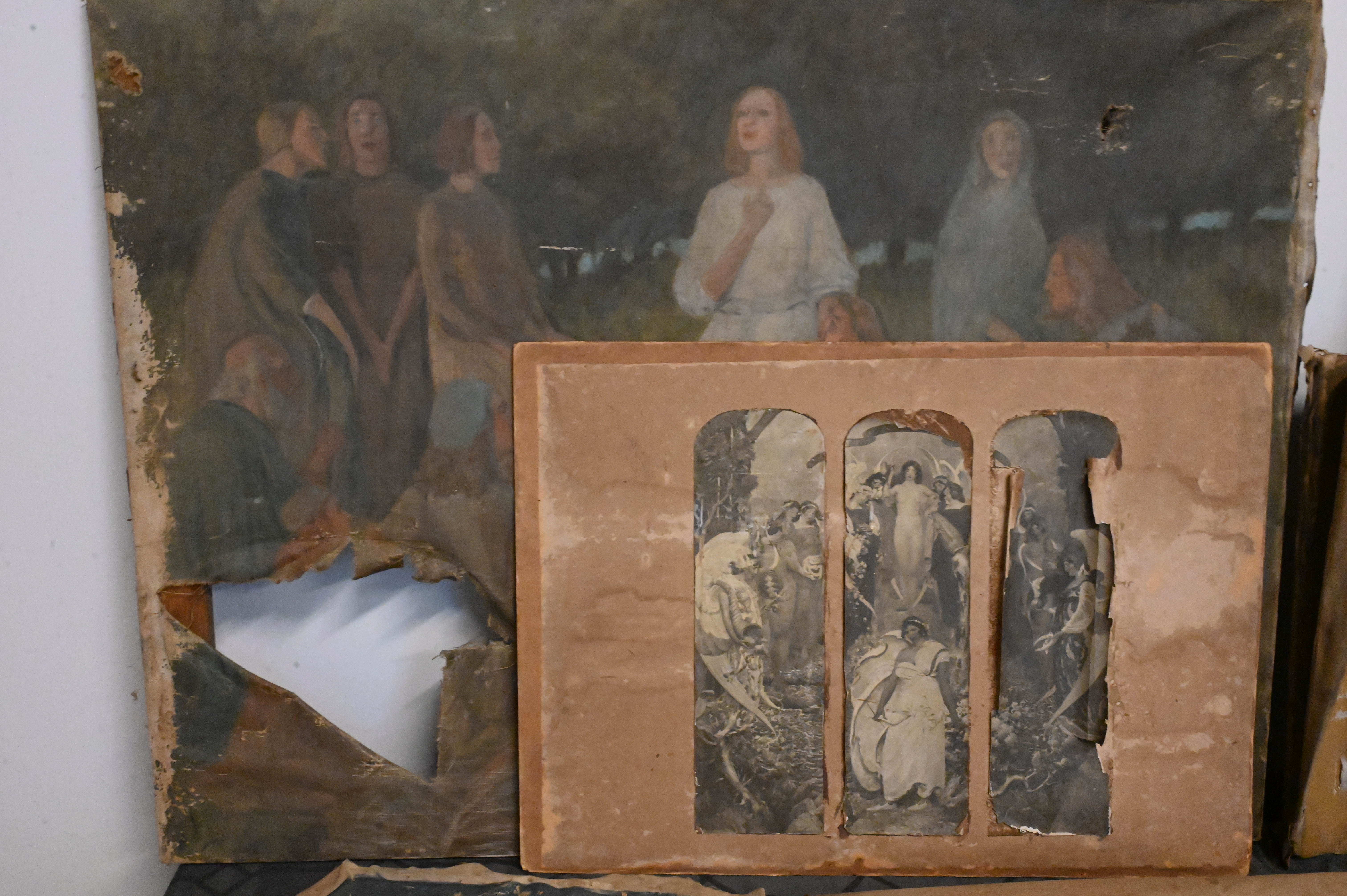 to include study for the 1915 Panama-Pacific Exposition, study of the pioneer spirit in America, the march of civilization from the Atlantic to the Pacific, possible religious studies of Christ and the disciples, medieval scene with king, princess and knights on horseback, scene of a cloaked woman standing before an angel possibly the Annunciation, side profile of a young woman, dog sketch etc…