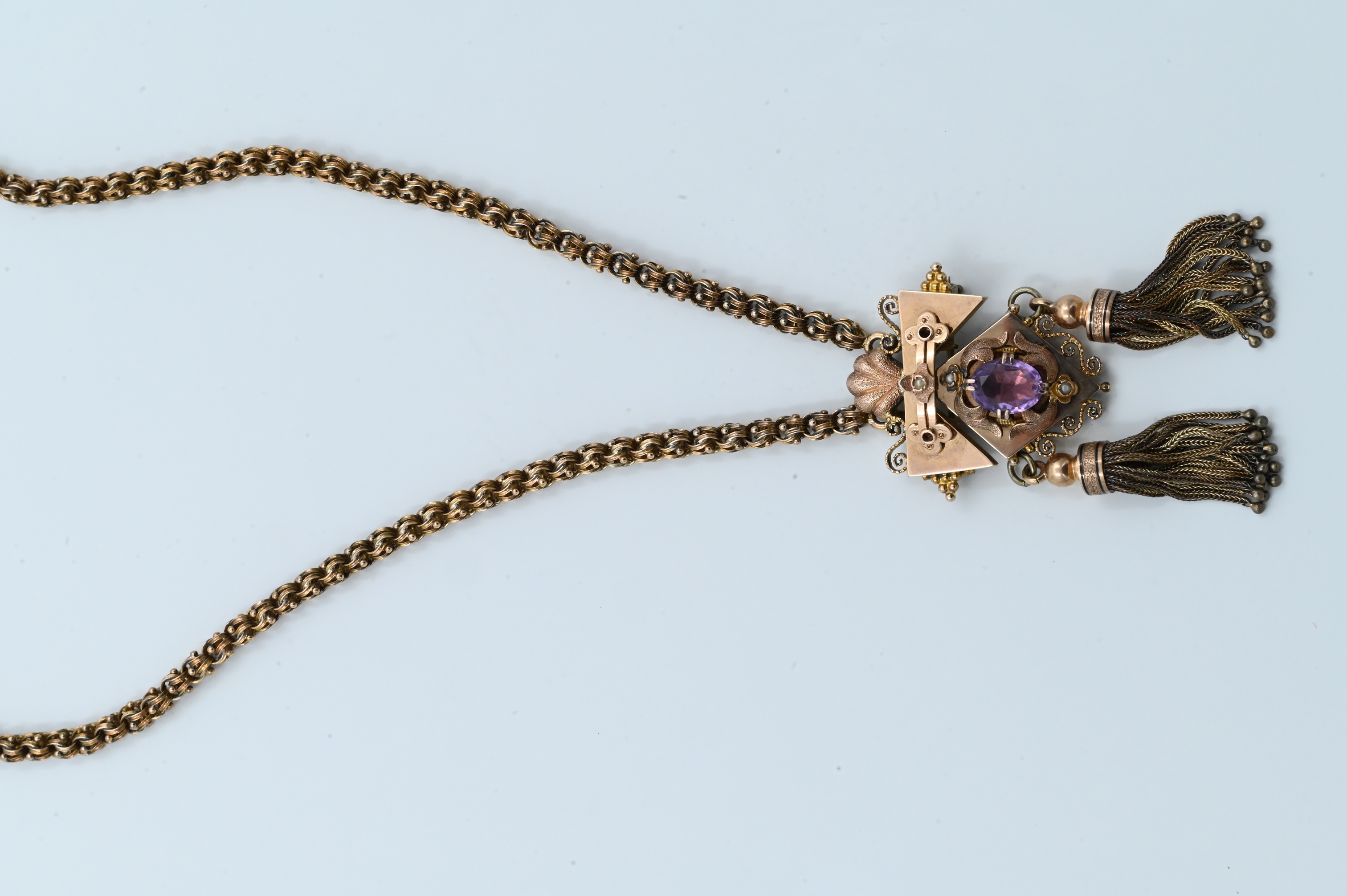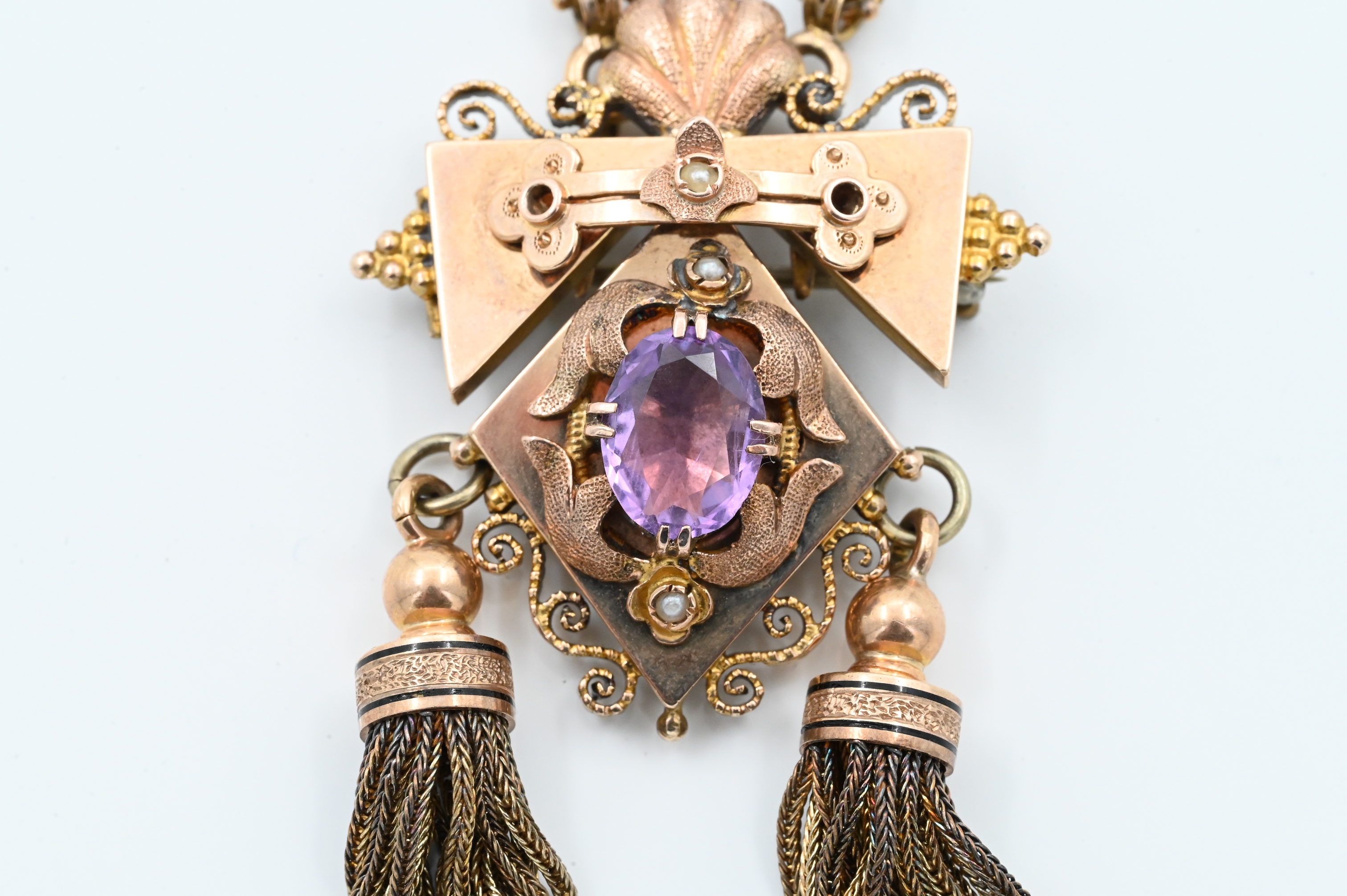 mounted with pendant / brooch having amethyst, small pearls, and tassels, length 19 inches, total weight 39.8 grams