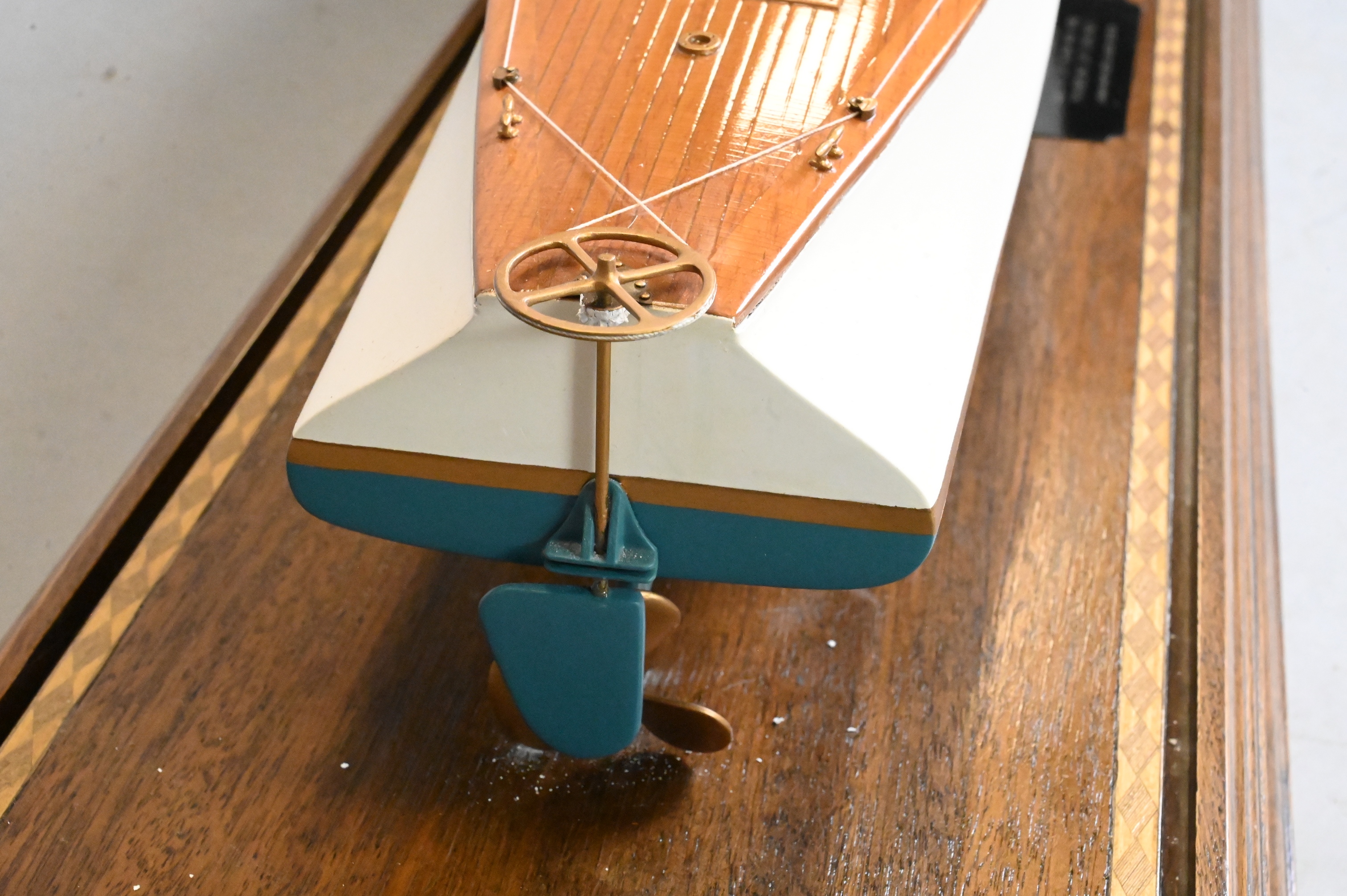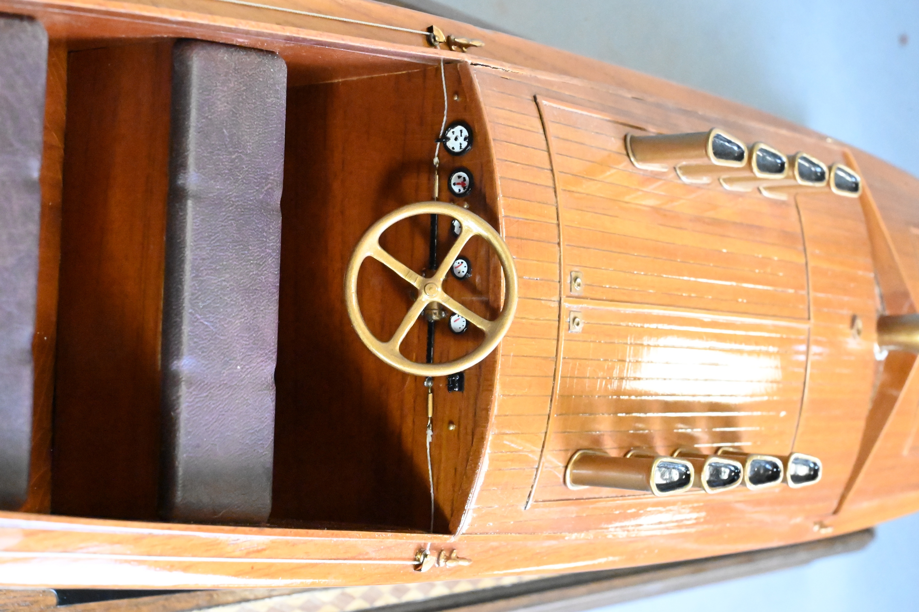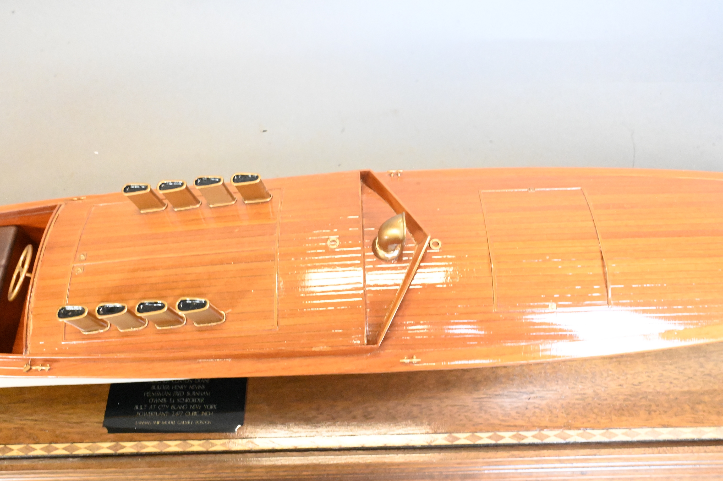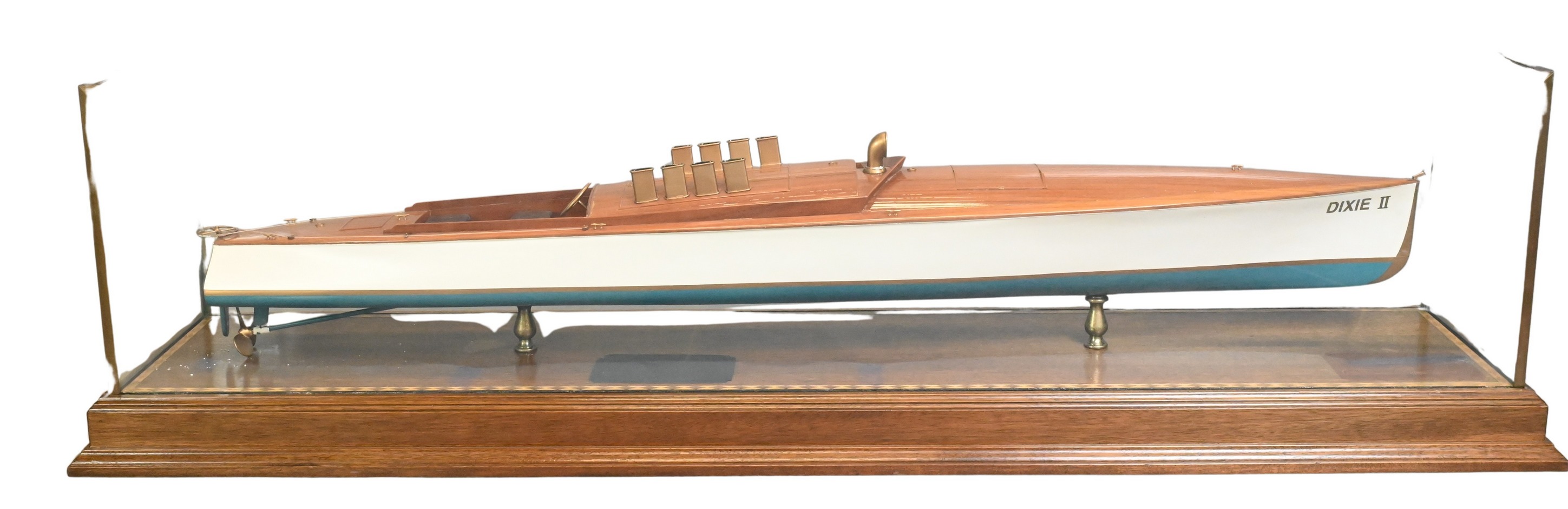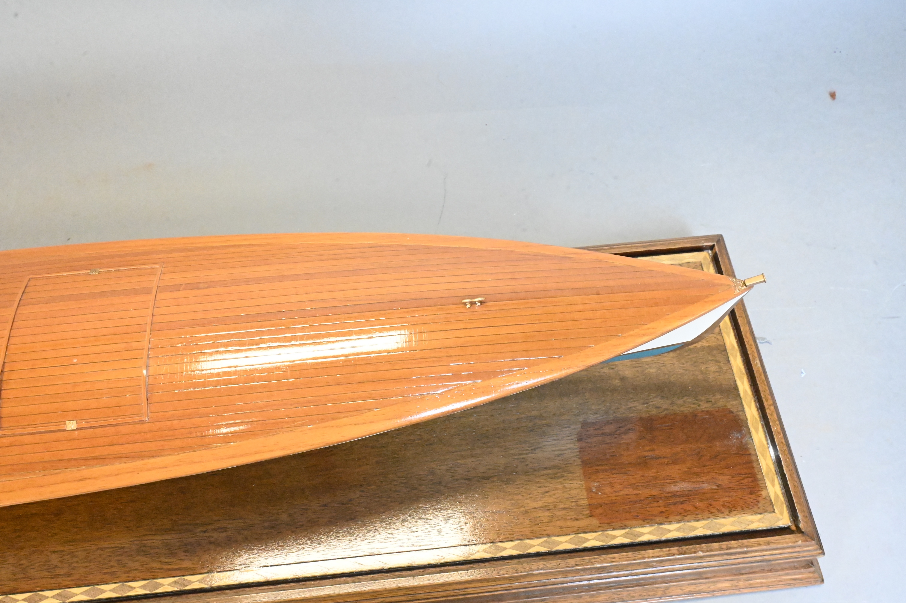 polished mahogany wood deck having painted white and blue hull, Planked hull. Fitted with exhaust cowls, controls, cleats, steering wheel, benches, ventilator cowl now lacking flagstaff and flag, mounted on brass supports within a glass display case and wooden base