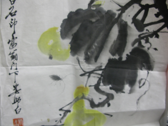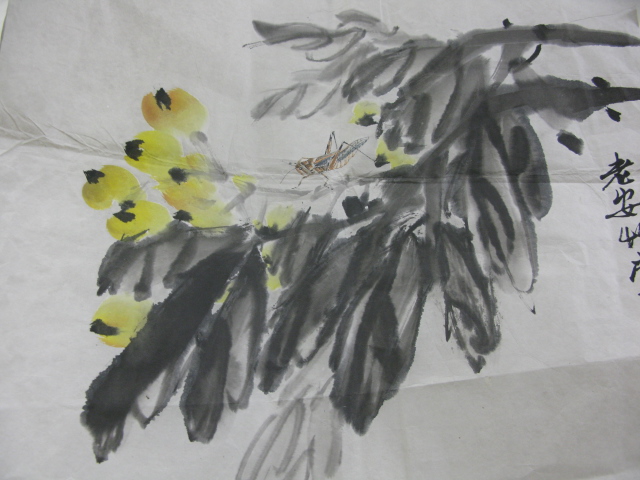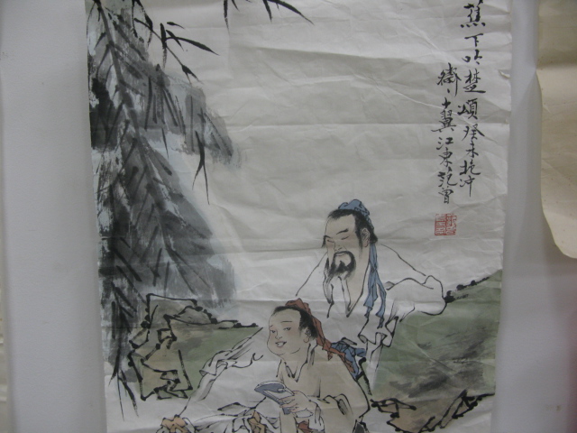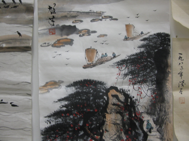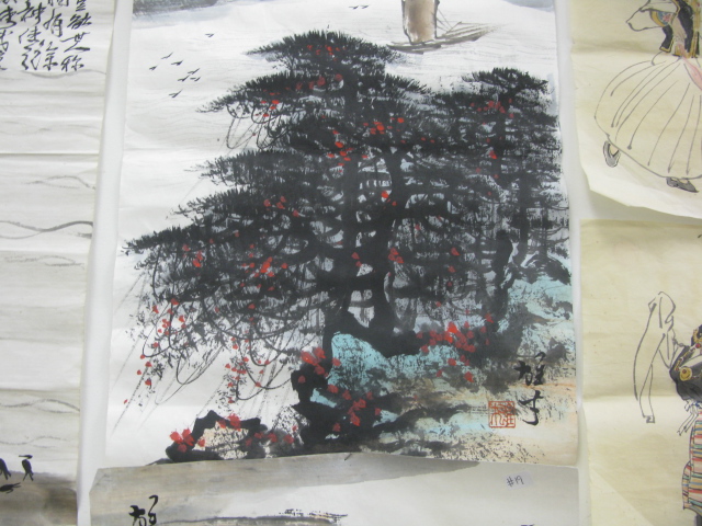 Group of six Oriental paintings three landscapes, two blossoming trees and one having two figures.
