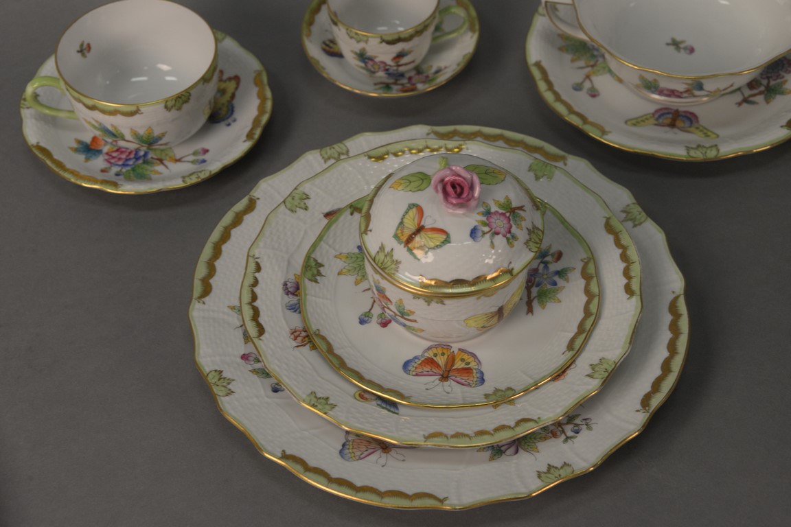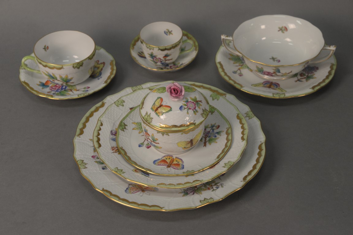 Herend Queen Victoria dinnerware set, 160 total pieces including 28 plates, 20 luncheon plates, 14 bouillon cups and saucers, 14 coffee cups and saucers, 14 tea cups, and saucers, 14 covered cups and saucers one covered cup is of smaller size.