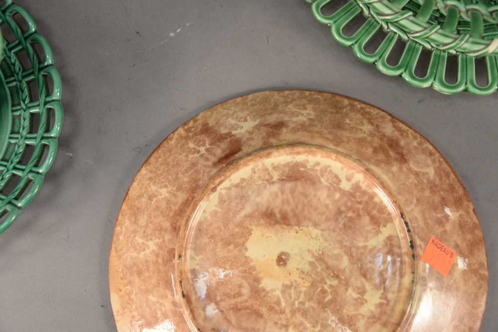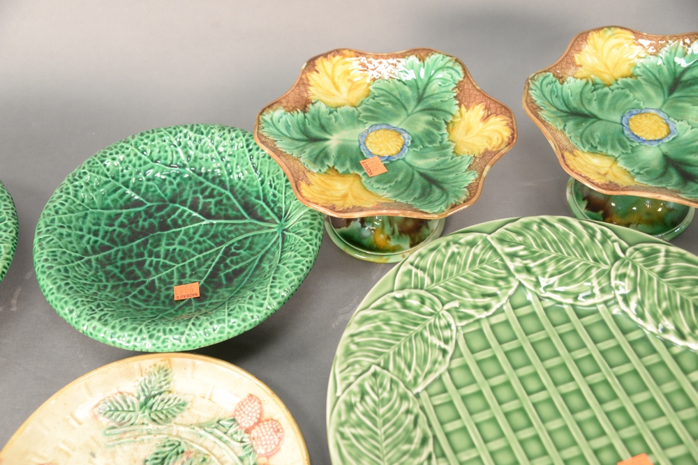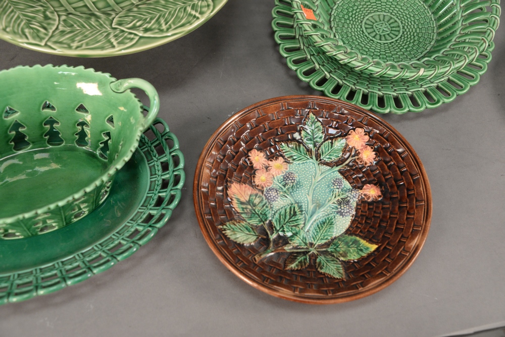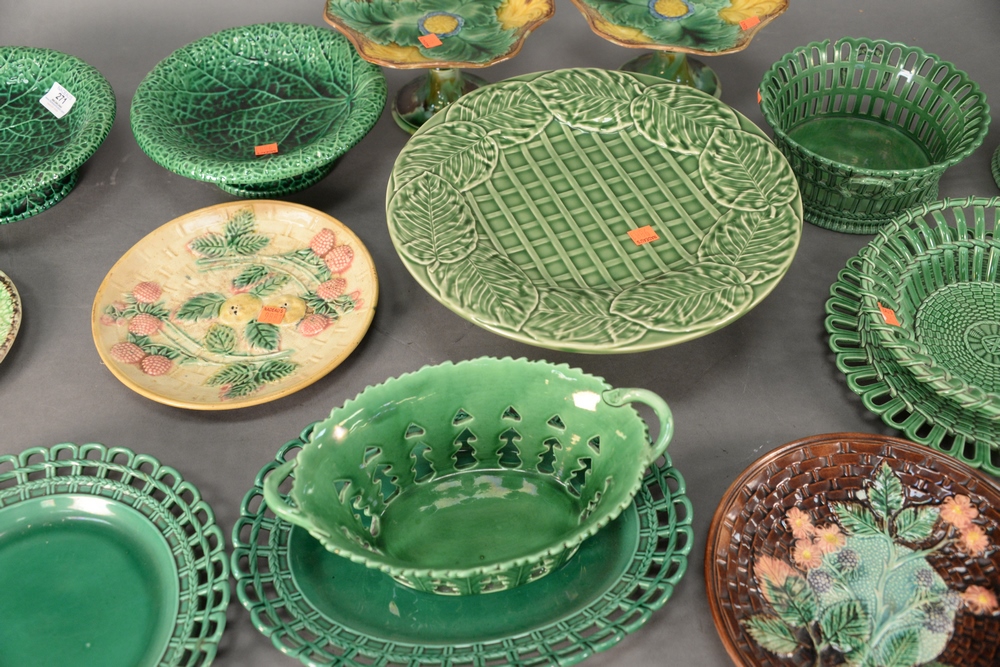 Large Lot of Majolica, to include a pair of Wedgwood compotes, eight green reticulated baskets and plates, a pair of green cabbage leaf compotes, four brown glazed plates, compote height 4 inches, diameter 13 inches.