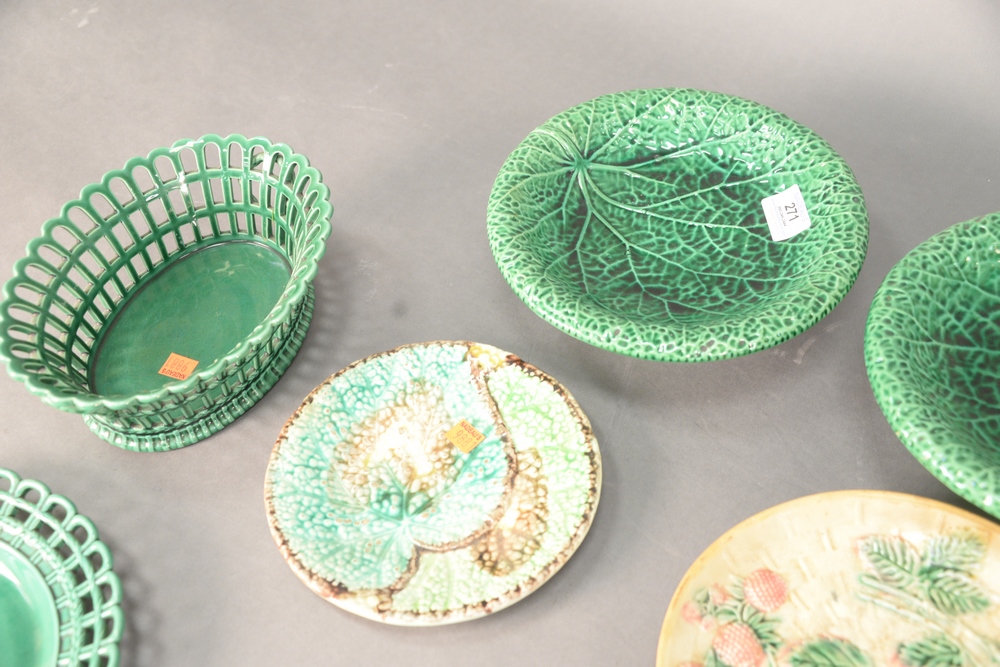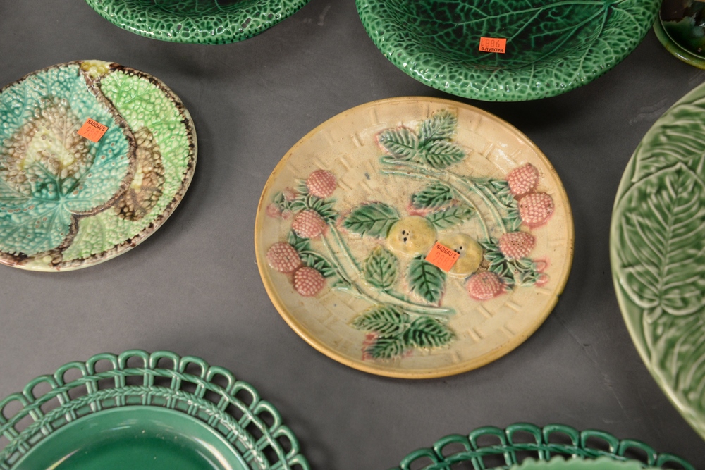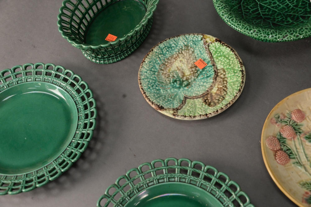 Lot 271: Large Lot of Majolica, to include a pair of Wedgwood compotes, eight green reticulated baskets and plates, a pair of green cabbage l…