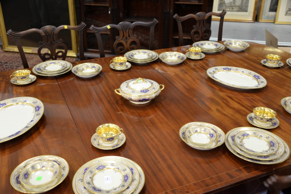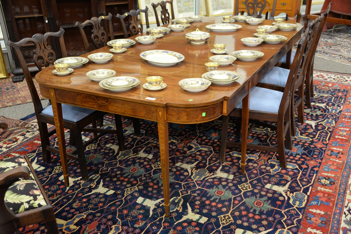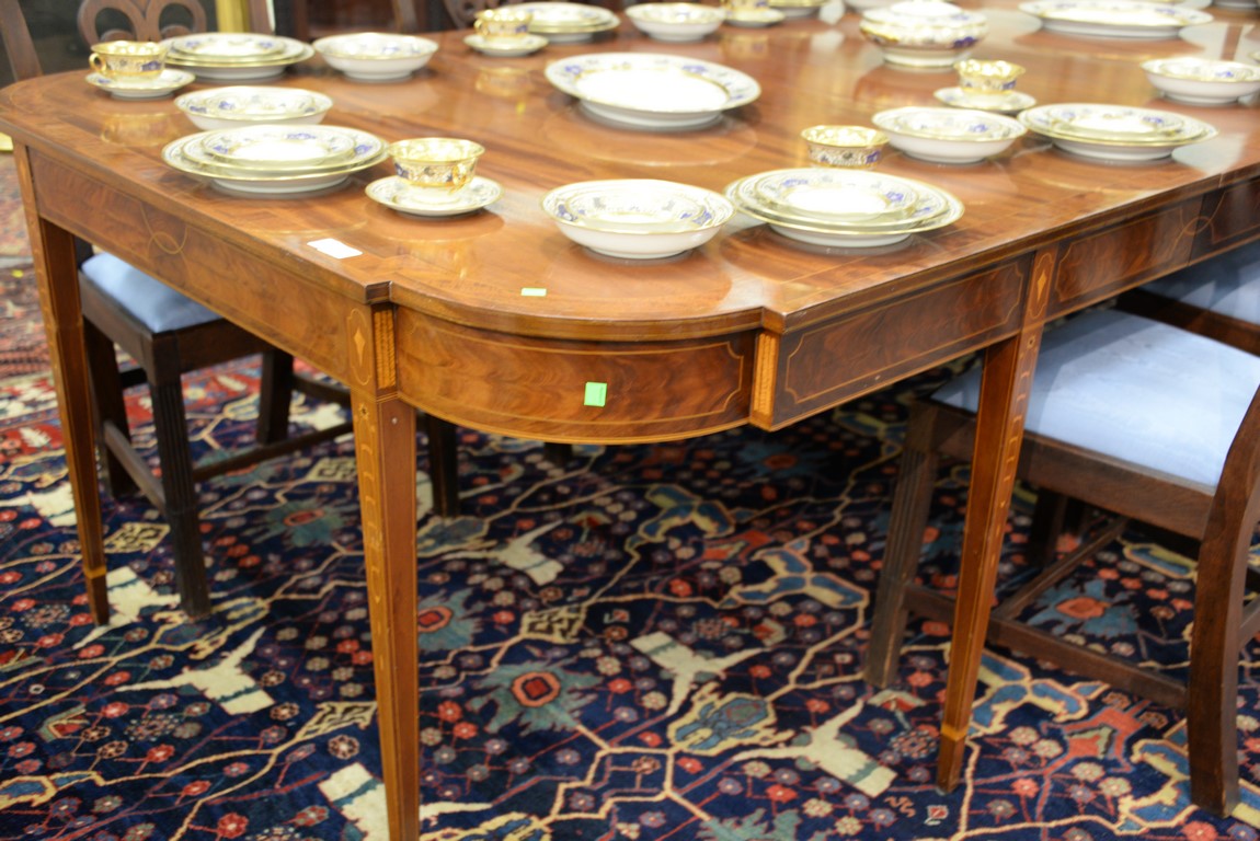 Lot 271: Margolis mahogany dining table having banded inlaid top with D shaped ends on conforming frieze, all on bookend panel and ring inlai…