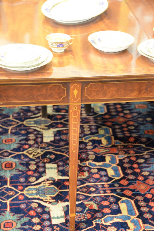Margolis mahogany dining table having banded inlaid top with D shaped ends on conforming frieze, all on bookend panel and ring inlaid square tapered legs and center drop down legs, along with three 24 inch leaves and pads. ht. 30in. top closed: 54 1/2 x 82 top open: 54 1/2 x 154