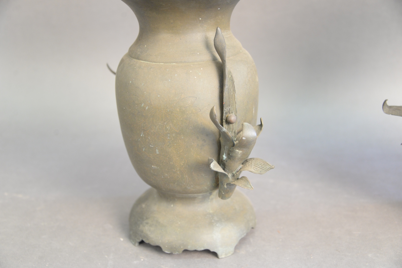 Pair of Bronze Asian Urns having floral handles with overall incised flower decoration, height 12 inches, diameter 9 1/2 inches, (hole under one handle).