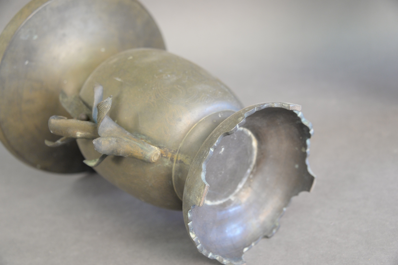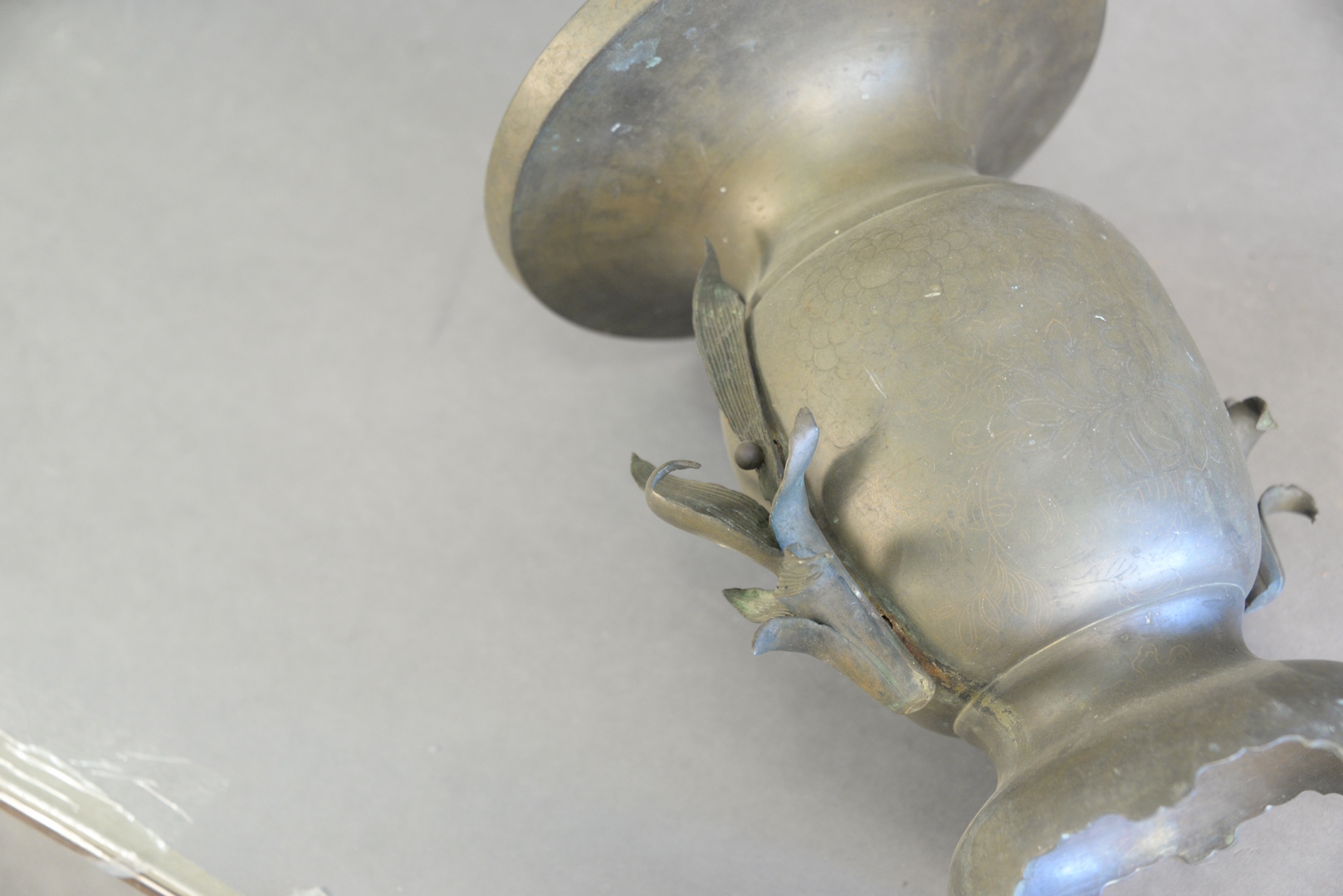 Lot 271: Pair of Bronze Asian Urns having floral handles with overall incised flower decoration, height 12 inches, diameter 9 1/2 inches, (hole under one handle).