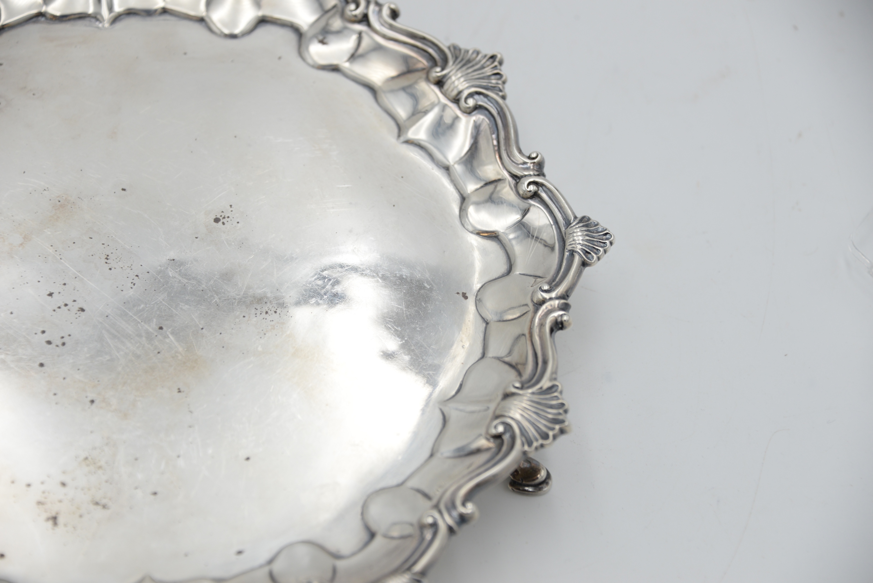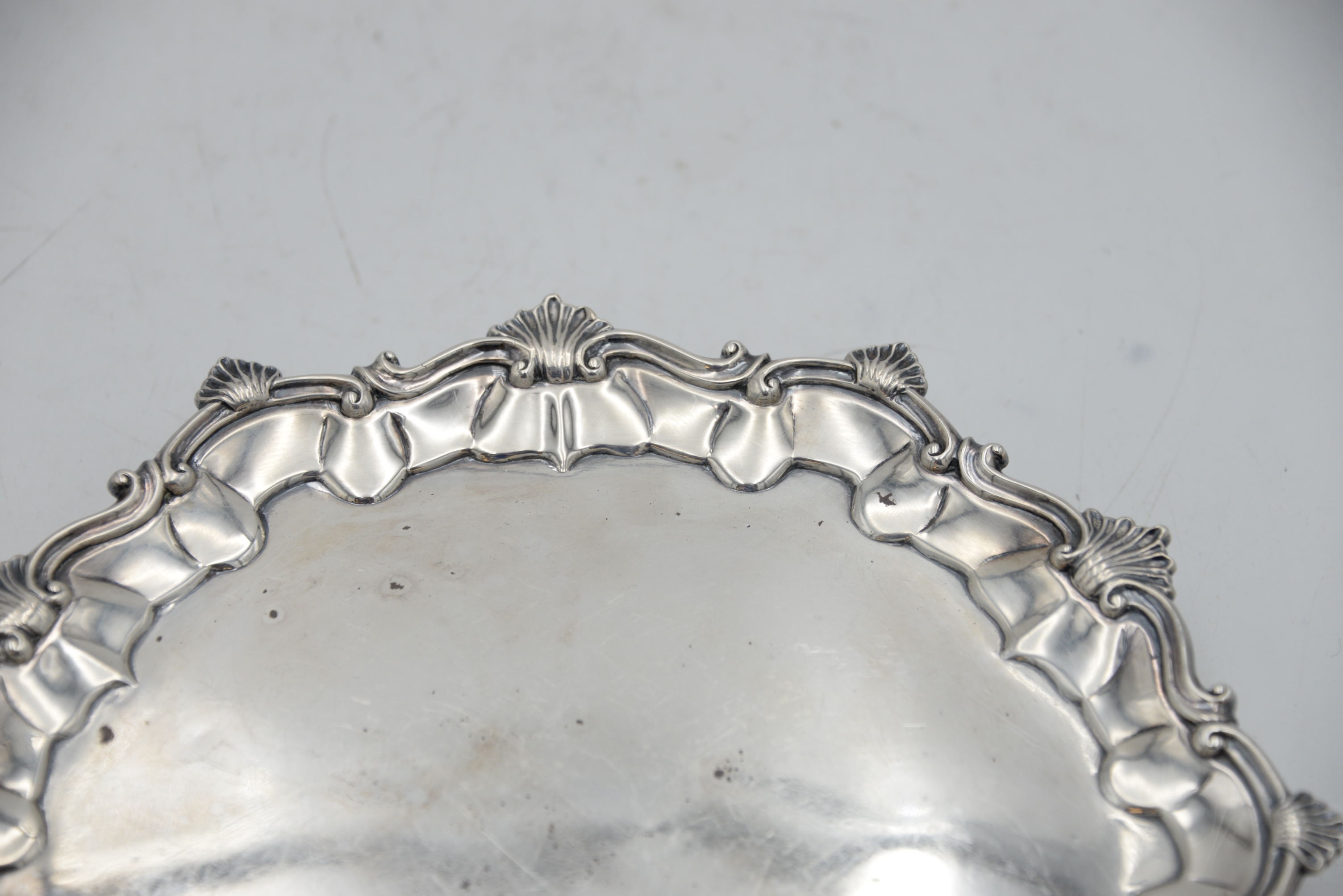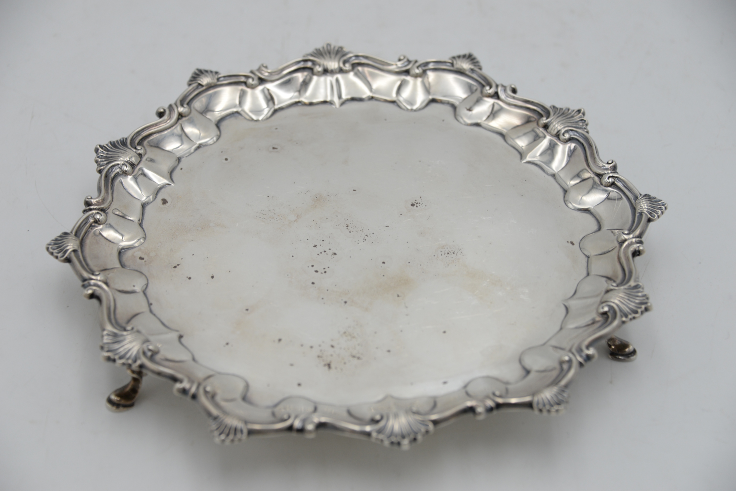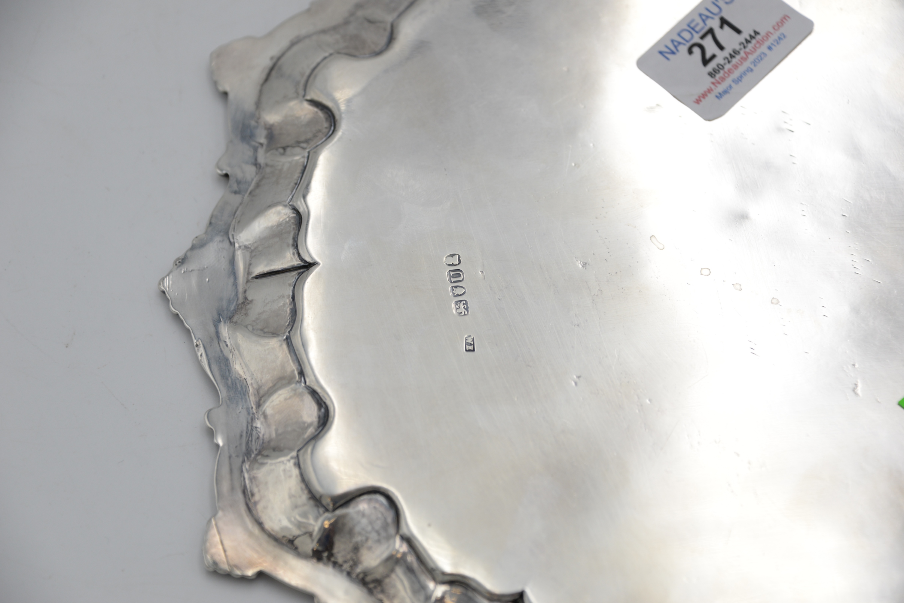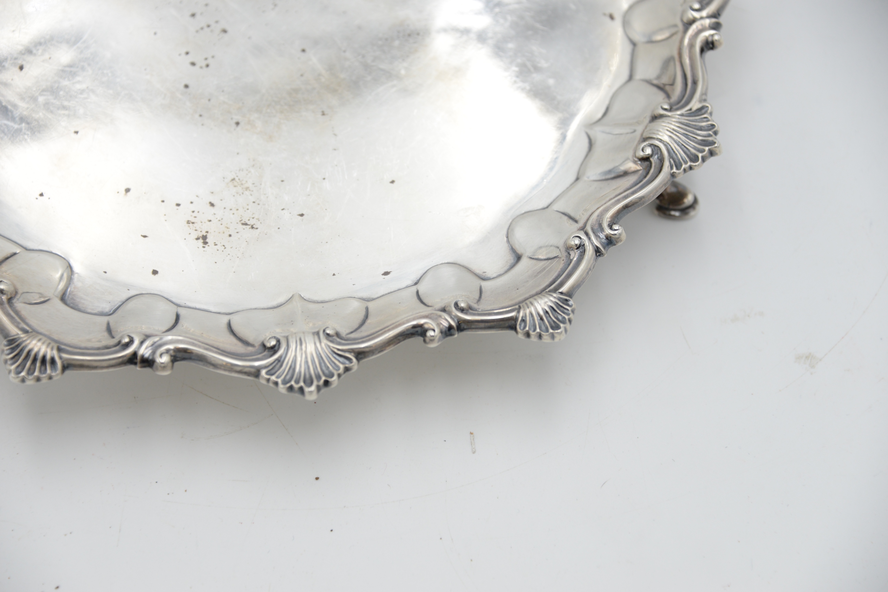 Silver Salver, having shell and scalloped edge on three feet, marked “W.E.” (William Eley), 1786 – 1787, diameter 10 1/2 inches, 17.8 t.oz.