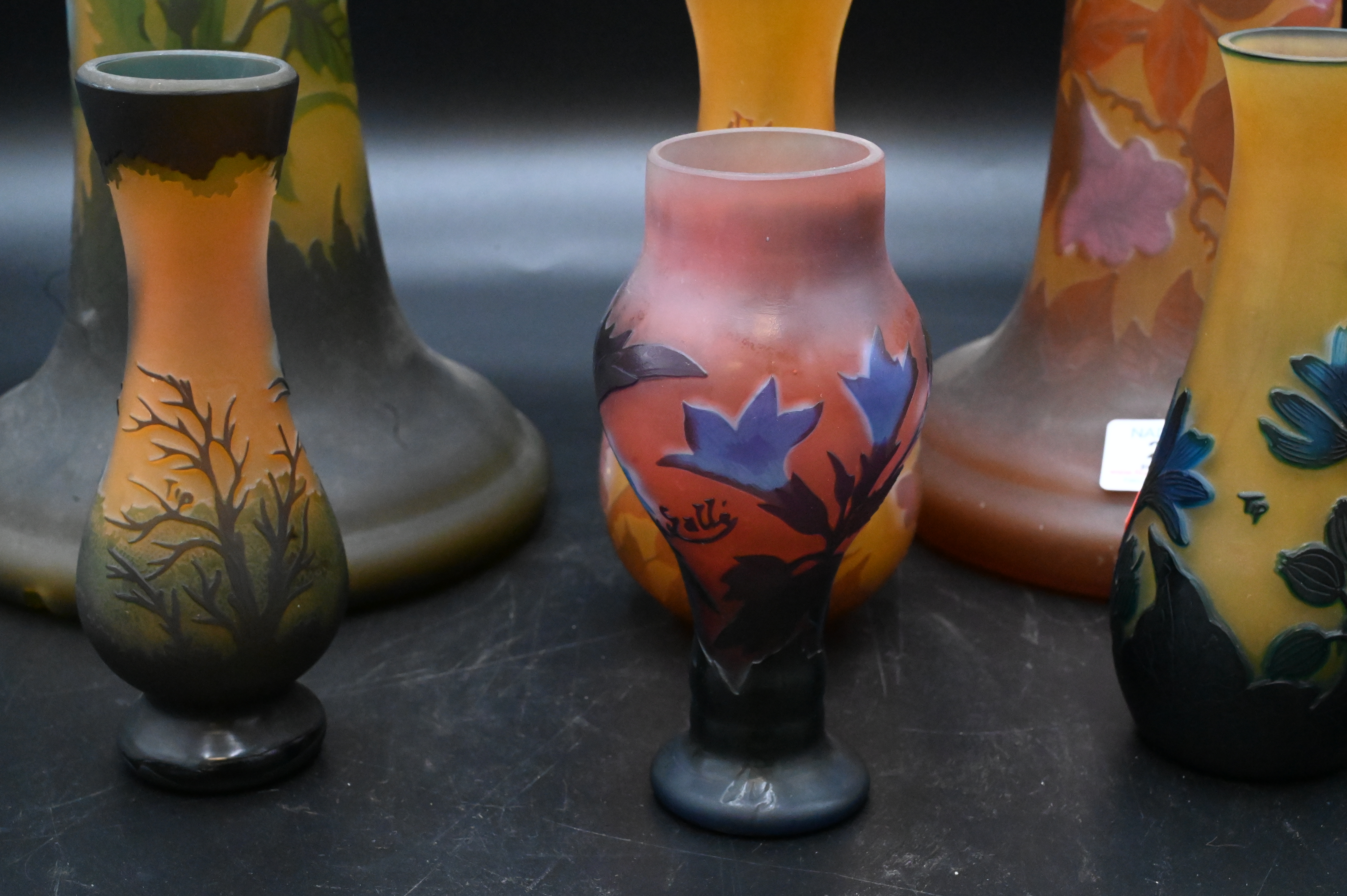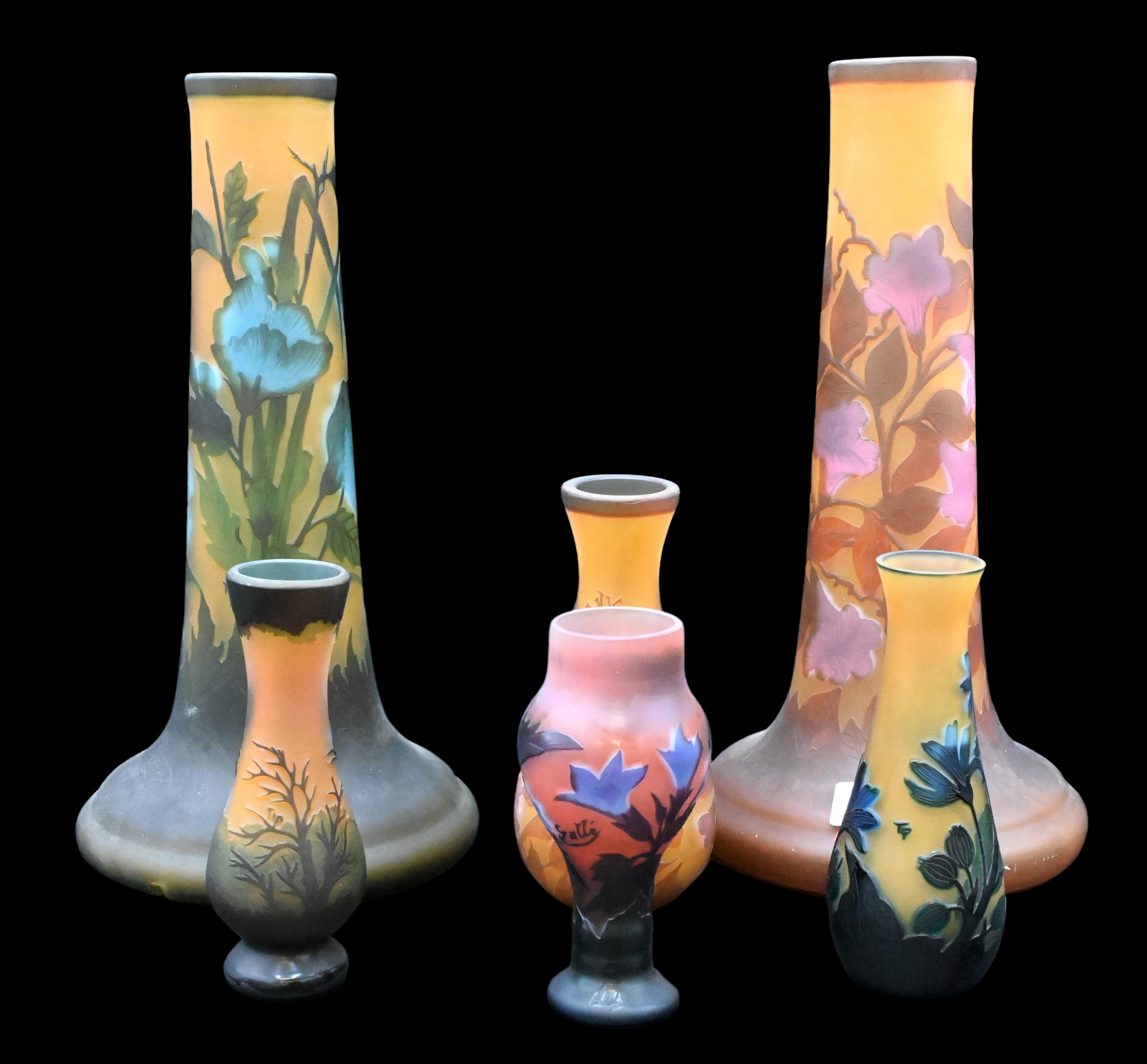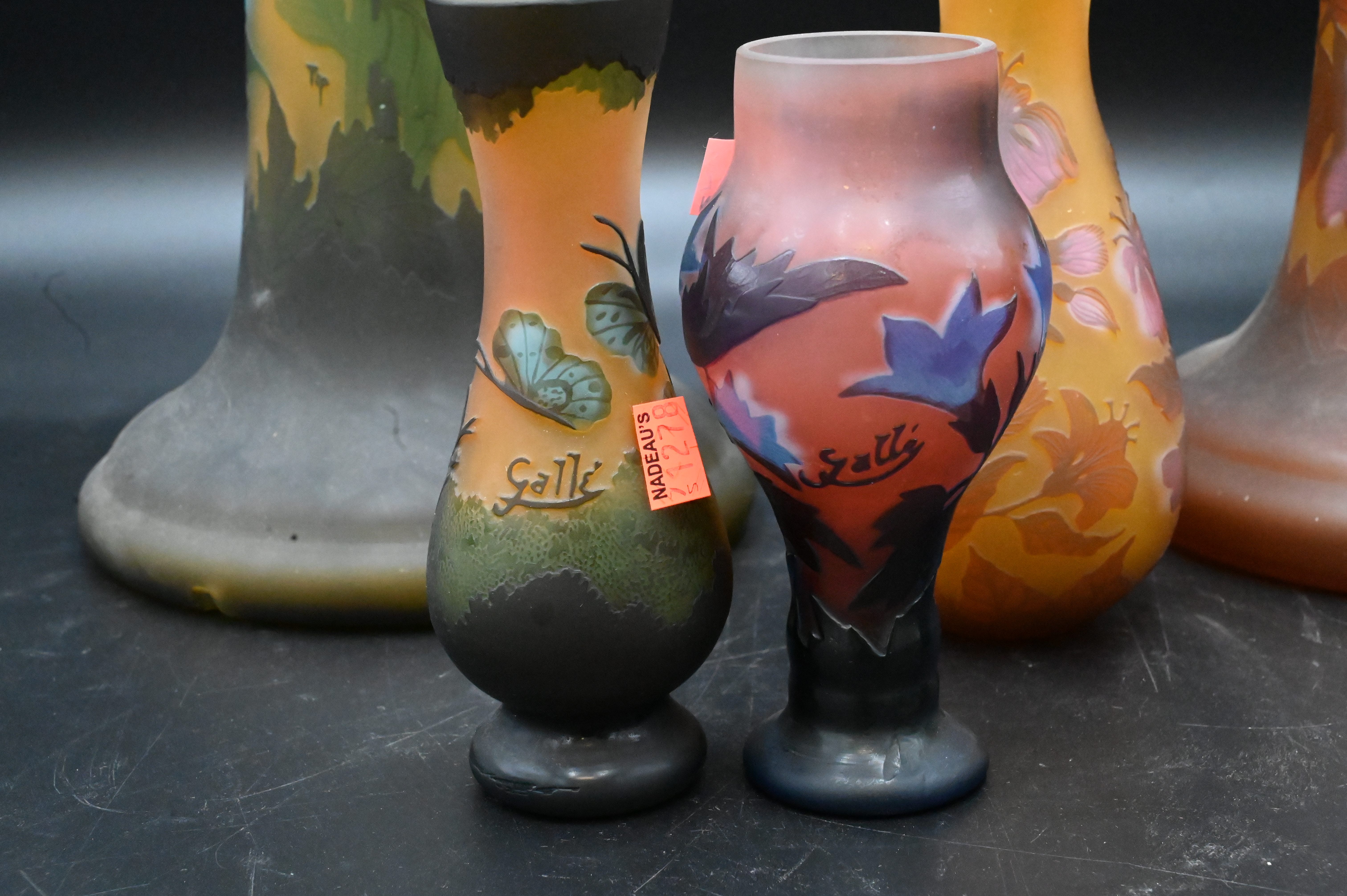 Six Galle Style Cameo Glass Vases, to include small vase, butterflies and flowers, tallest 7 1/8 inches. Provenance: Estate of Peter Tillou, Litchfield, Connecticut.