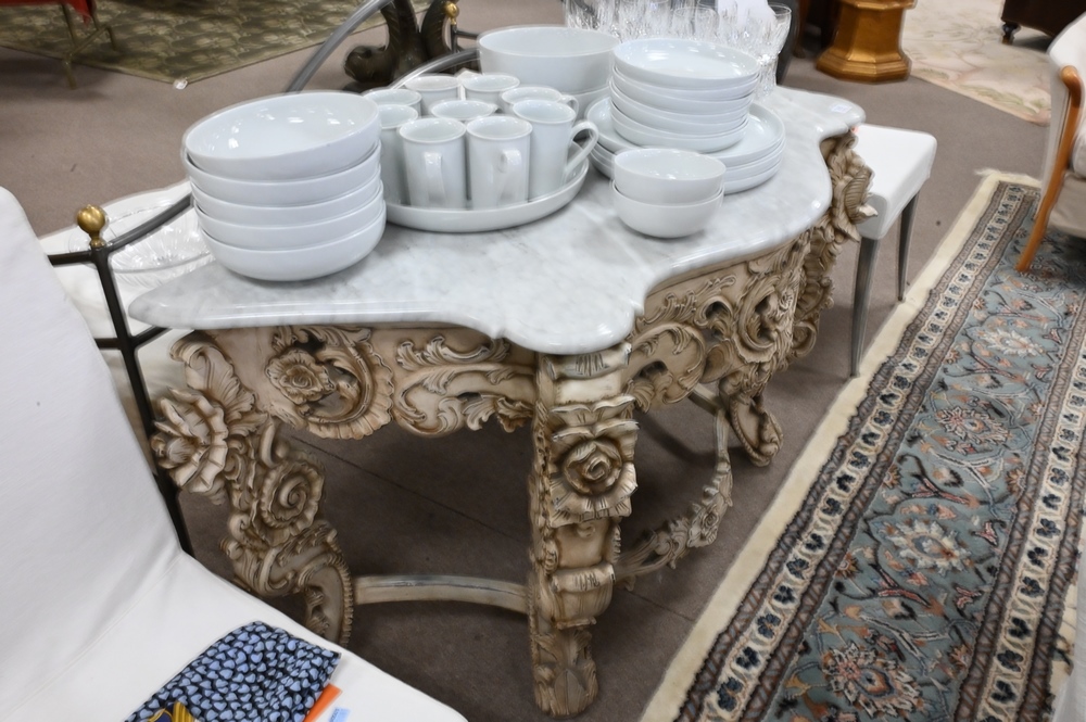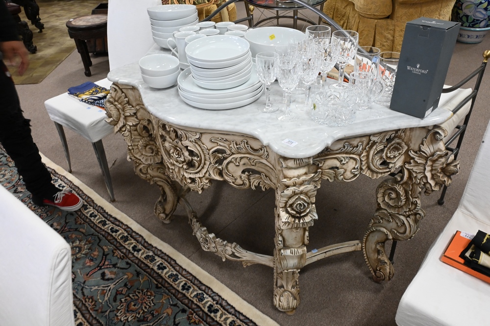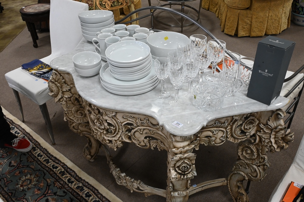 Contemporary Marble Top Console Table, height 30 1/2 inches, width 52 inches.