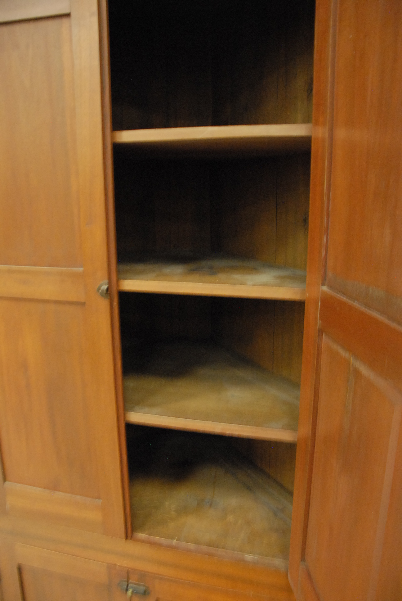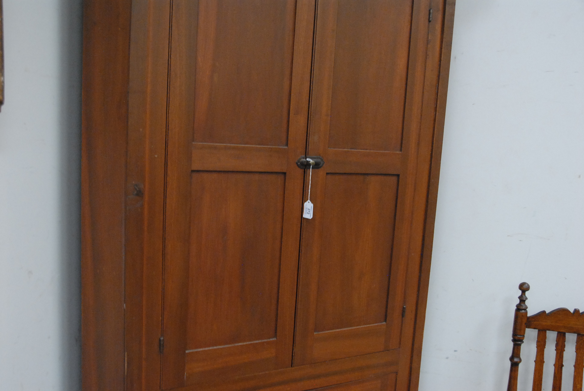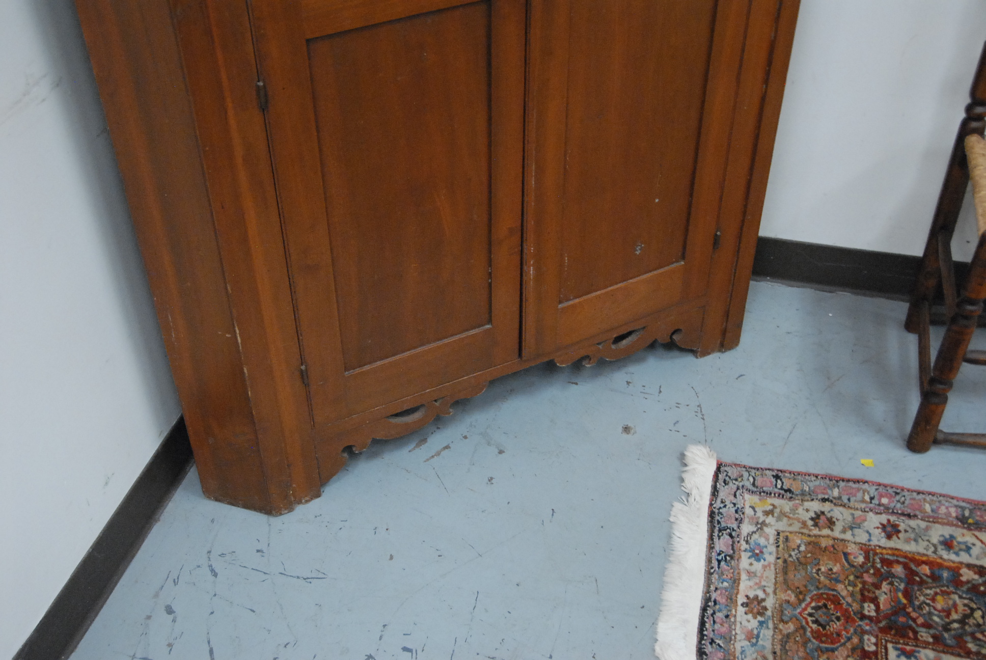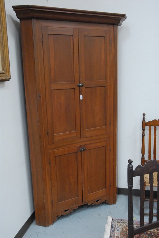 Lot 272: Corner cupboard in one piece with large cornice molding over two pair of blind doors with two scroll cut outs at base, 19th century. ht. 85in. wd. 44in. dp. 27in.