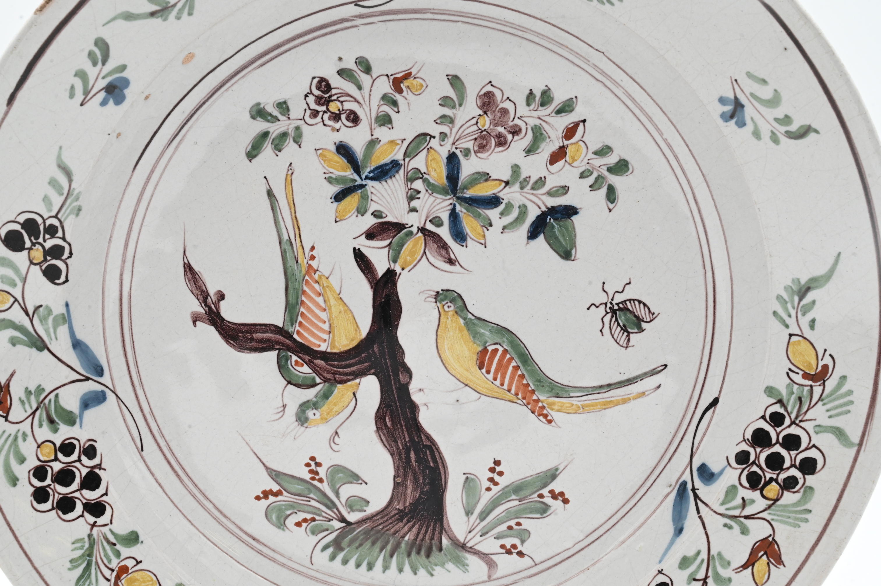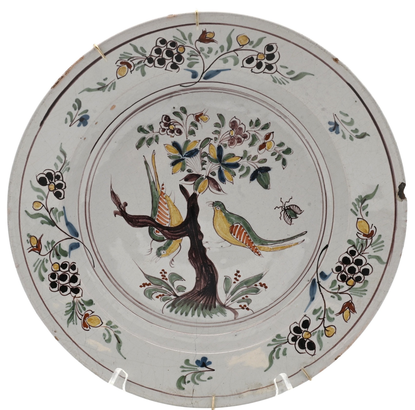 having central scene of birds perched on a tree amidst foliage, within a floral and berry-decorated border, in green, yellow, and blue tones, fitted with a wire hanger, chip to right rim
