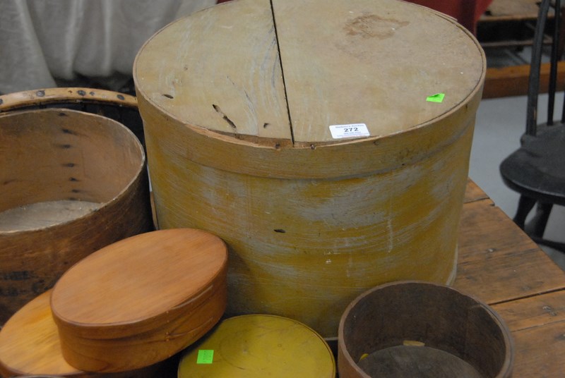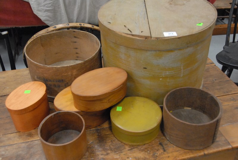 Eight piece lot of covered boxes including two oval Shaker style, dia. 5 1/2in. – 16 1/2in.