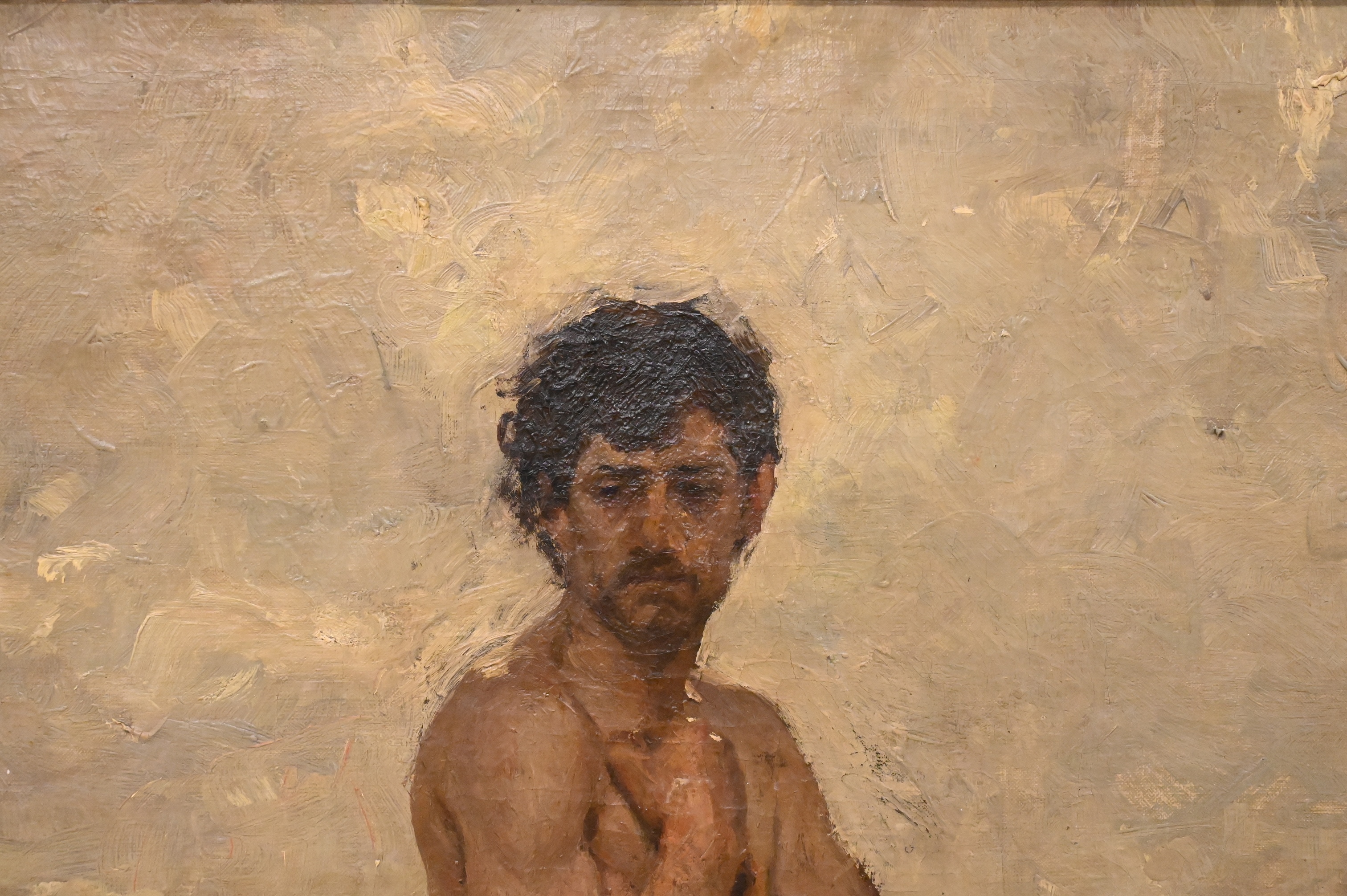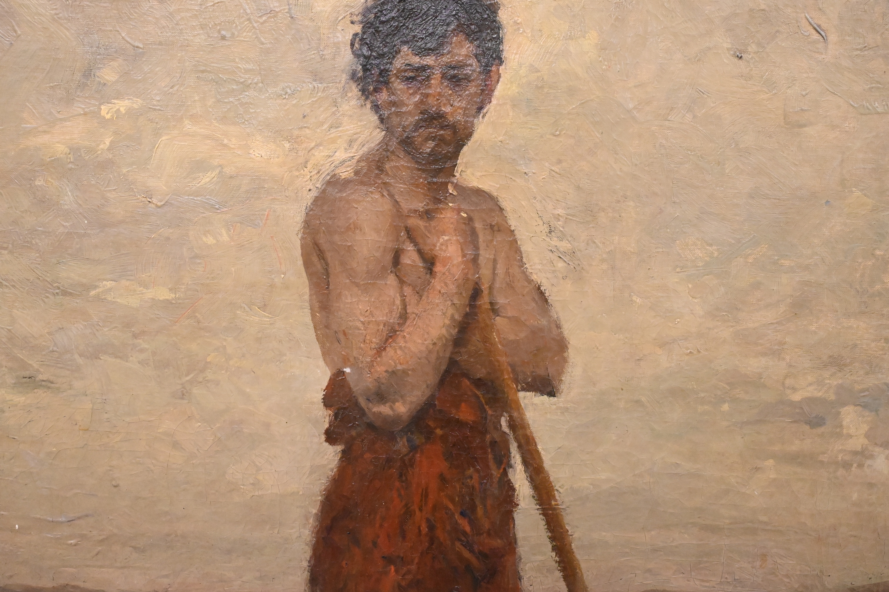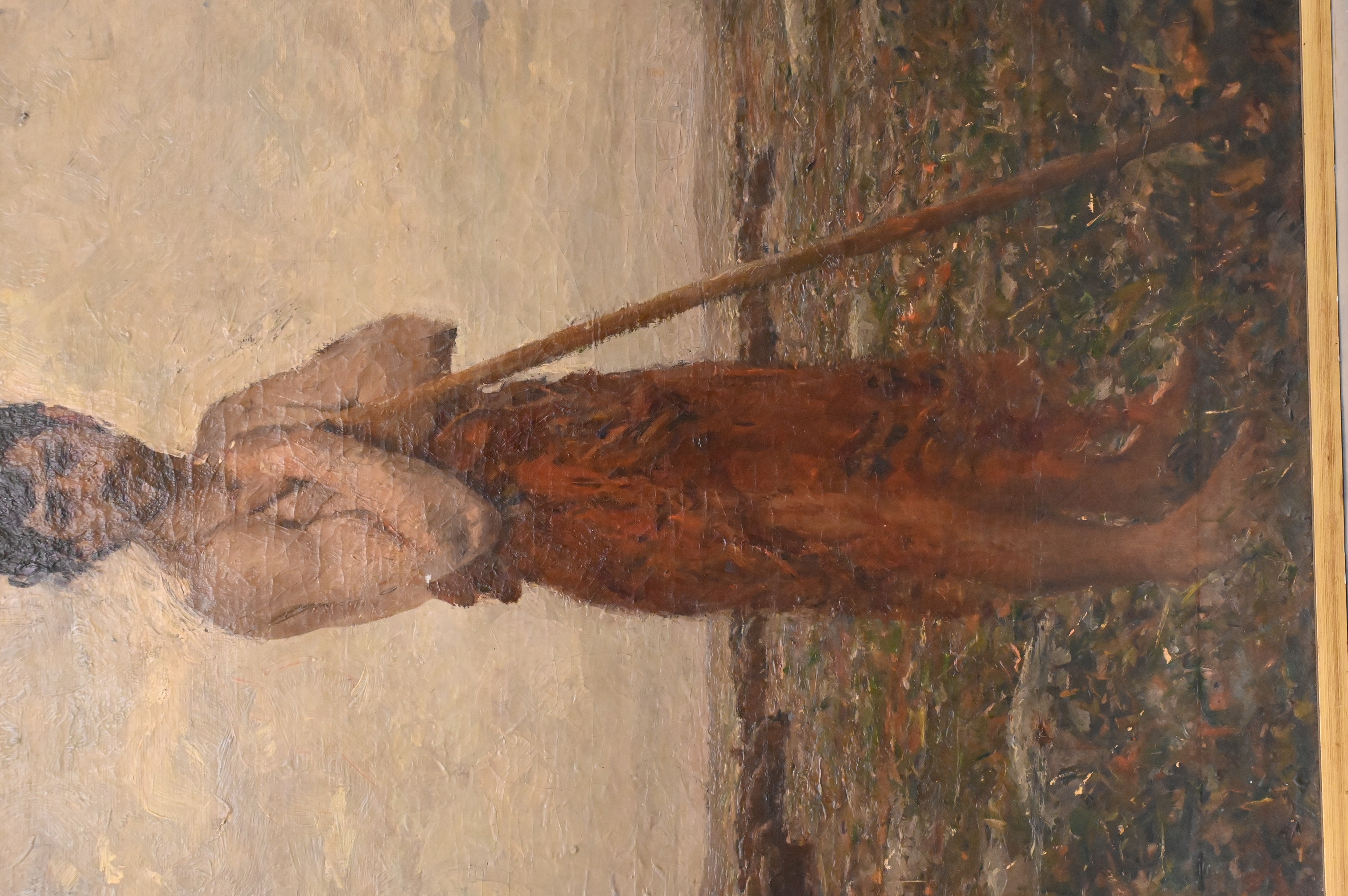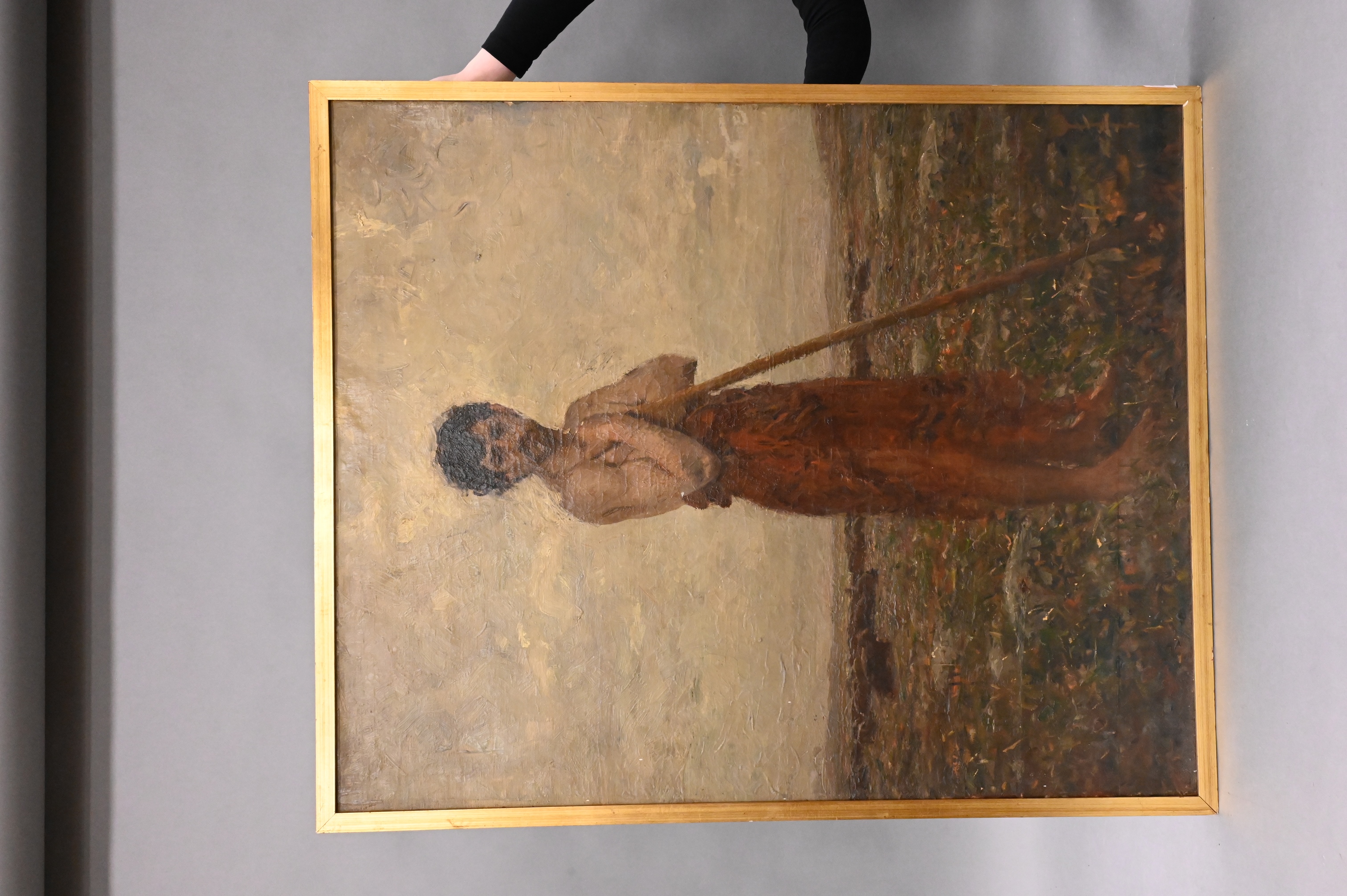 Leaning against his staff, wearing tattered clothes in a pastoral landscape, 1916