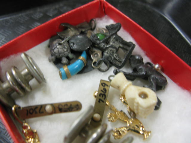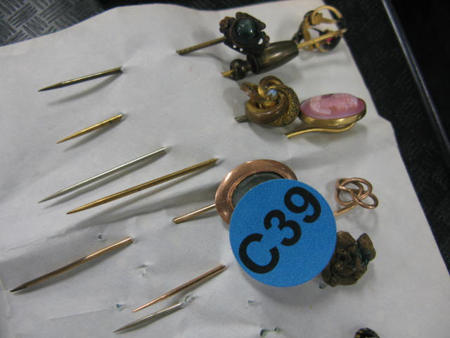 Group of hat pins, Victorian pen, silver flower pin, small cufflinks, etc