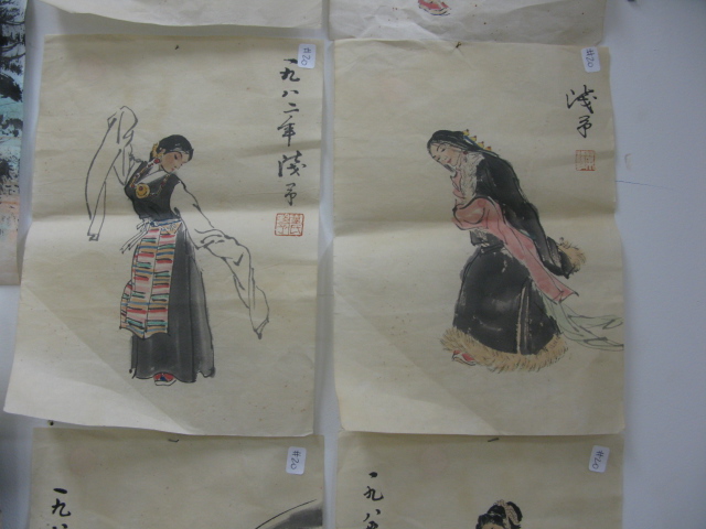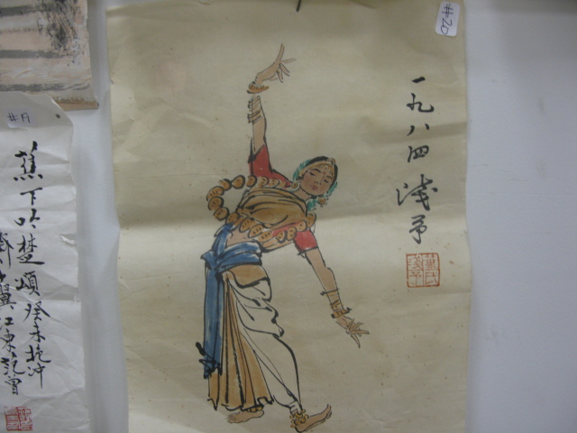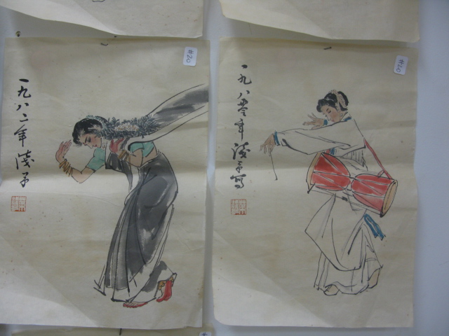 Group of seven small paintings on tissue each having dancing figures.