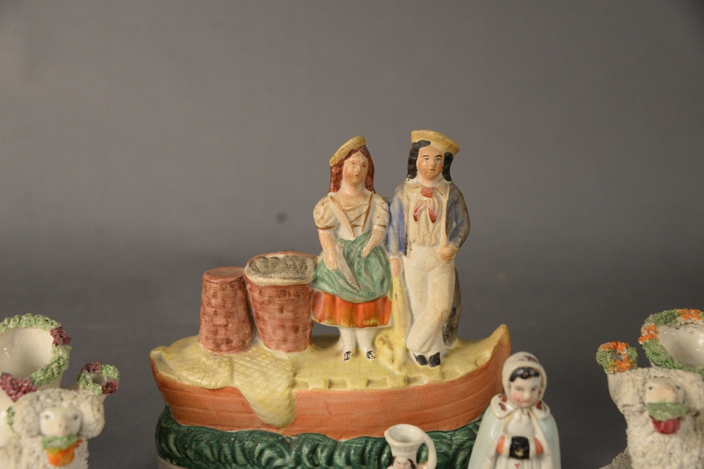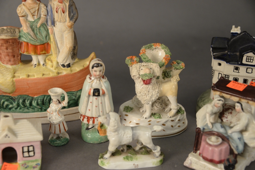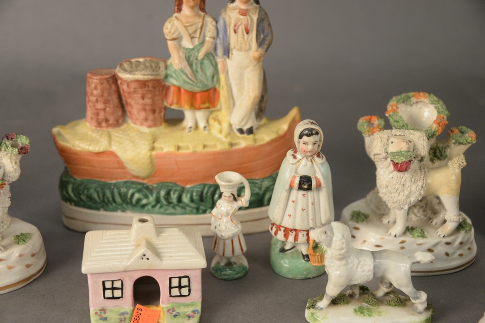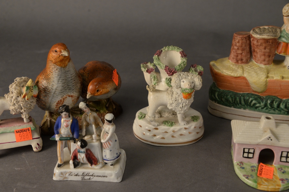 Lot 272: Group of Small Porcelain Figures, to include four Staffordshire dogs; two small houses; four figural groups; along with two English …